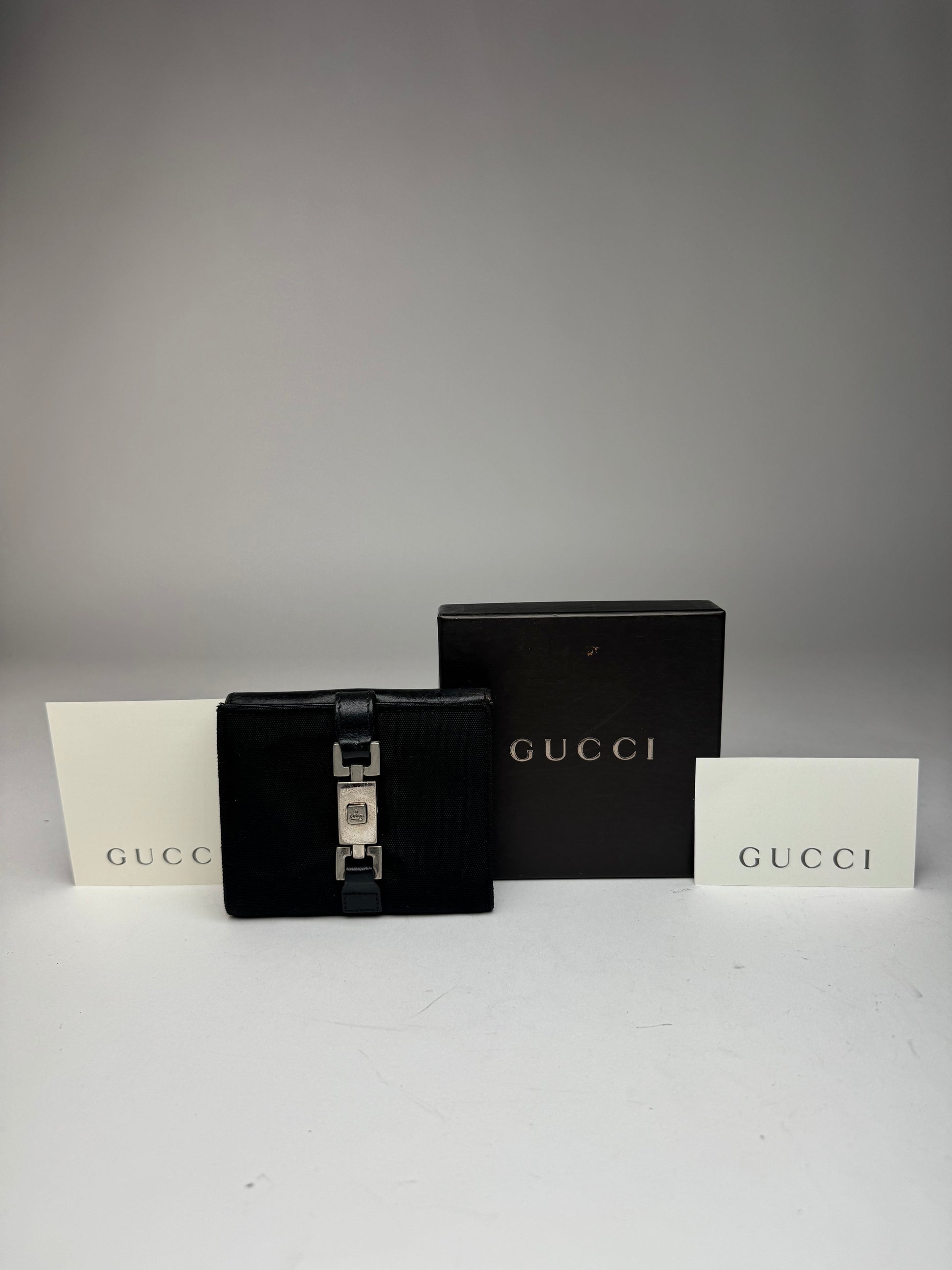This classic vintage wallet is finely crafted of black leather and polyester. Part of Gucci's iconic Jackie line, named after Jackie Kennedy in the 1960s, the design embodies timeless elegance and has remained one of the house's most celebrated styles. The interior is lined with black leather. The item comes with a Gucci box, booklet, and authenticity card.