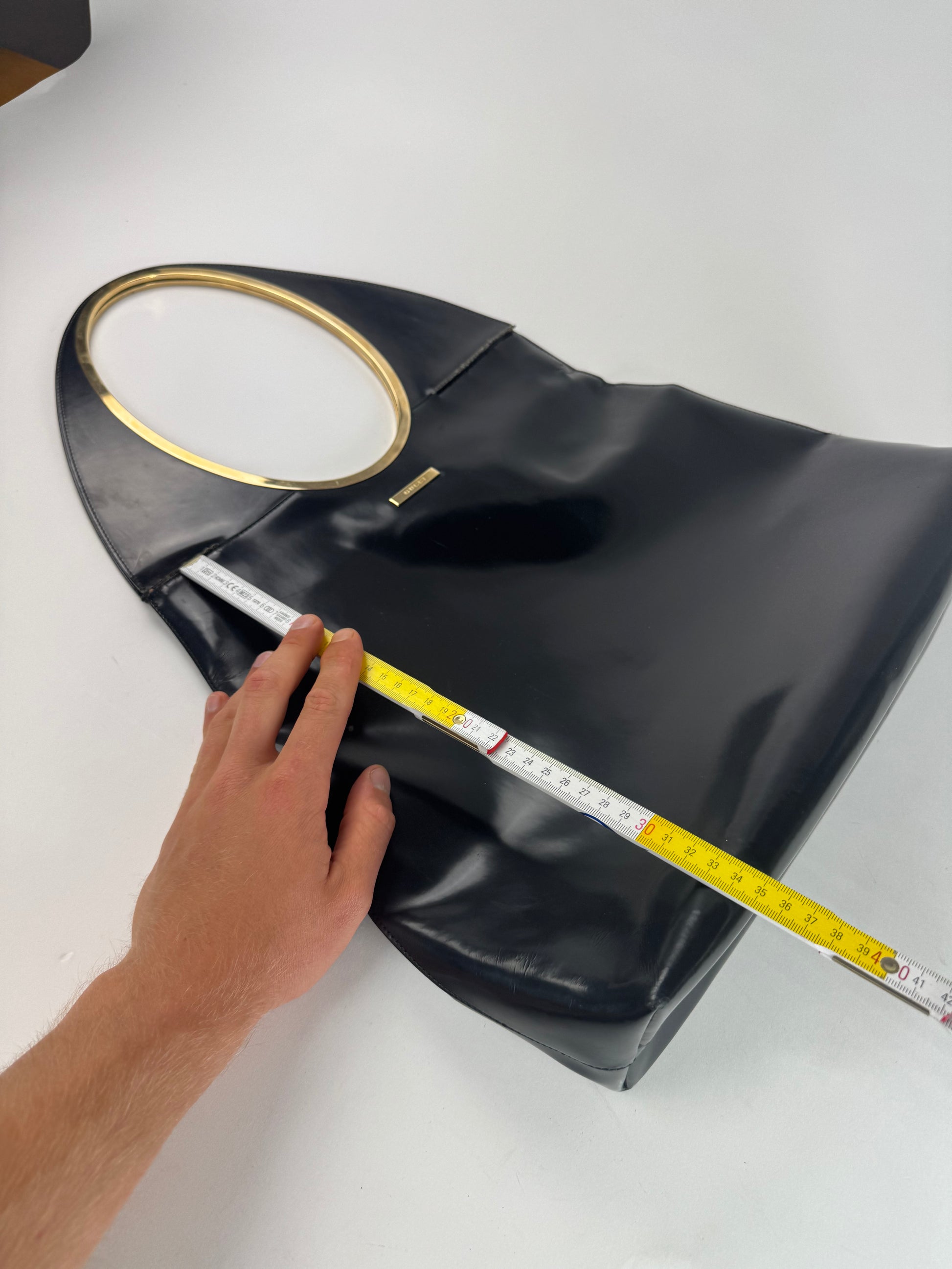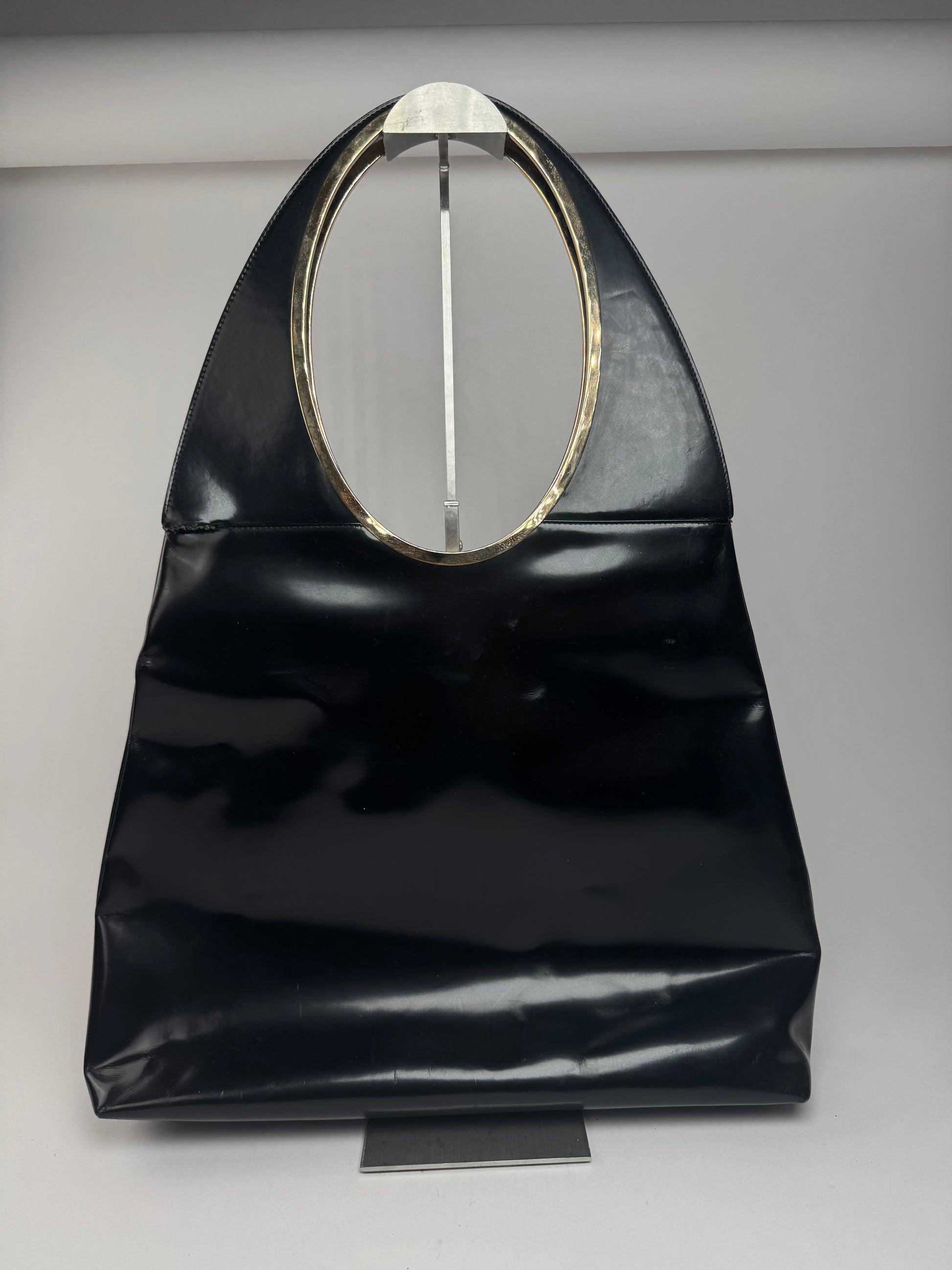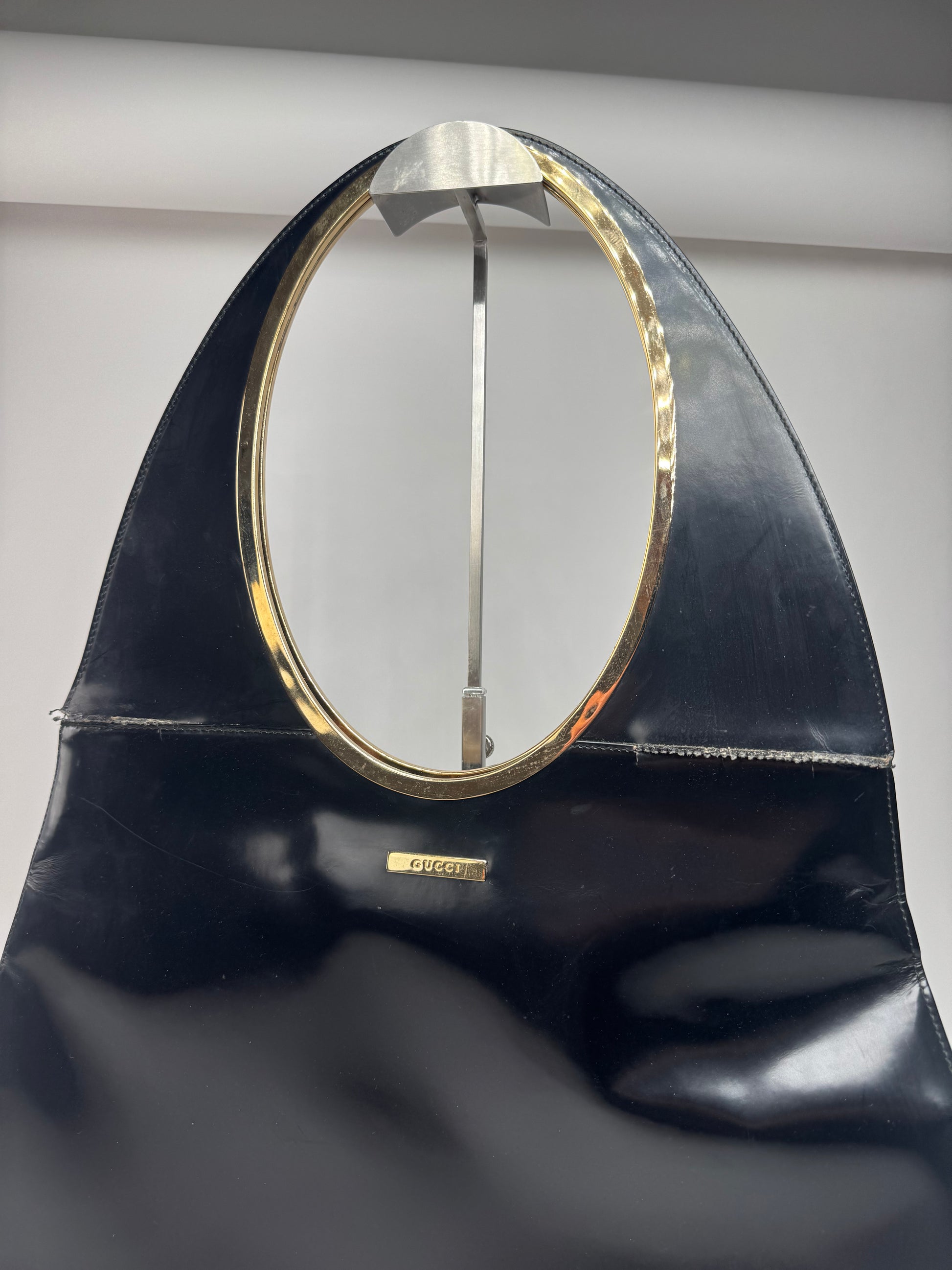 GUCCI Vintage Patent Leather Handbag. This chic handbag is finely crafted of black patent leather from the Tom Ford era. The bag features a large oval handle framed in gold-tone steel and additional gold-tone hardware throughout.
