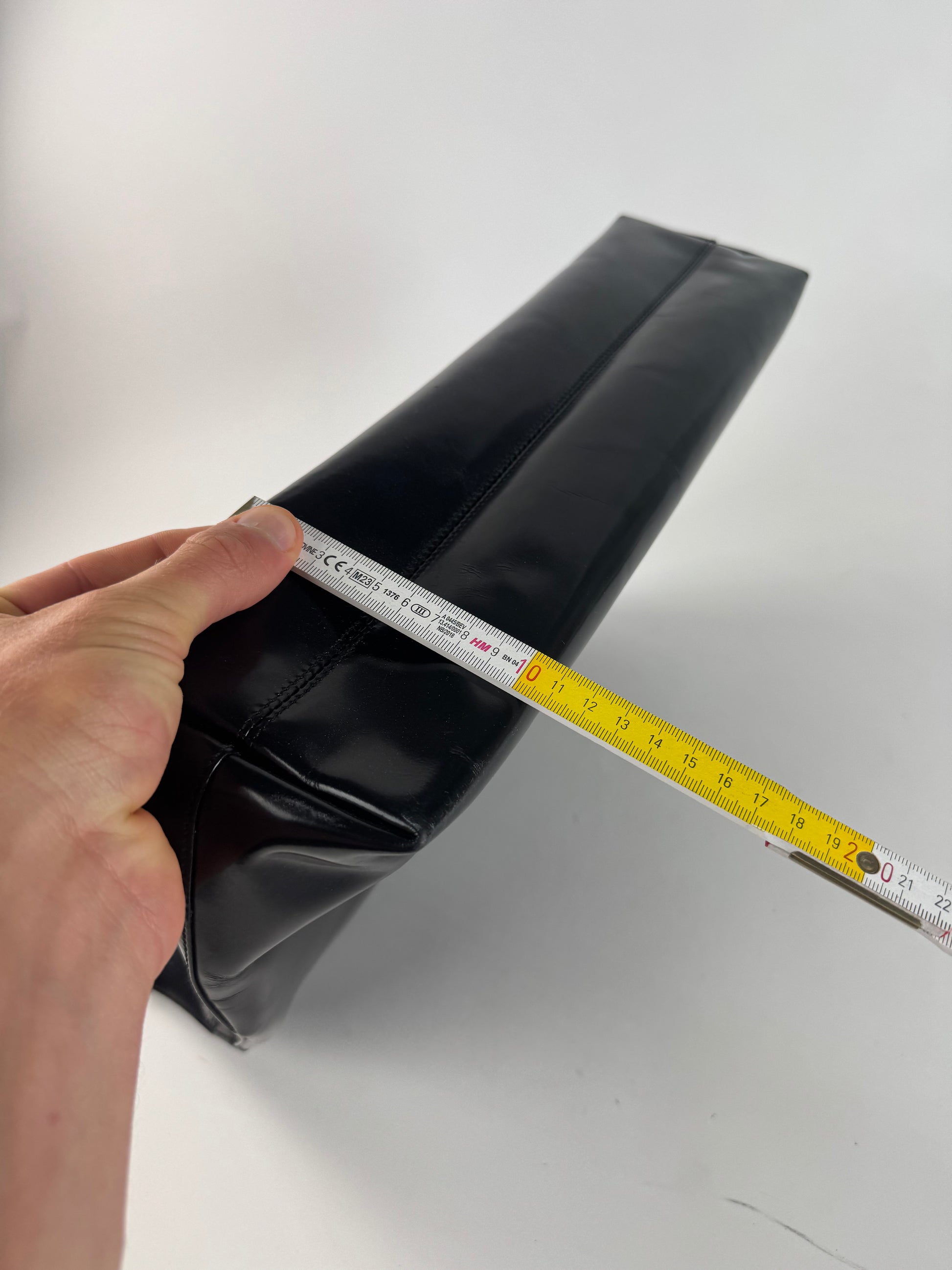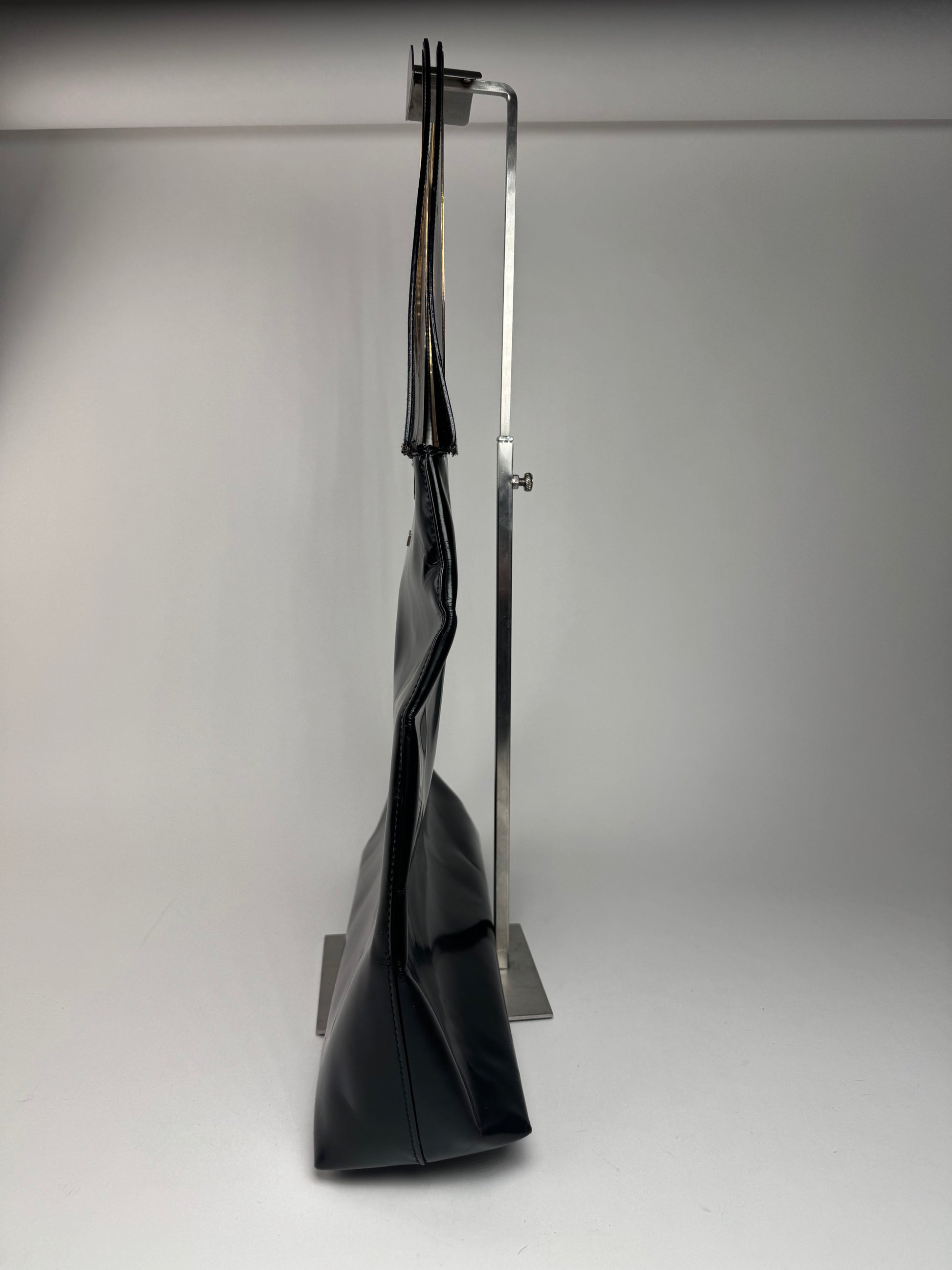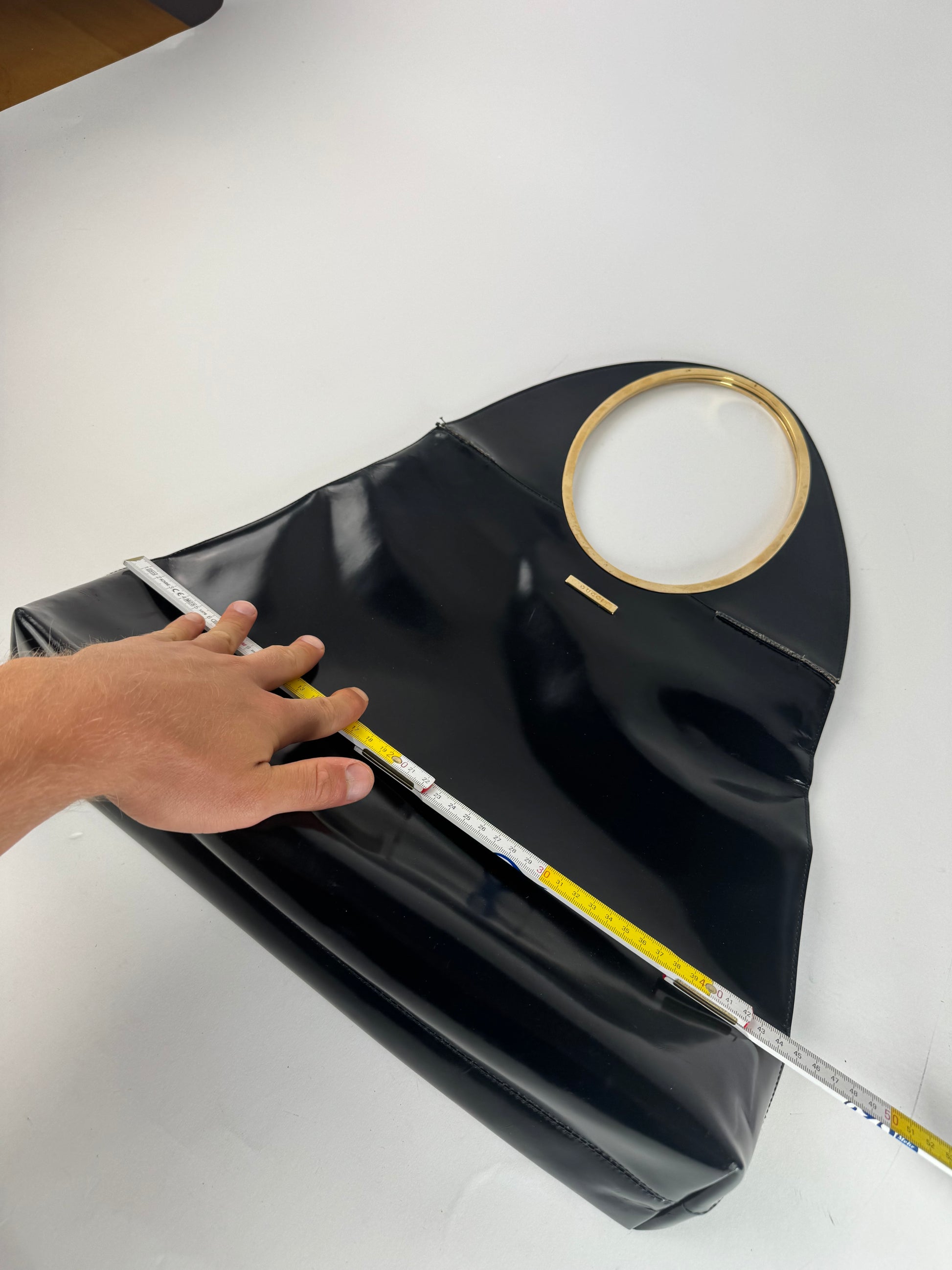 GUCCI Vintage Patent Leather Handbag. This chic handbag is finely crafted of black patent leather from the Tom Ford era. The bag features a large oval handle framed in gold-tone steel and additional gold-tone hardware throughout.