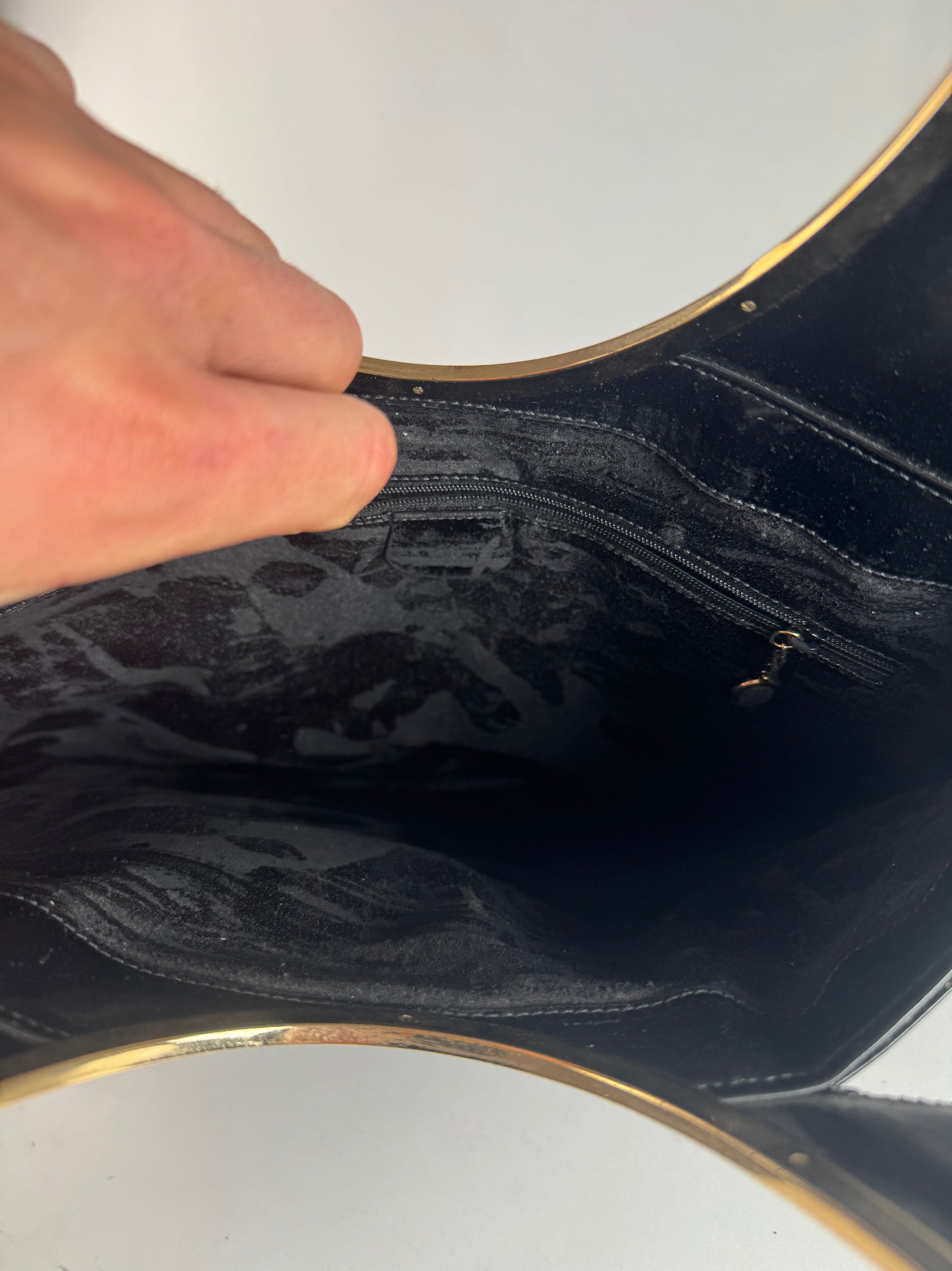 Condition Details: The exterior patent leather is in good condition with signs of wear, especially on the handle. The interior lining is heavily damaged. The hardware is bright with light signs of use.