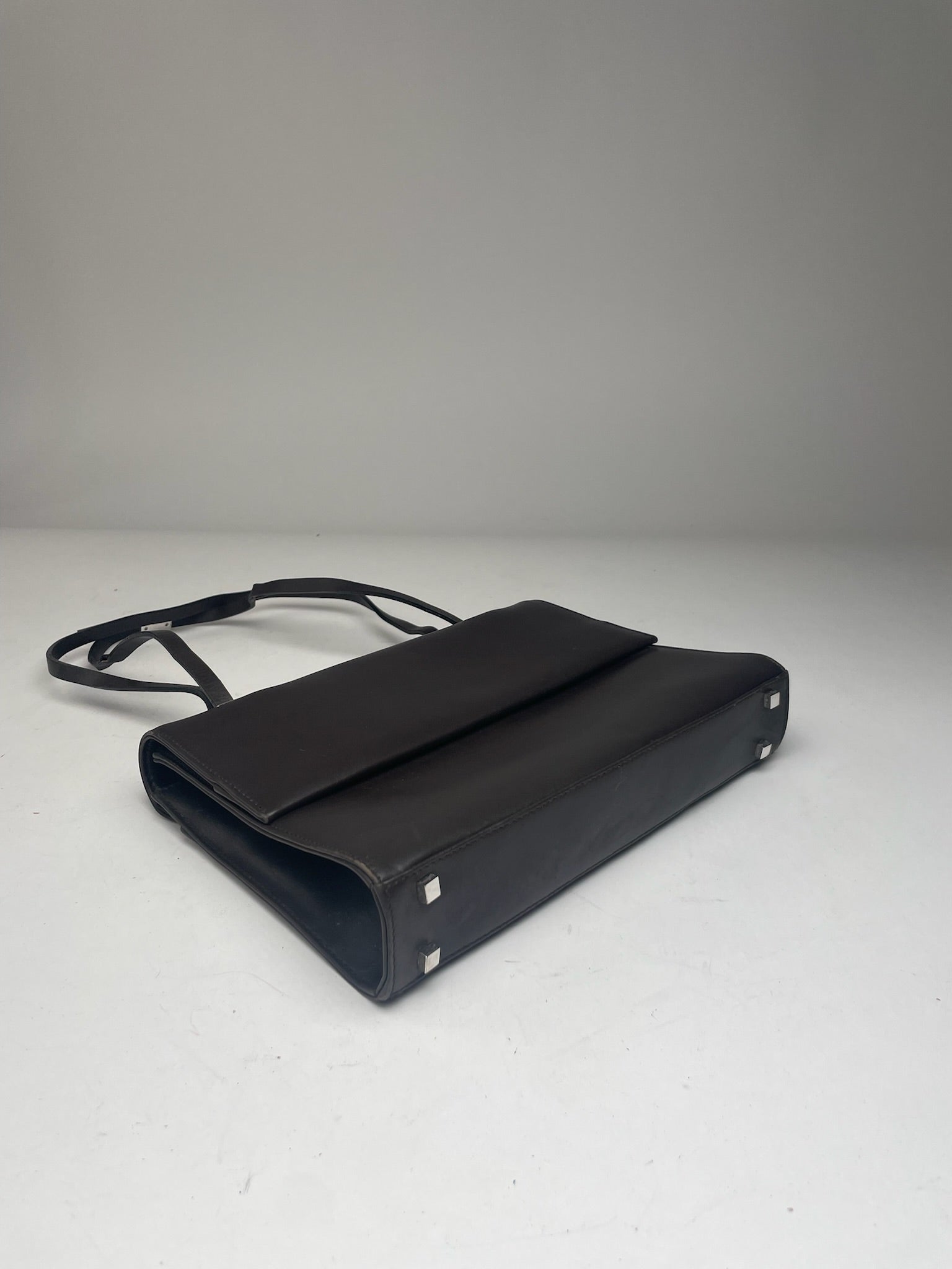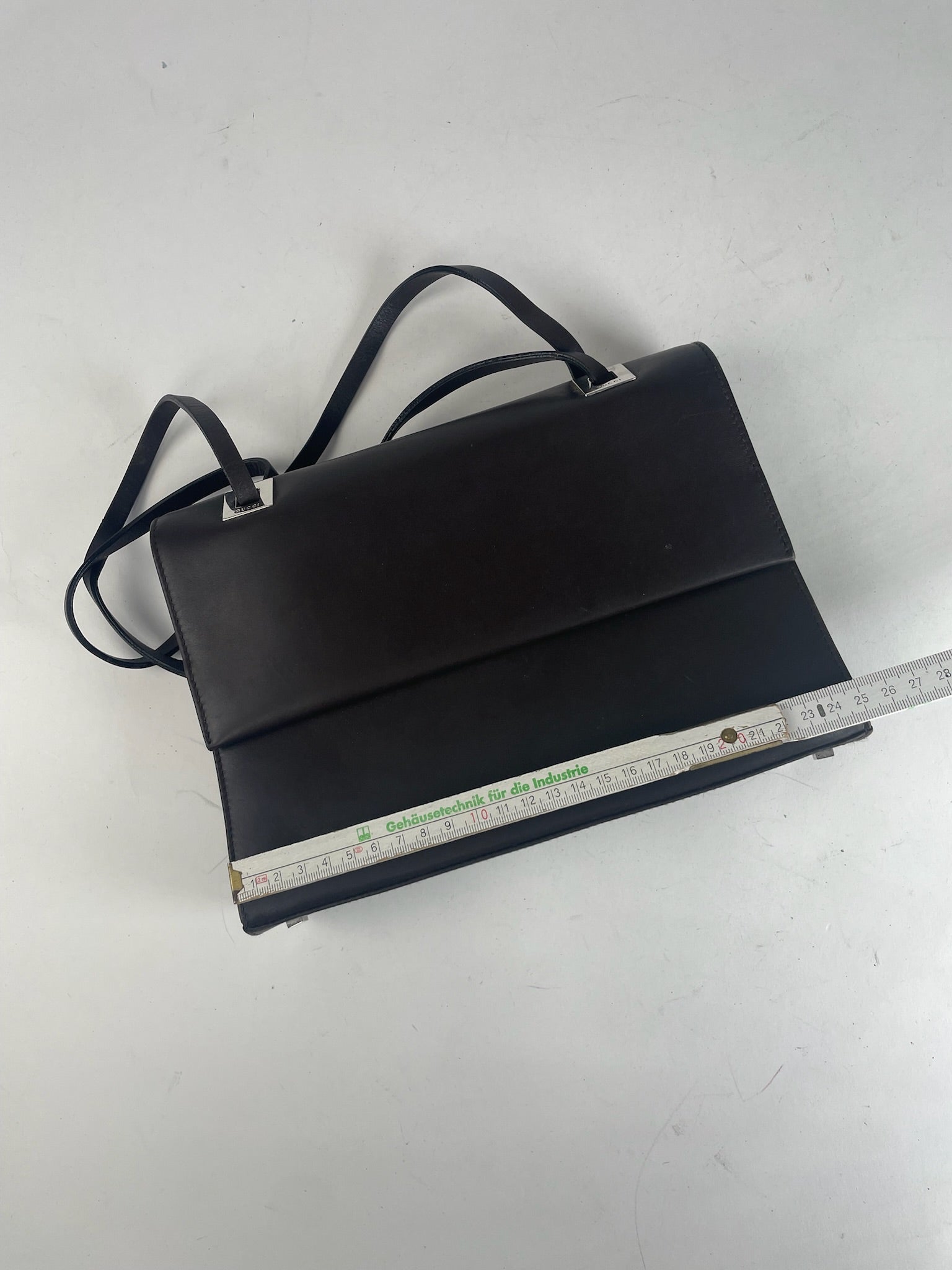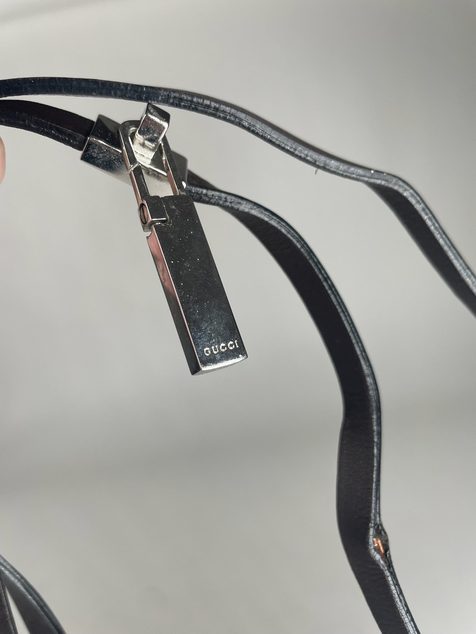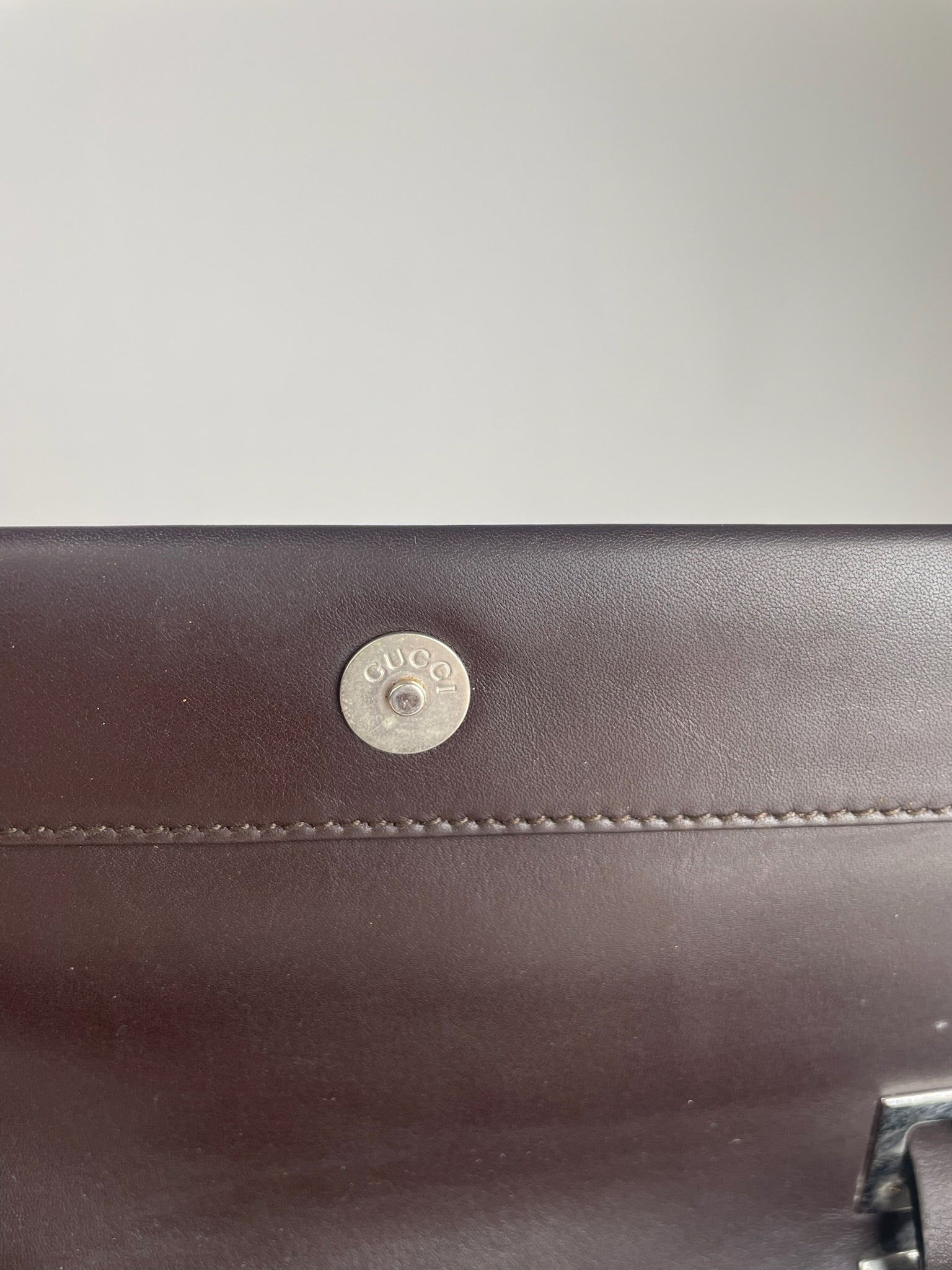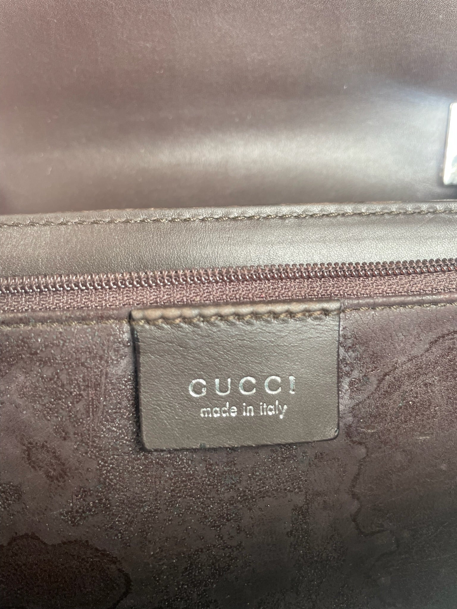 This elegant vintage handbag by Gucci is crafted from rich red-brown leather. The bag is in very good condition, showing some scratches and damaged material on the exterior, but the interior remains in excellent shape. The hardware is silver and made of steel. It features a magnetic closure for easy access.