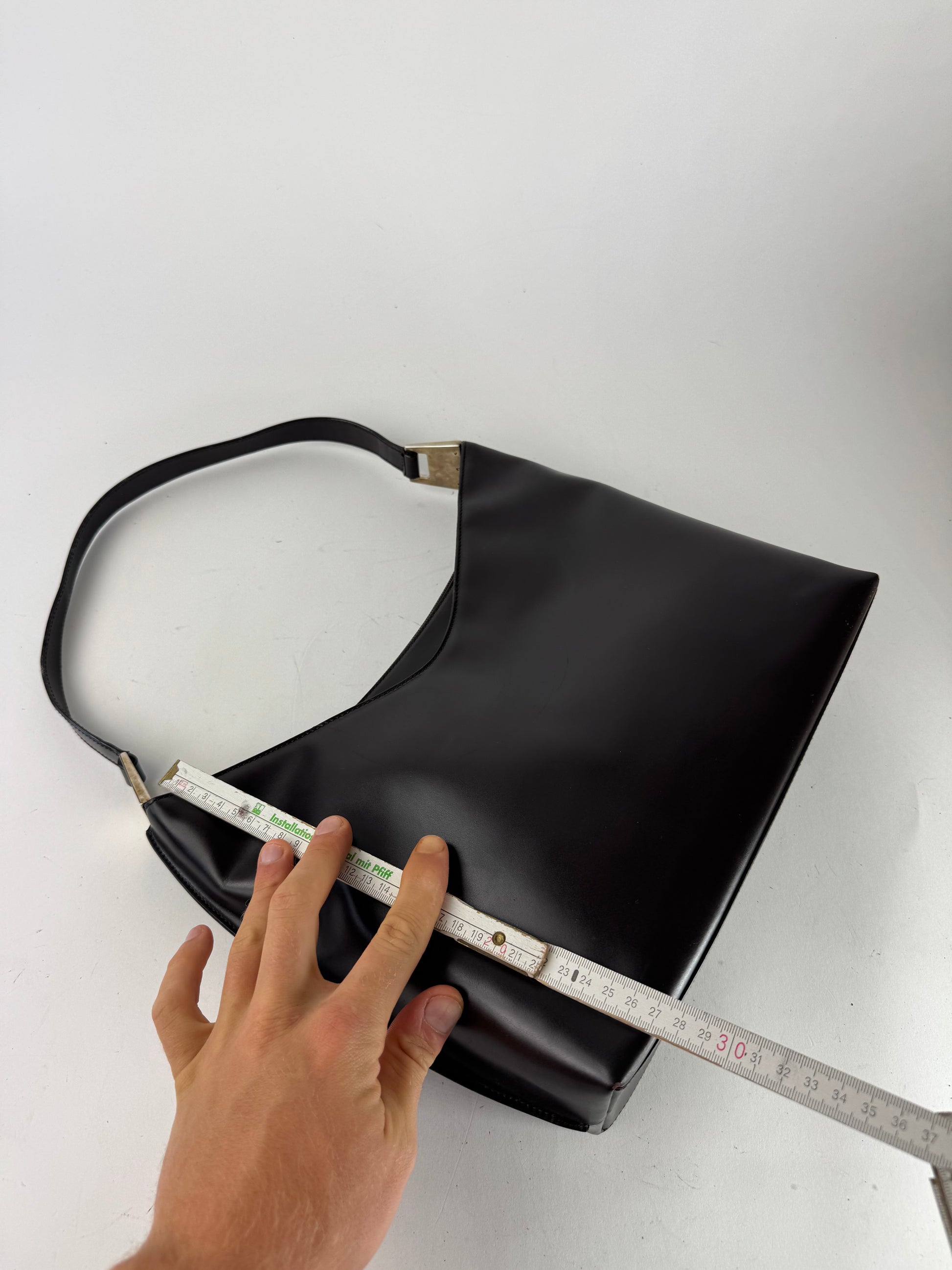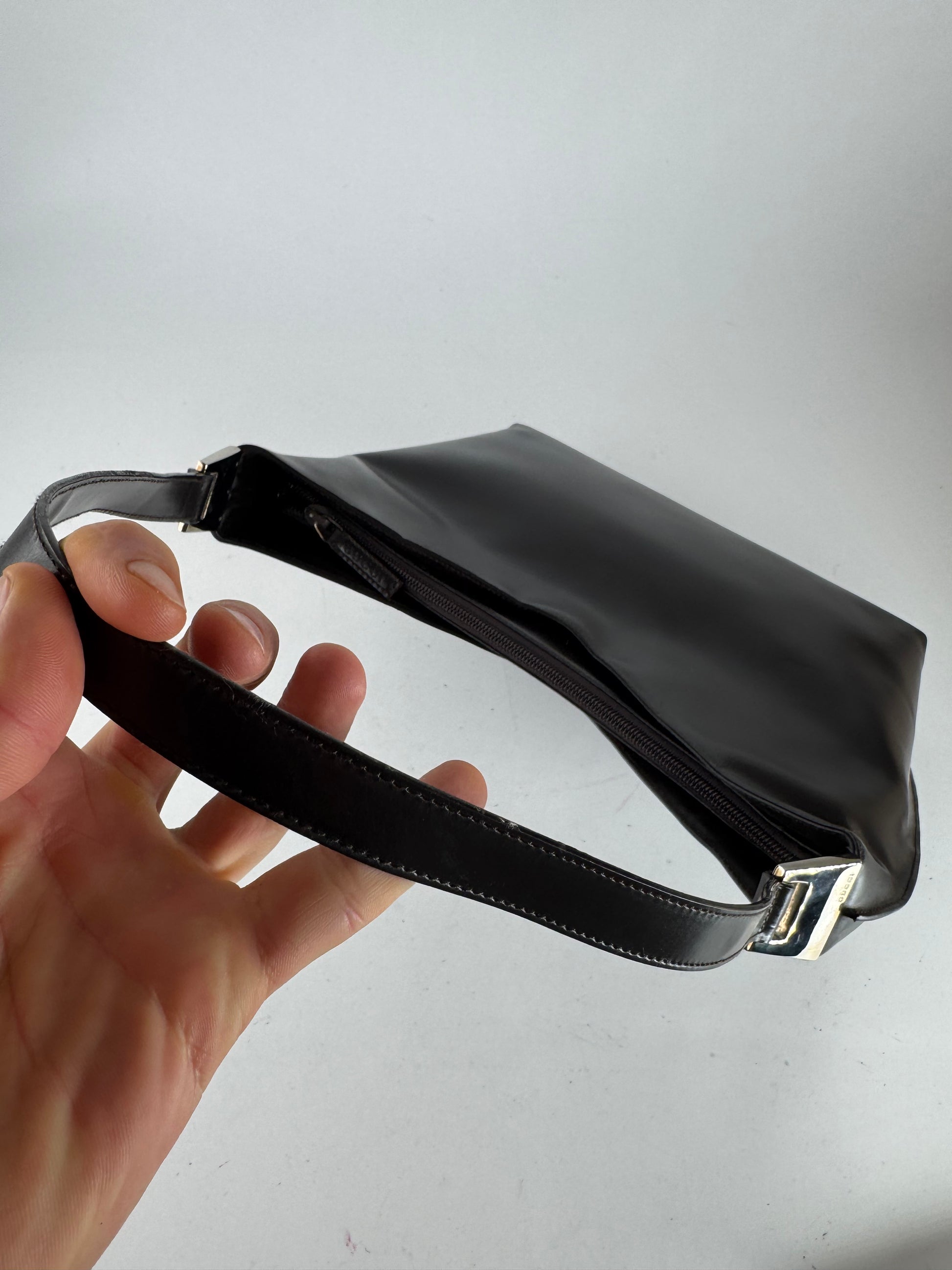 Condition Details: The bag is in good overall condition with visible scratches. The interior lining is sticky and damaged, but the exterior patent leather remains well-preserved.