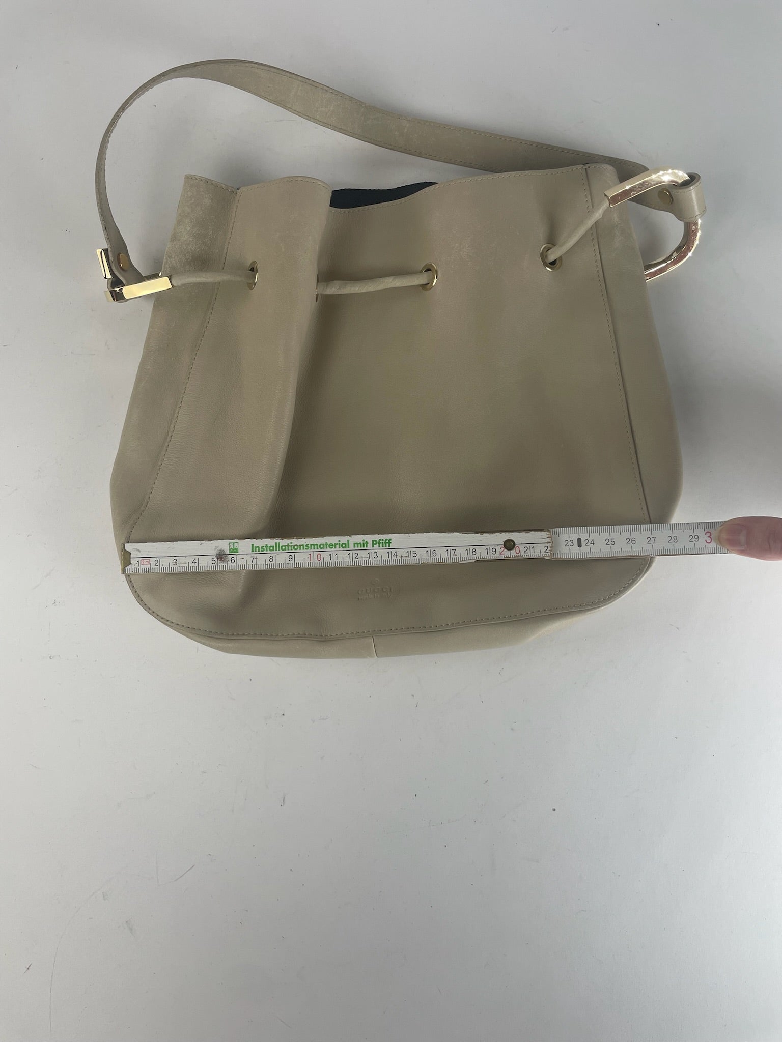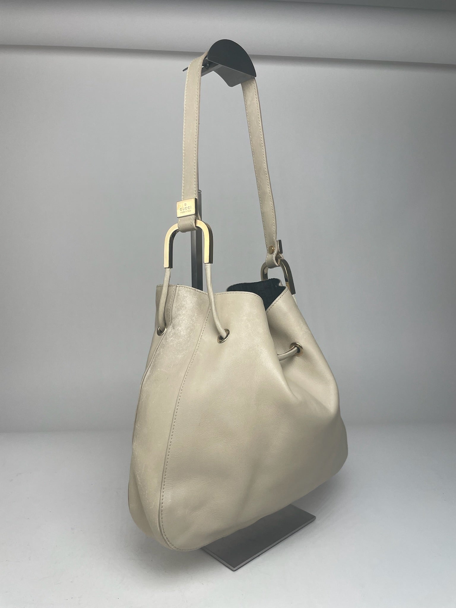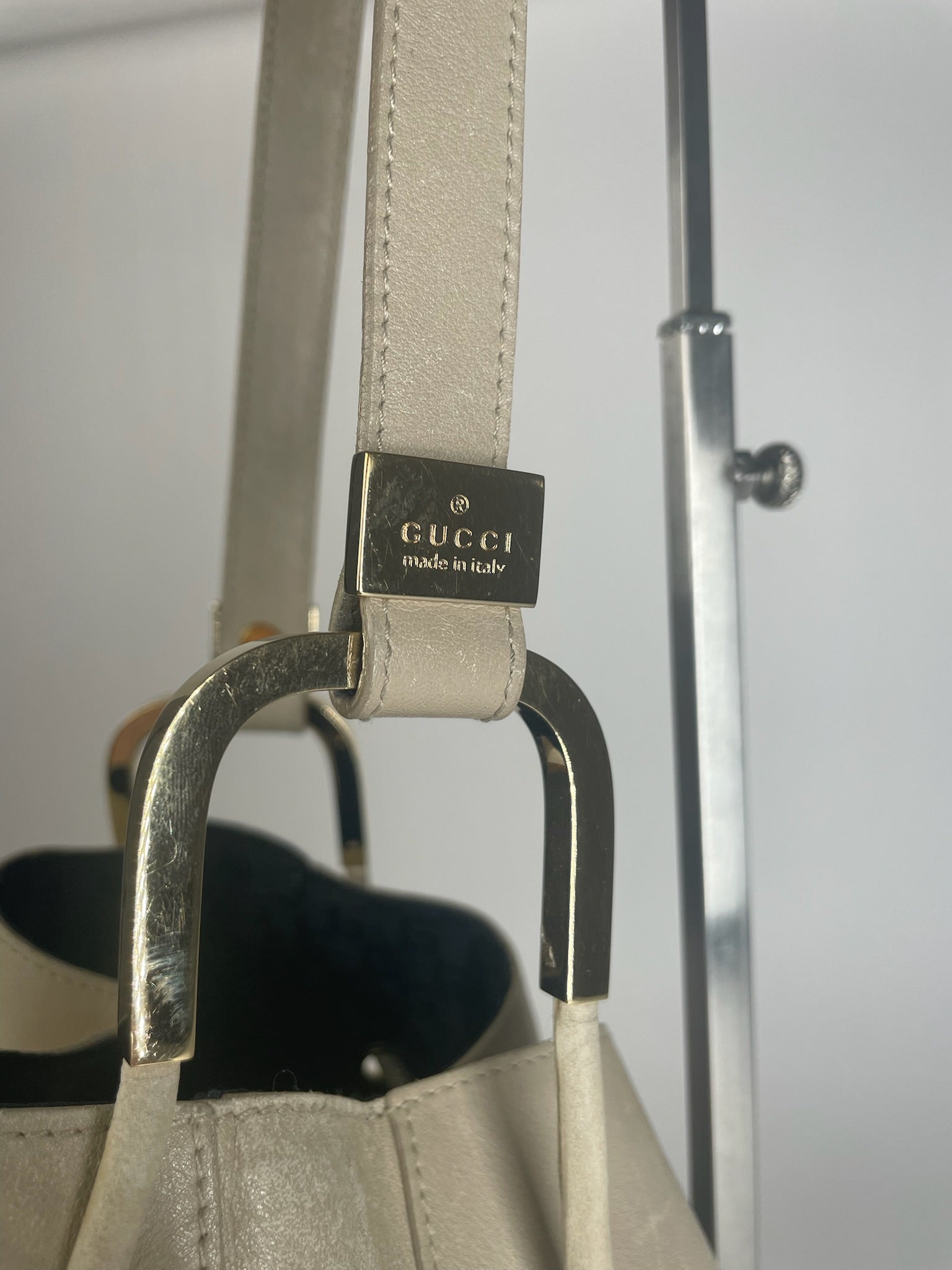 This chic vintage bucket bag by Gucci is crafted from soft white leather with golden hardware. The bag is in very good condition, showing some minor scuffs and scratches, but it remains in excellent shape overall. The interior is lined with black canvas featuring the iconic Gucci GG monogram. The sale includes the original Gucci dustbag.