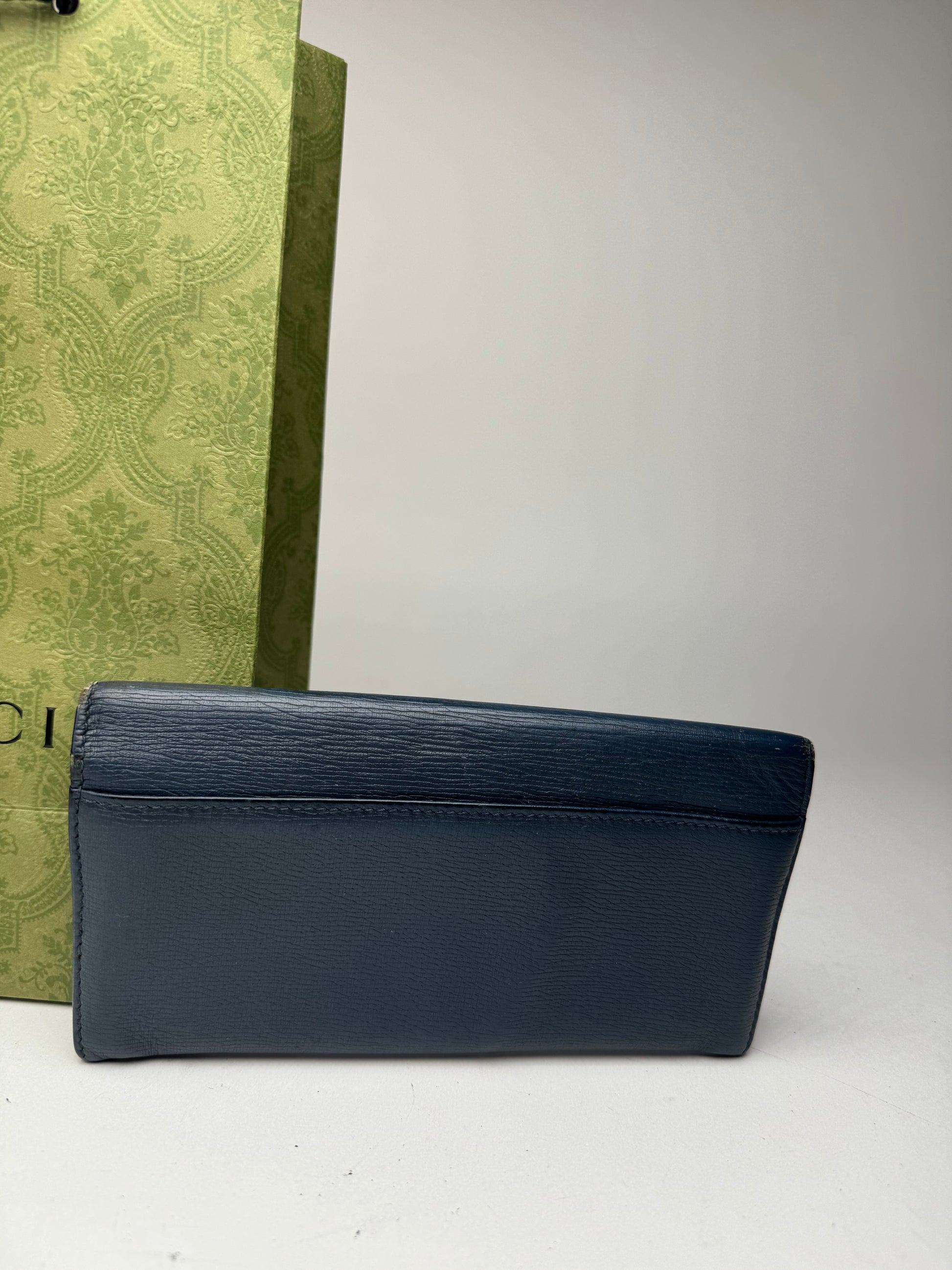 GUCCI Navy Leather Wallet. This elegant wallet is finely crafted of navy blue leather and features a silver-tone steel GG logo on the lower right front. It is secured with a snap button closure and includes silver-tone steel hardware. The interior is lined with white leather and detailed with a navy chain-pattern monogram.