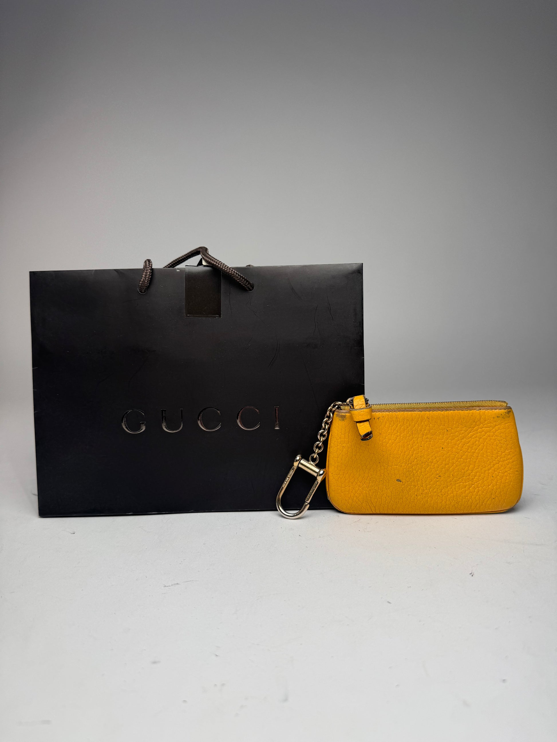This chic card holder is finely crafted of yellow leather. The piece features a top zipper closure and a side-attached gold-tone steel chain with a signature horsebit hook to fasten to keys. It is made in Italy.
