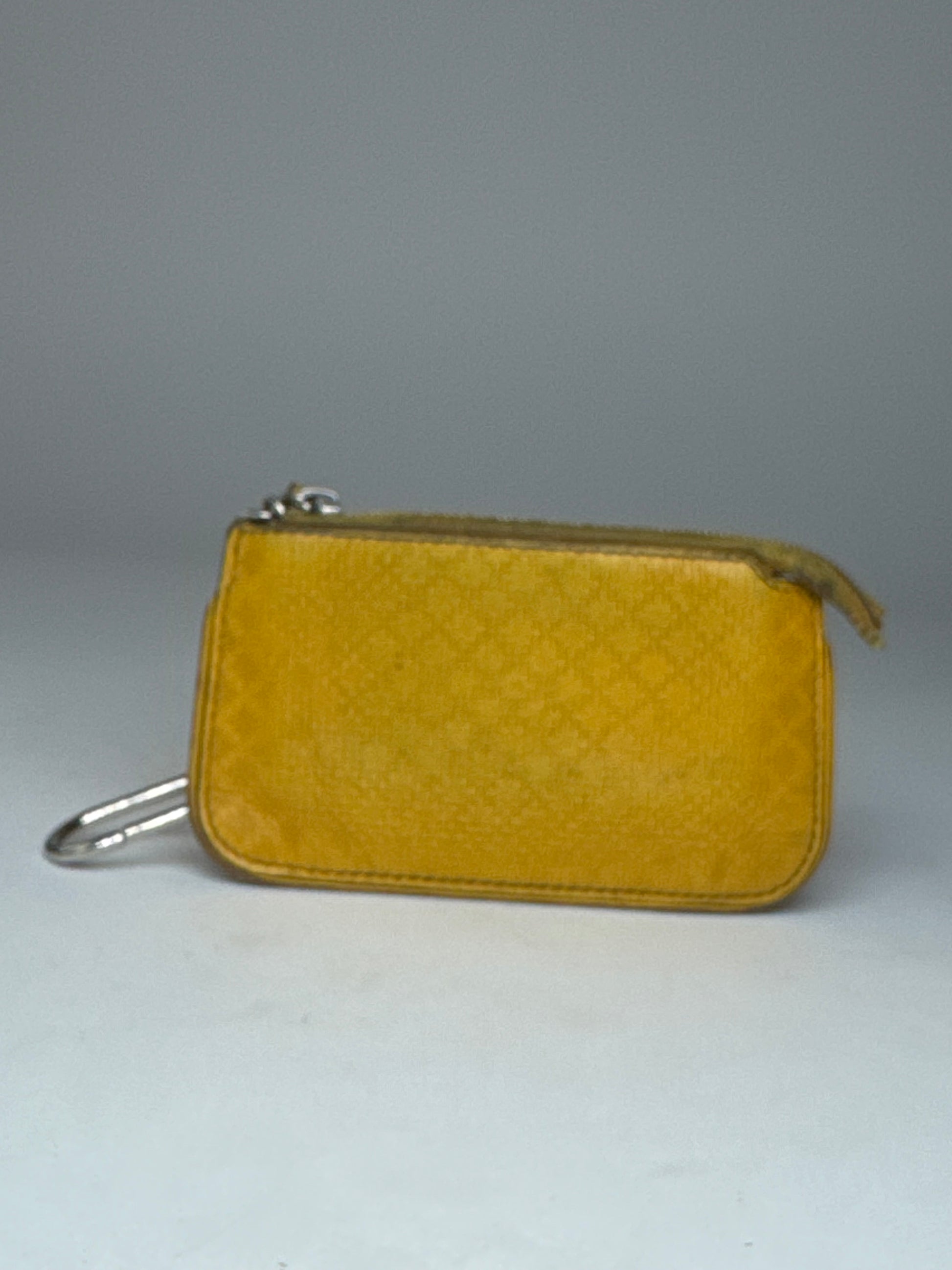 GUCCI Vintage Cardholder. This chic cardholder is finely crafted of yellow patterned leather. The cardholder features a top zipper closure and a detachable silver-tone steel chain with a clasp on the side. The zipper opens to a black interior lining.