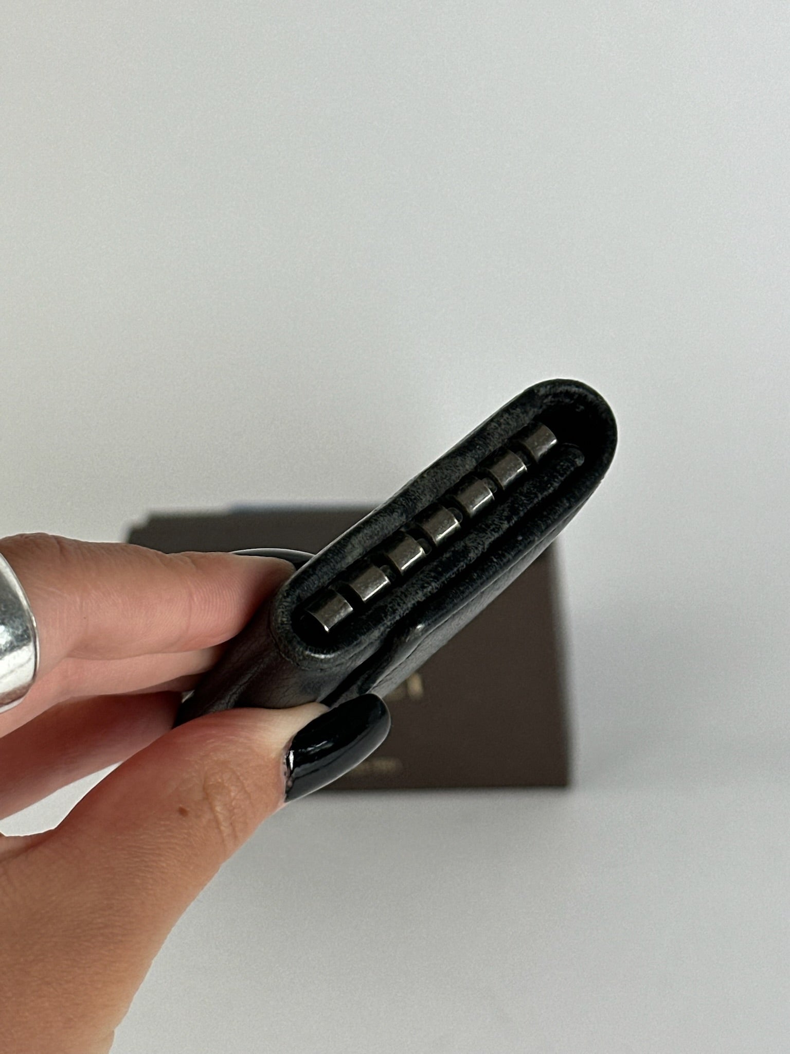Condition Details: The black leather exterior and interior are in very good condition with minimal signs of wear. The silver-tone steel hardware is well-preserved.