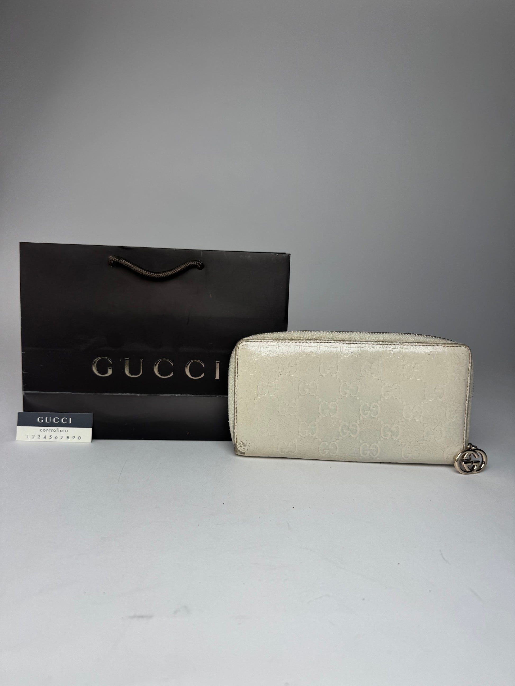 GUCCI White Monogram Leather Wallet. This vintage wallet is crafted from white Gucci monogram leather and features a gold-tone GG logo zipper pull in metal.