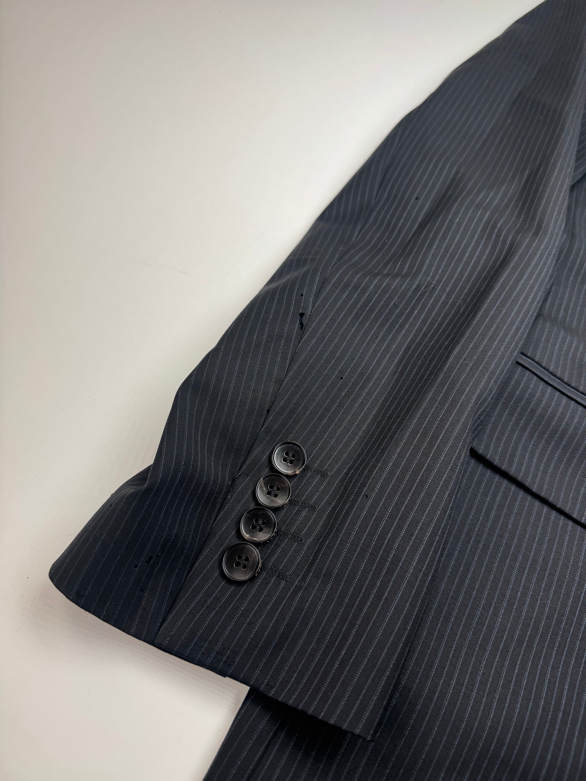 GUCCI Vintage Men’s Blazer. This refined vintage blazer is crafted in a black and white vertical stripe pattern and tailored from a luxurious blend of 70% lana wool and 30% mohair. The interior is fully lined in black fabric featuring the iconic Gucci GG monogram, highlighting the brand’s signature attention to detail and Italian tailoring. The blazer is finished with black plastic buttons and offers a sharp, classic silhouette.