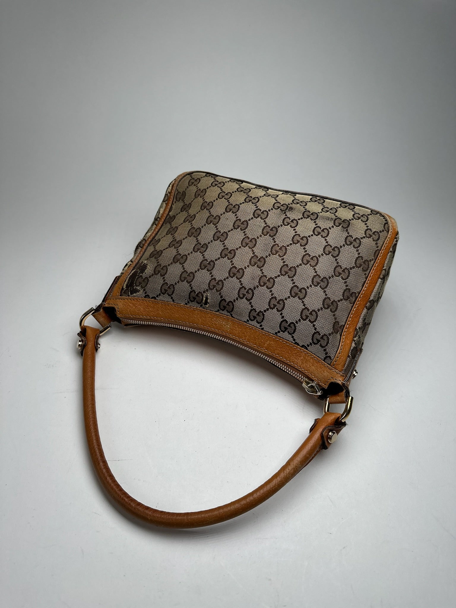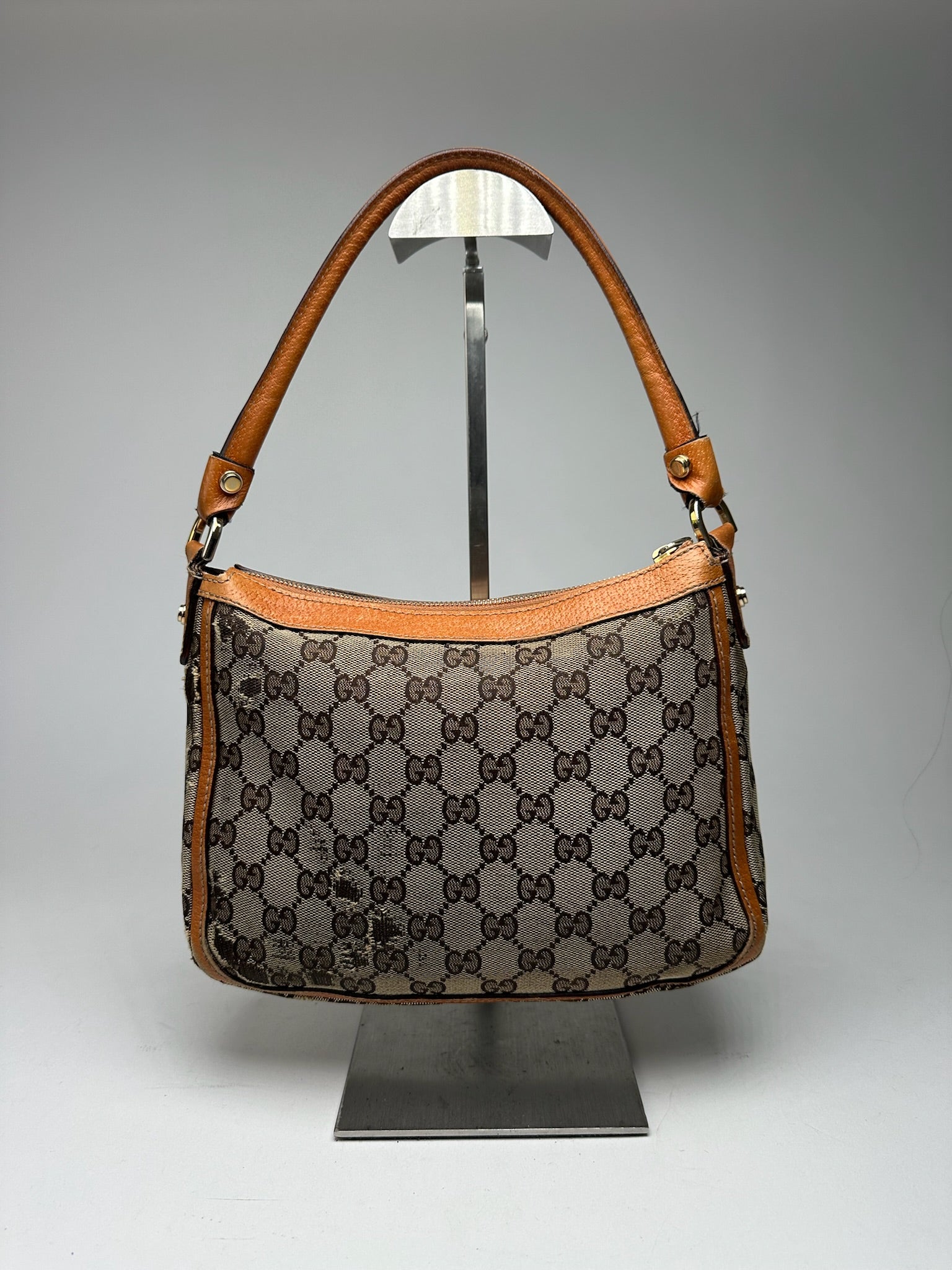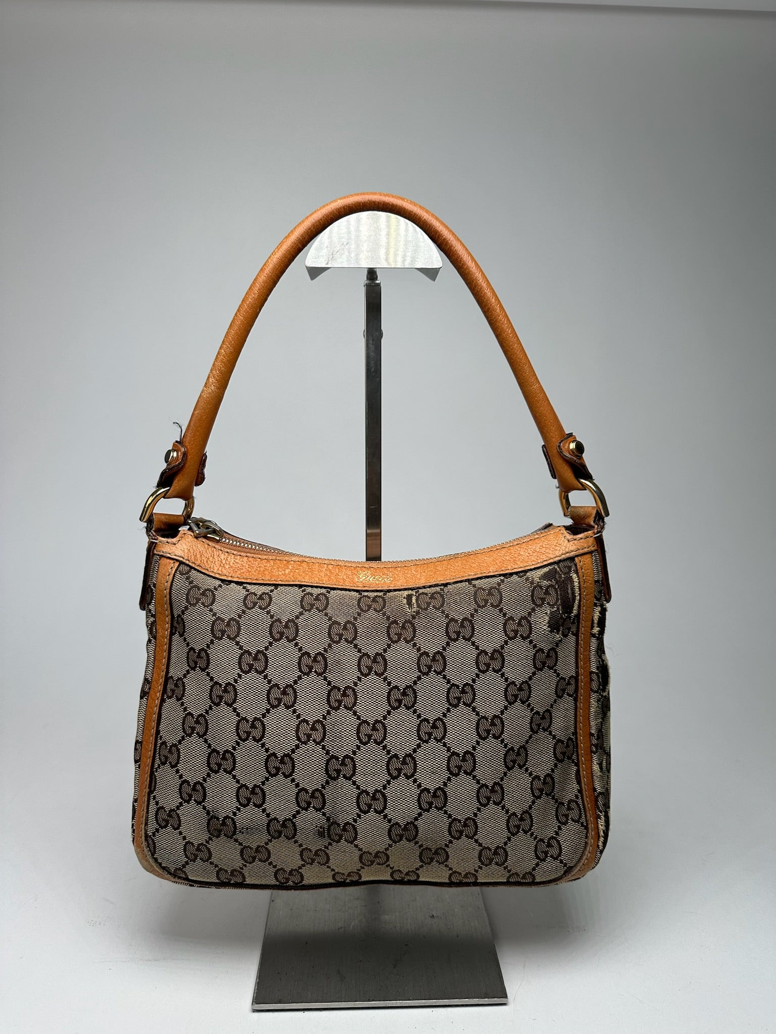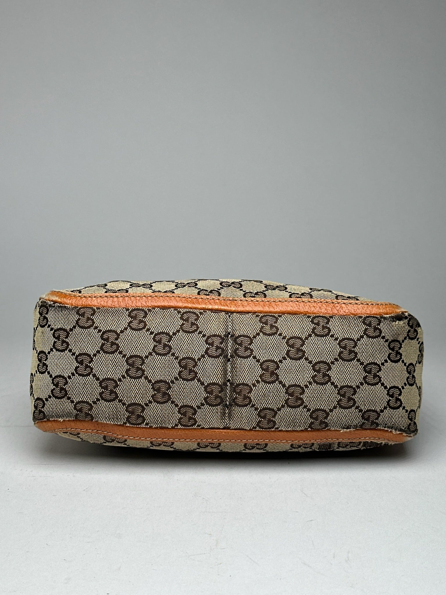 GUCCI Vintage Monogram Canvas Handbag. This chic handbag is finely crafted of beige and brown Gucci monogram canvas with orange-brown leather trim. The bag features a single top handle and gold-tone steel hardware. The top opens to an interior lined in brown canvas.