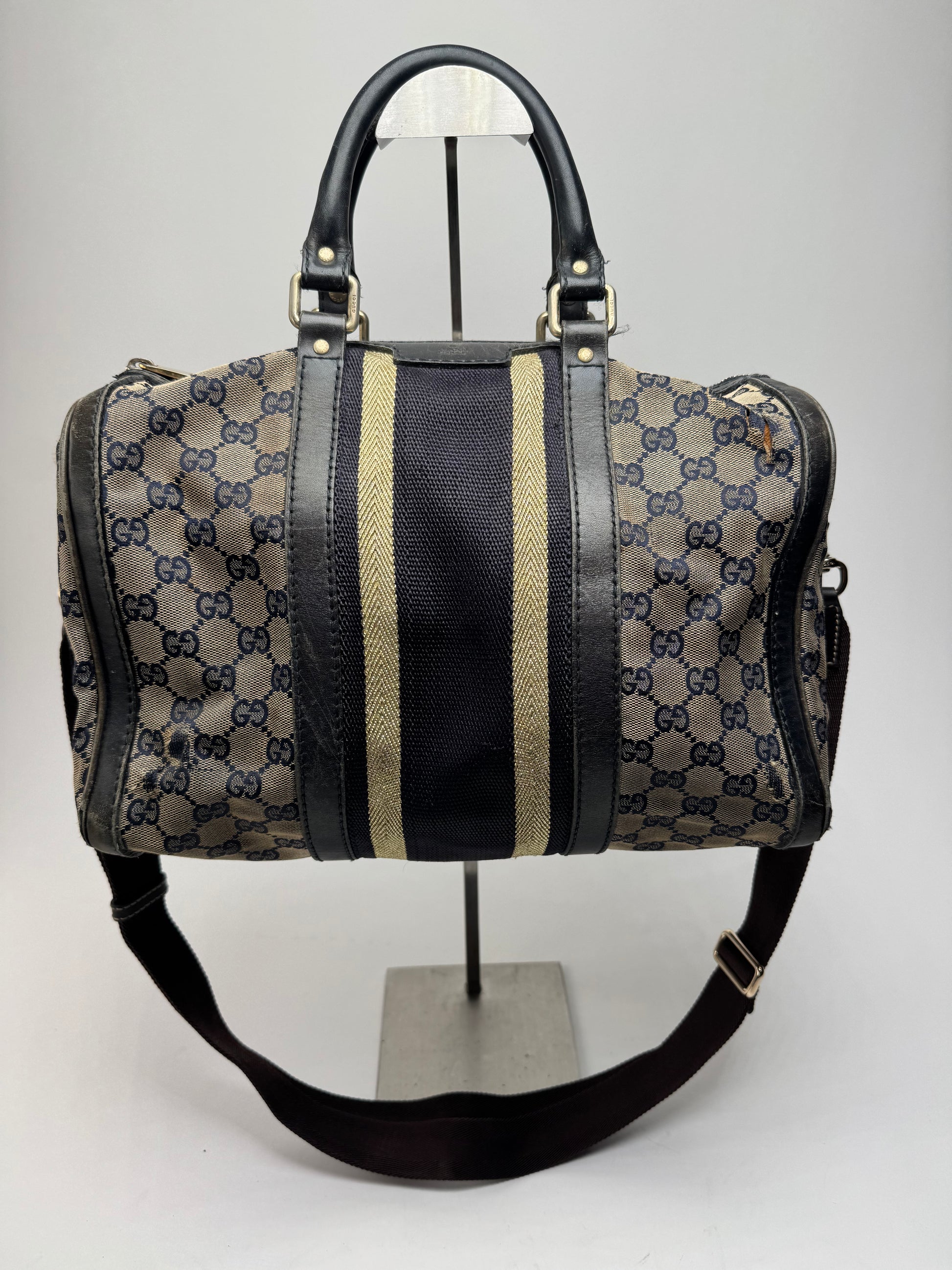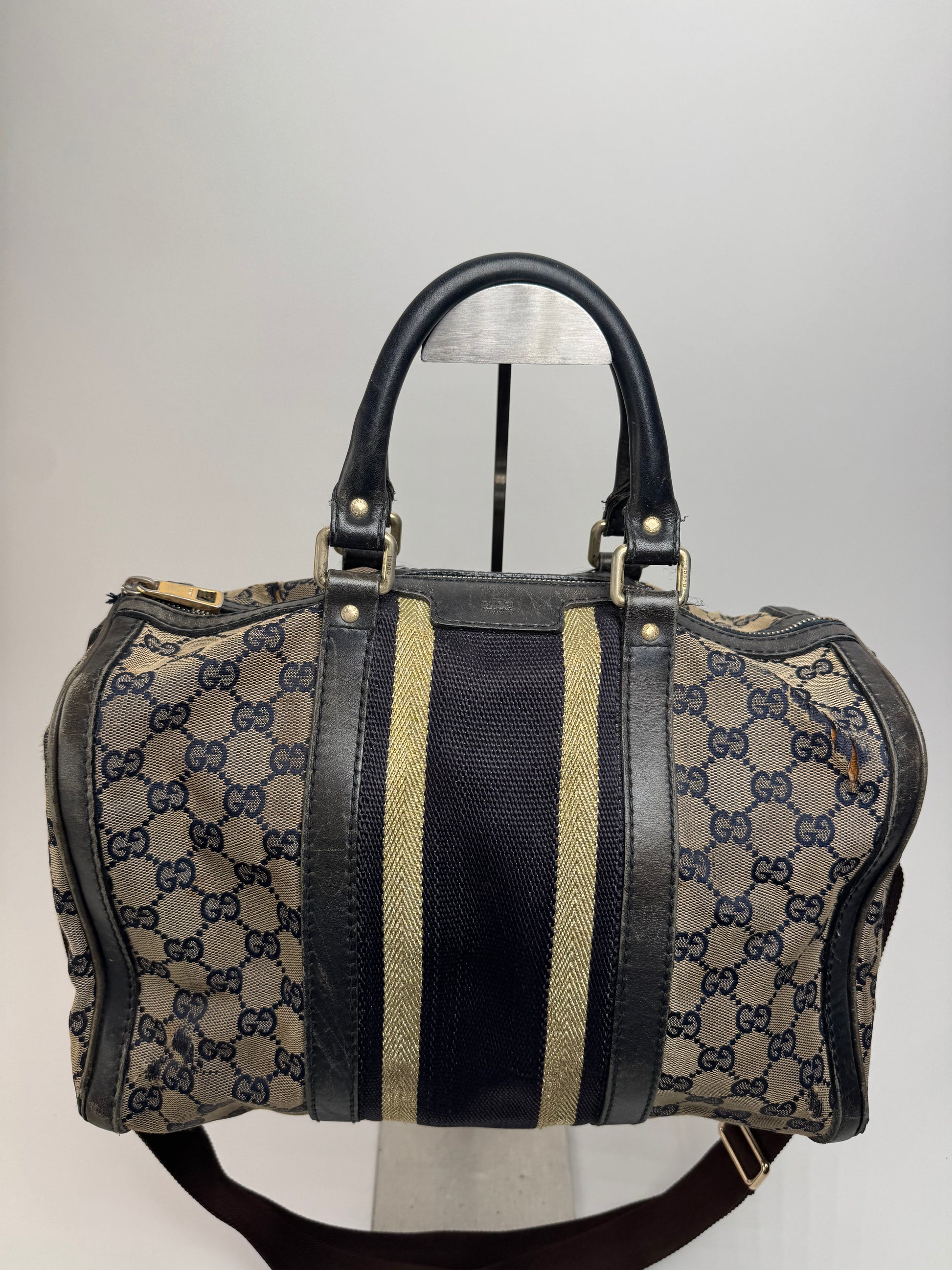 GUCCI Vintage 2-Way Boston Bag. This stylish Boston bag is crafted of Gucci monogram canvas in black and brown. The bag features black leather trim and handles, a vertical beige and black canvas stripe on the front, and an optional adjustable shoulder strap. Made in Italy. The top zipper opens to a beige canvas interior.