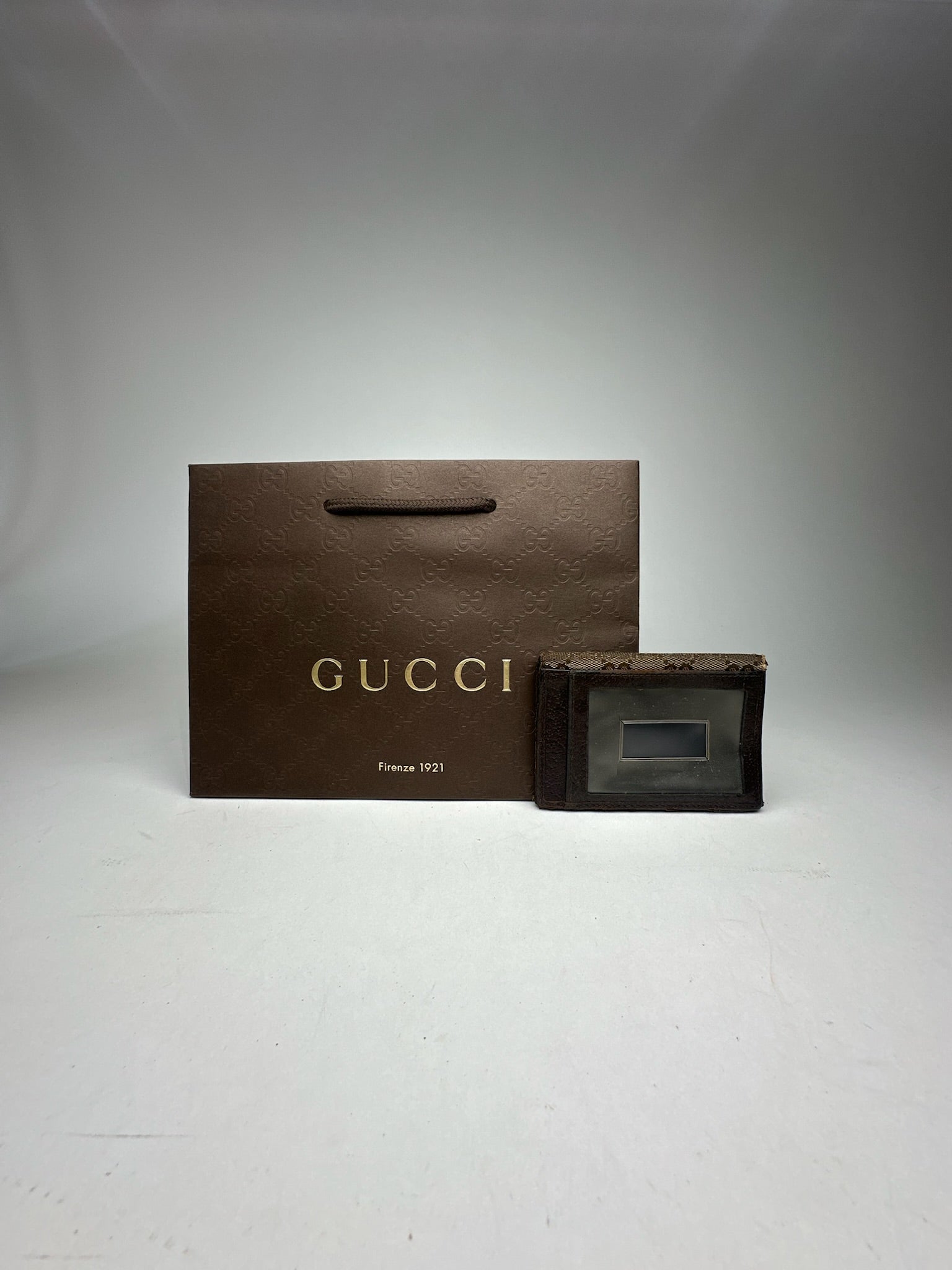 GUCCI Vintage Monogram Canvas Cardholder. This chic cardholder is finely crafted of beige-brown Gucci monogram canvas with silver-tone steel hardware. The back features two compartments, including one transparent slot ideal for cards or passes.