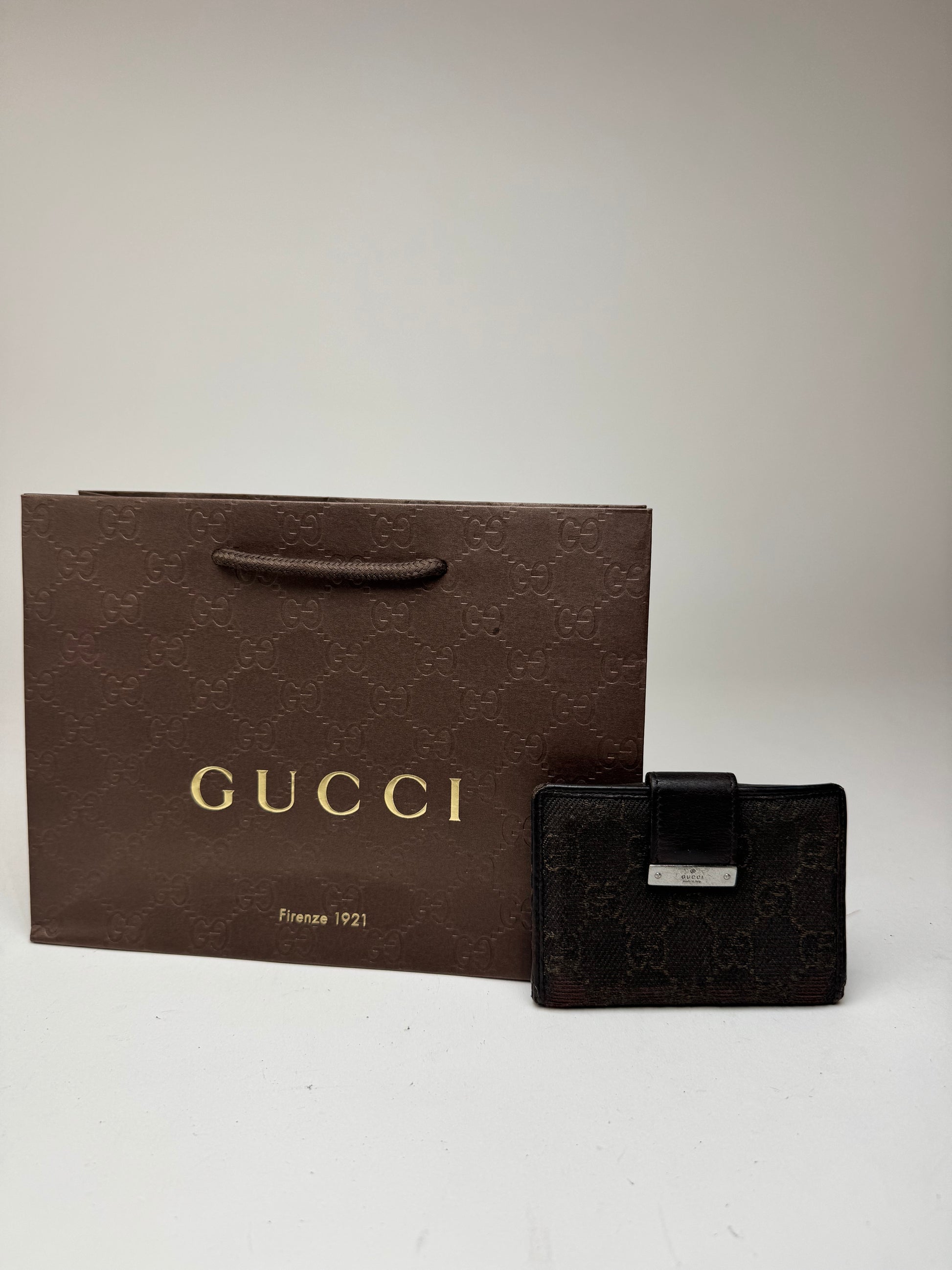 GUCCI Vintage Card Holder. This stylish vintage card holder is crafted of black leather and black-brown Gucci monogram canvas with silver-tone steel hardware. The front features a snap-button closure, while the back includes a transparent PVC pocket. The interior is lined in black leather. Made in Italy, this piece bears the serial number 922742118 and comes with a Gucci shopping bag.