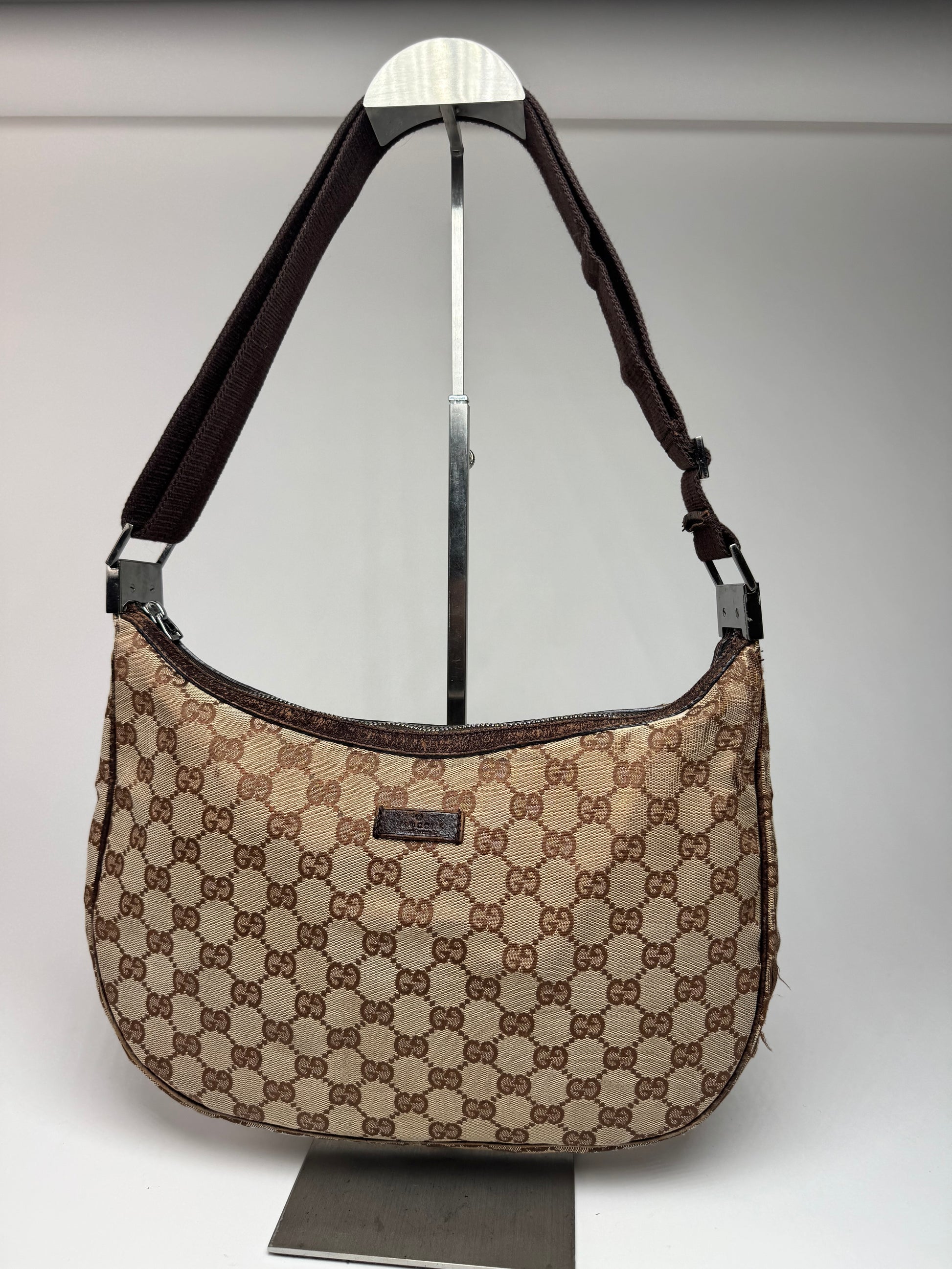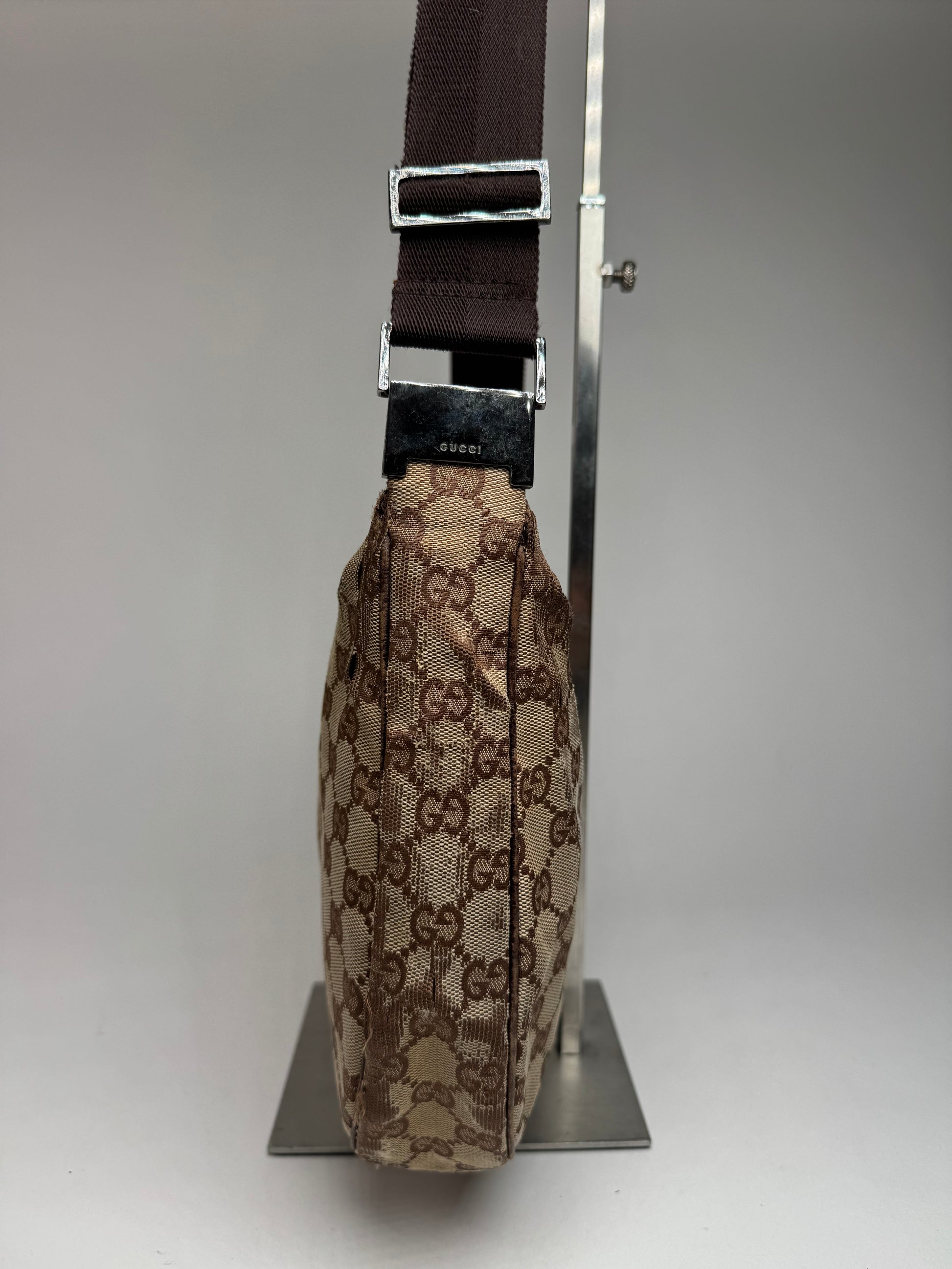 This vintage Gucci Jackie 1961 bag features a unique croissant-shaped silhouette, crafted from beige-brown canvas in the iconic Gucci monogram. It comes with silver-toned hardware and an adjustable strap for versatile wear. The bag is secured with a top zipper and lined with brown canvas for a classic interior finish.