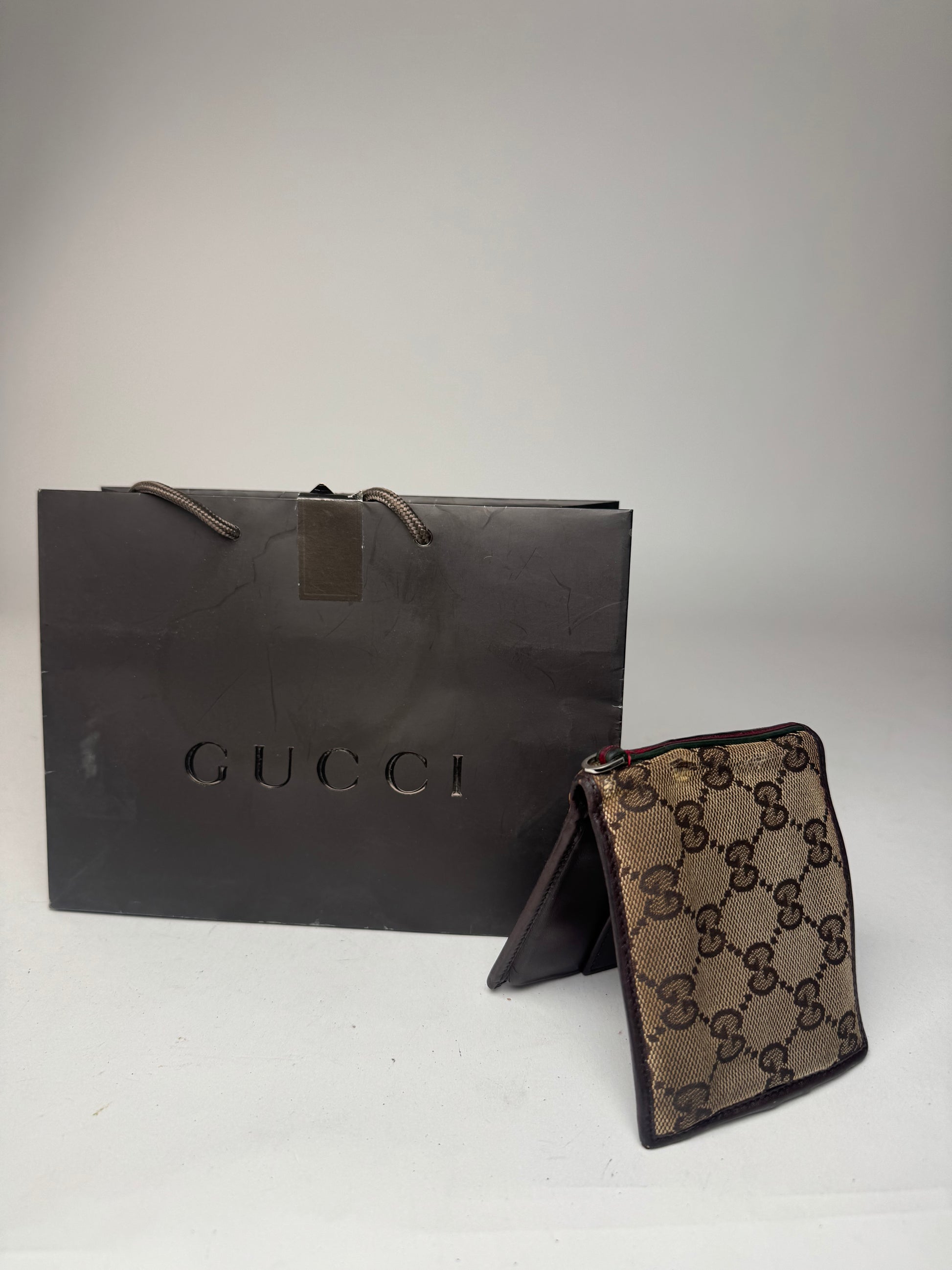 GUCCI Beige-Brown Monogram Canvas Wallet. This vintage wallet is crafted from beige and brown Gucci monogram canvas and features a side grommet for optional attachment. It folds open to a brown leather interior.