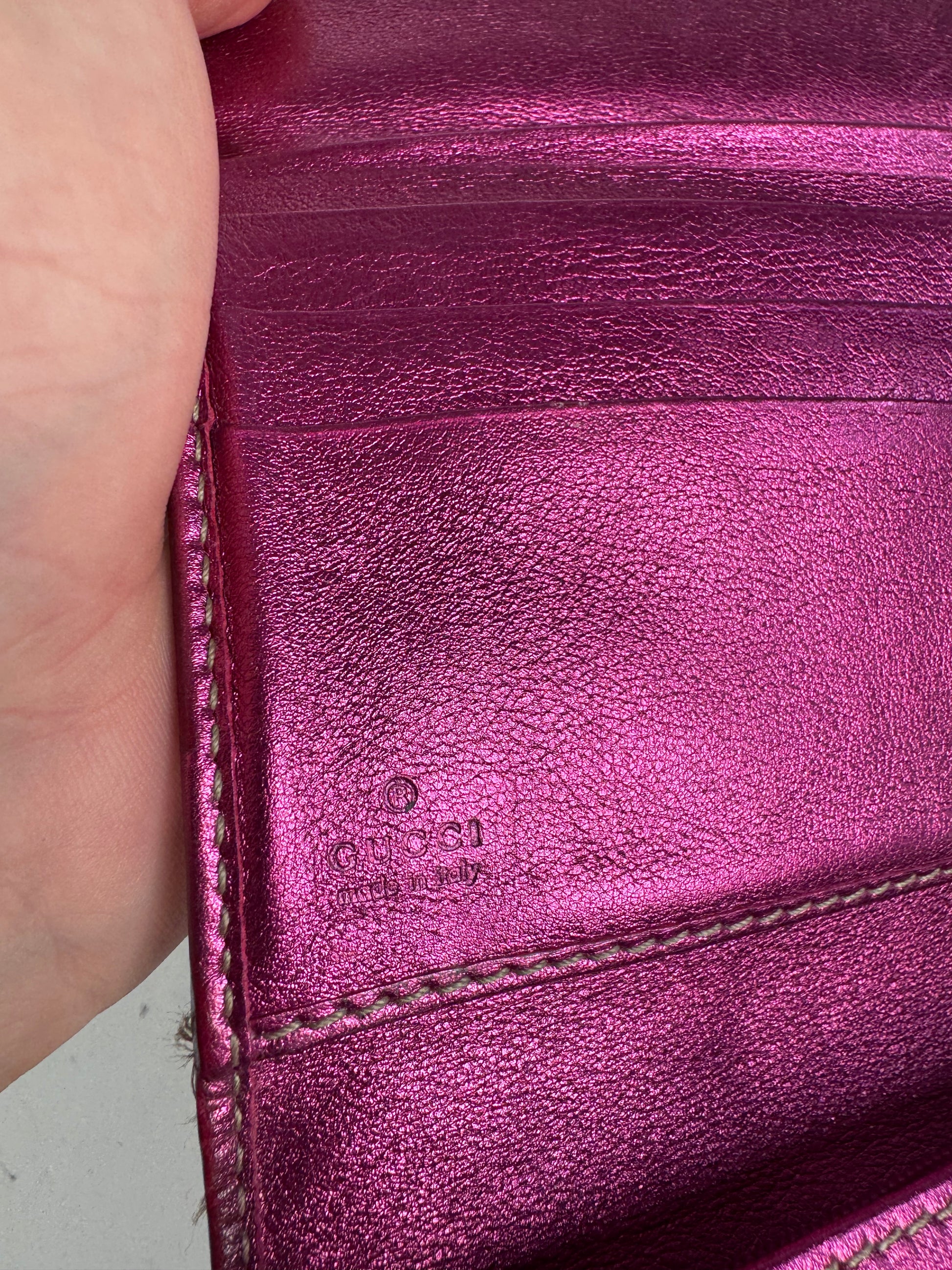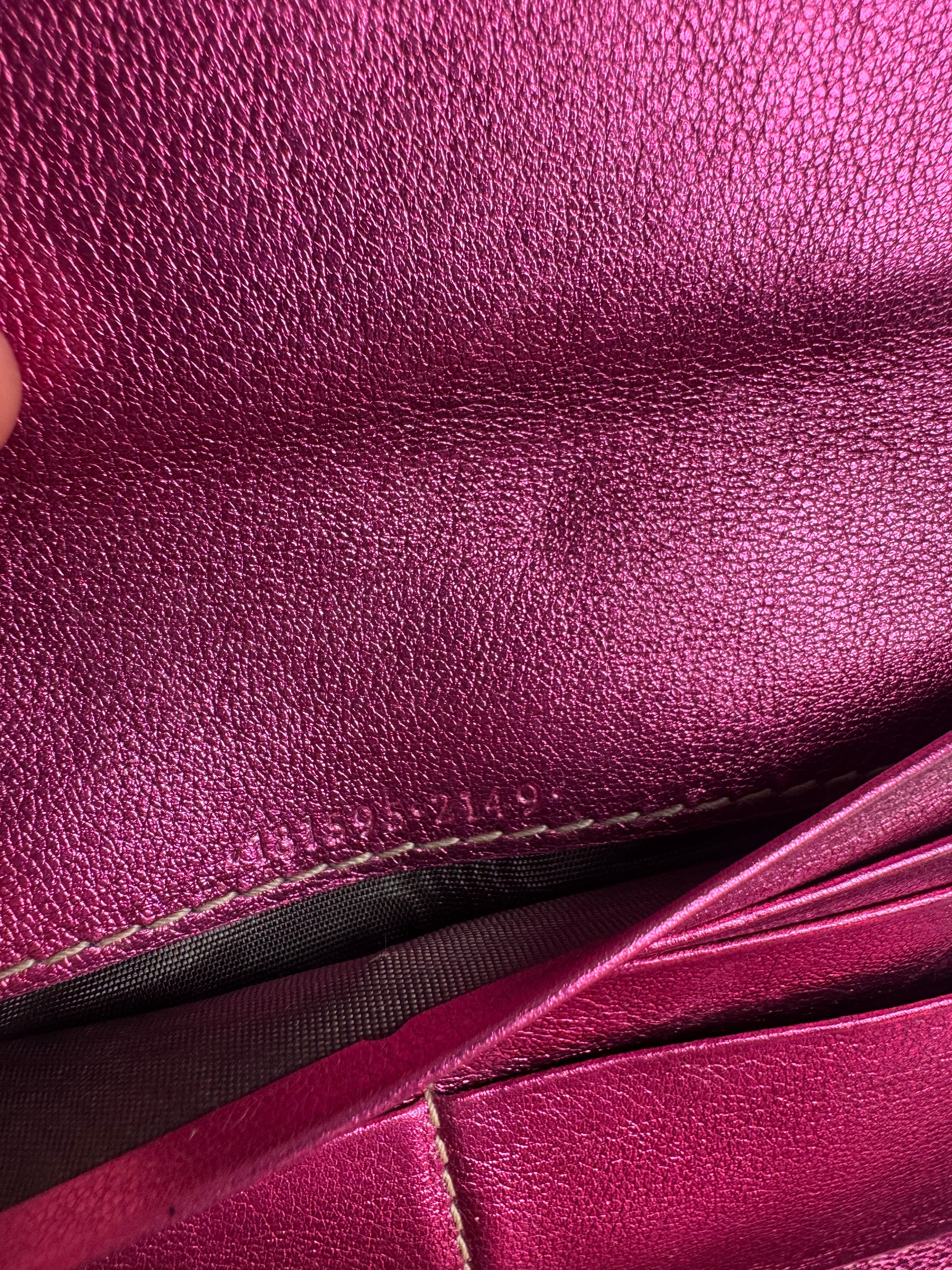 This elegant wallet is finely crafted of beige-brown Gucci monogram canvas with metallic purple leather trim. The front is accented with the iconic interlocking GG logo in gold-tone steel, a hallmark of the house since the 1960s that has come to symbolize Gucci's heritage and timeless luxury. The piece features a snap button closure and opens to a metallic purple leather interior. The wallet comes with a Gucci shopping bag.