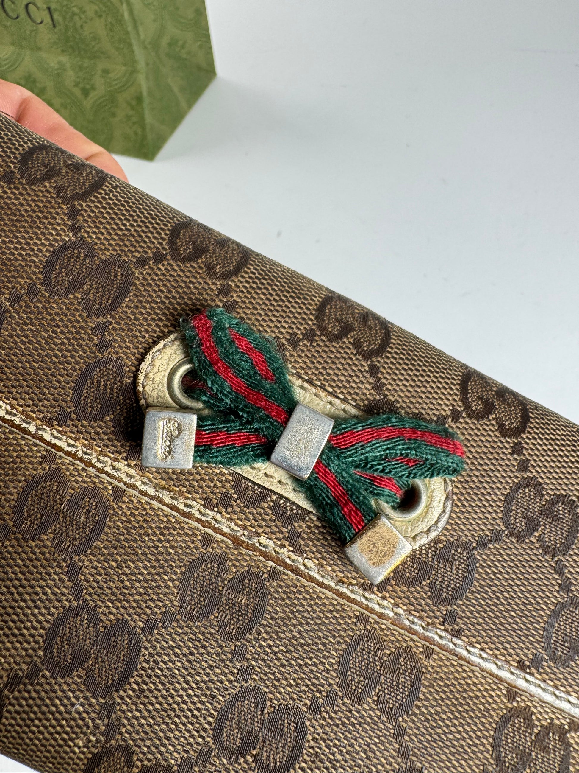 GUCCI Vintage Beige-Brown Monogram Wallet with Ribbon Detail. This charming vintage wallet is crafted from beige-brown Gucci monogram canvas and features a red and green striped ribbon appliqué on the front. The trim and interior are made of white leather, with additional black canvas elements inside. Made in Italy, this piece comes with an original Gucci shopping bag.