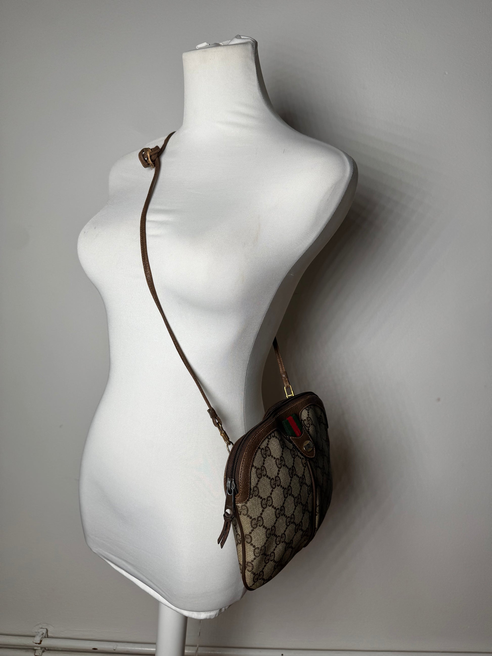 Vintage Gucci Monogram Leather Shoulder Bag Grey Brown