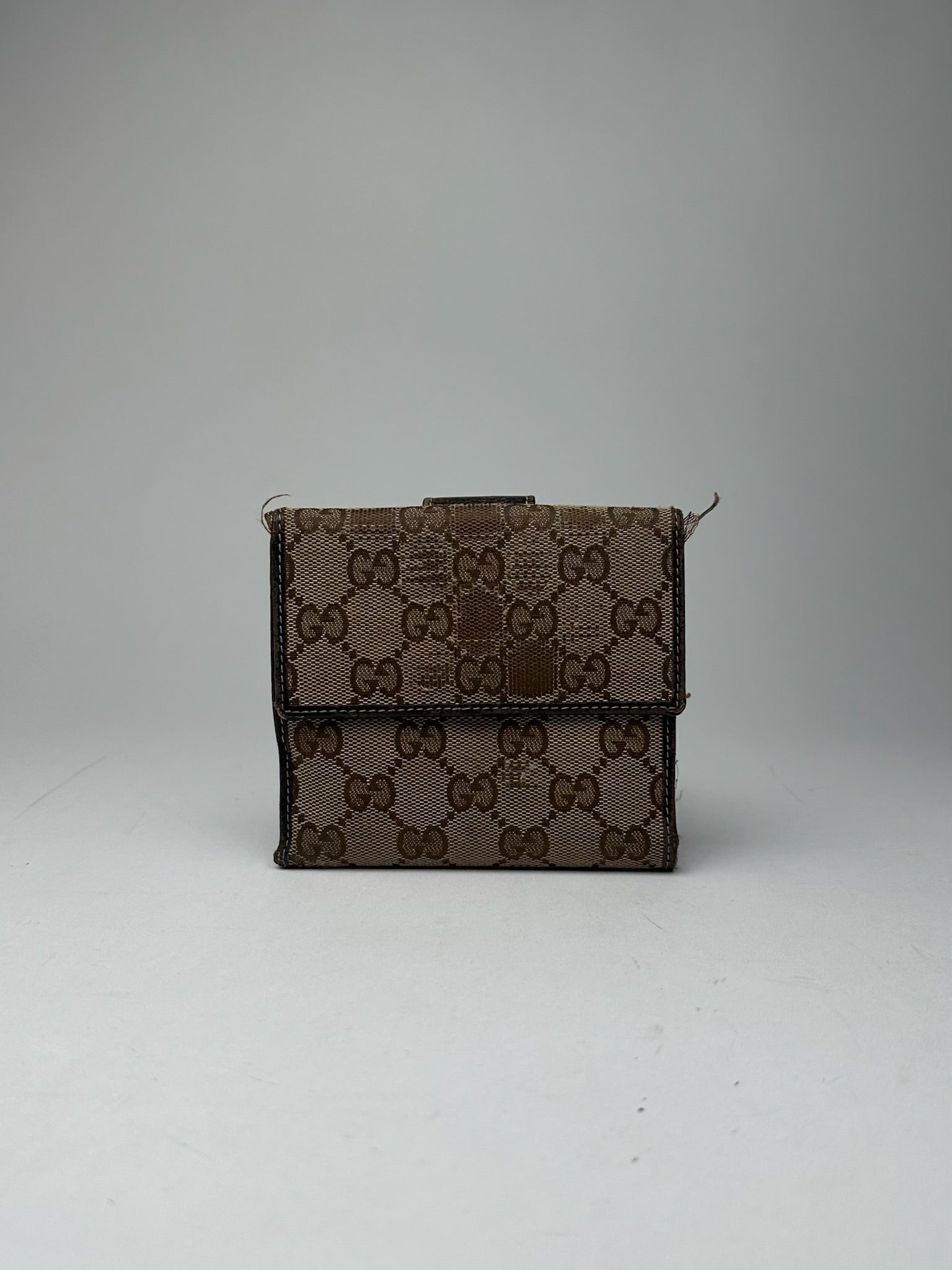 GUCCI vintage wallet. This classic wallet is finely crafted from beige-brown canvas featuring the iconic Gucci monogram, with dark brown leather trim. It includes gold-tone steel hardware and is designed for unisex use. The interior is lined with matching dark brown leather. Made in Italy.