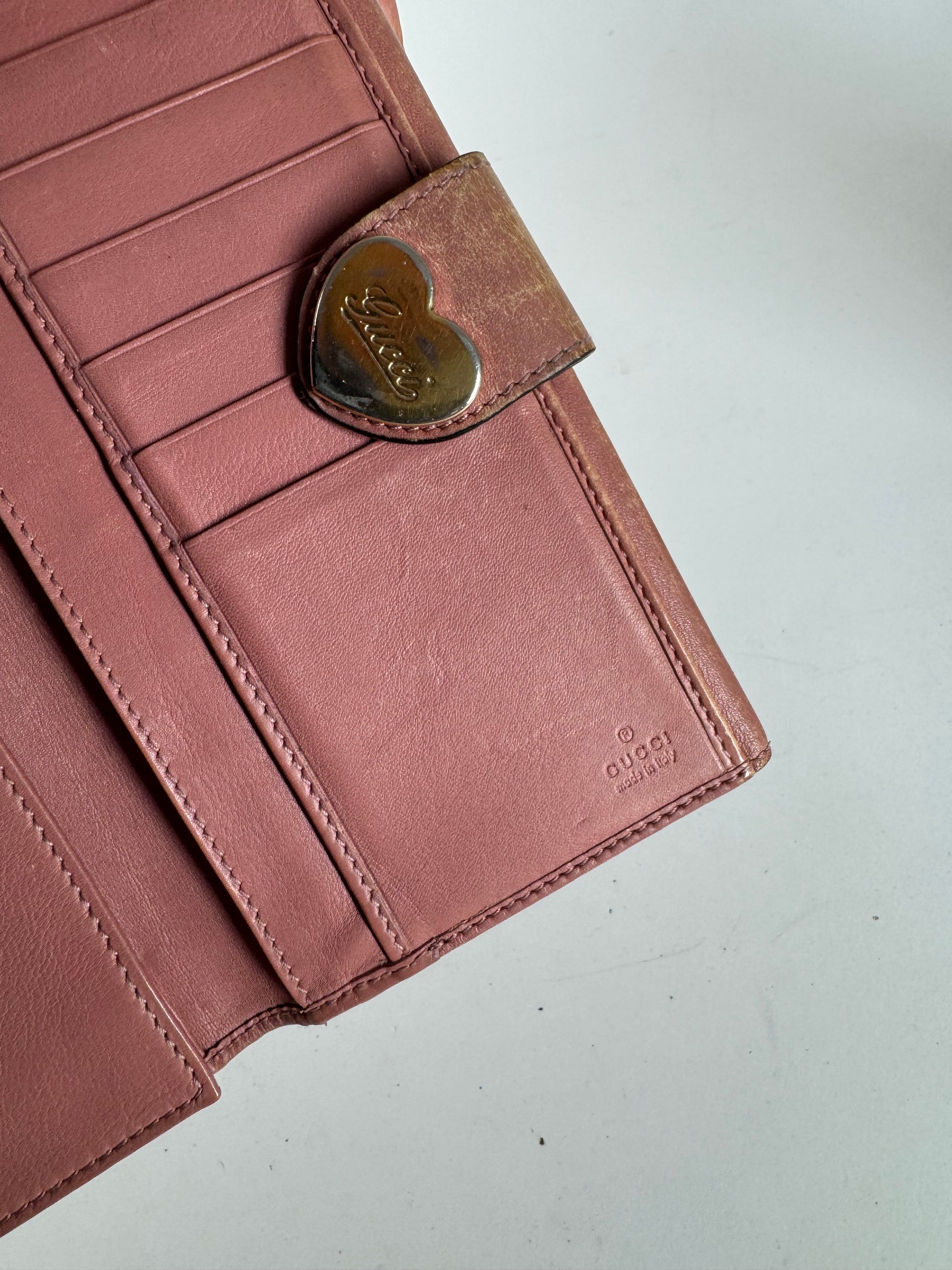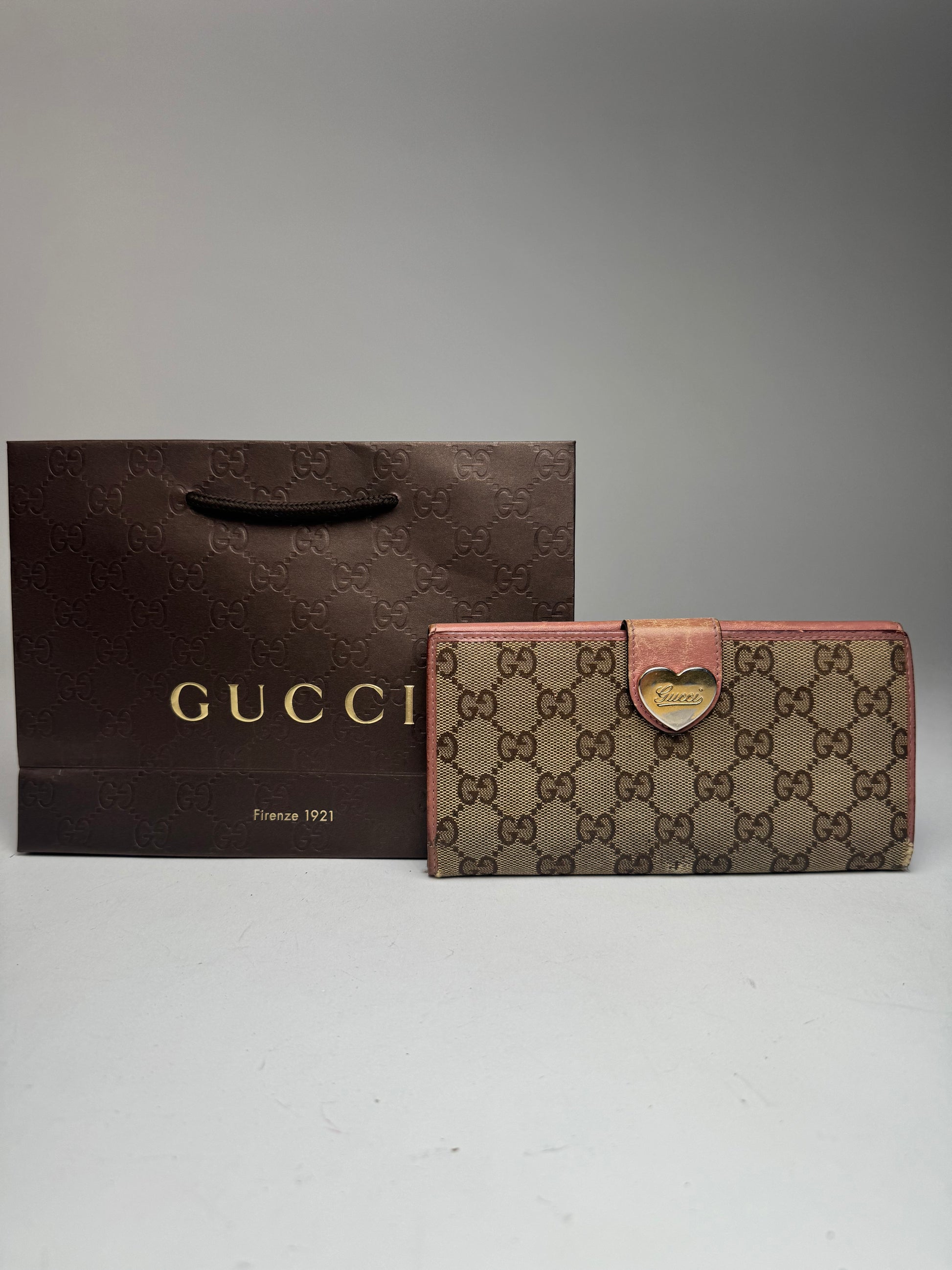 GUCCI vintage wallet. This vintage Gucci wallet is crafted from beige monogram canvas , featuring gold-tone hardware and a striking pink leather interior . Made in Italy , it remains in very good condition , although the snap button does not function perfectly. The wallet comes with the original Gucci shopping bag .