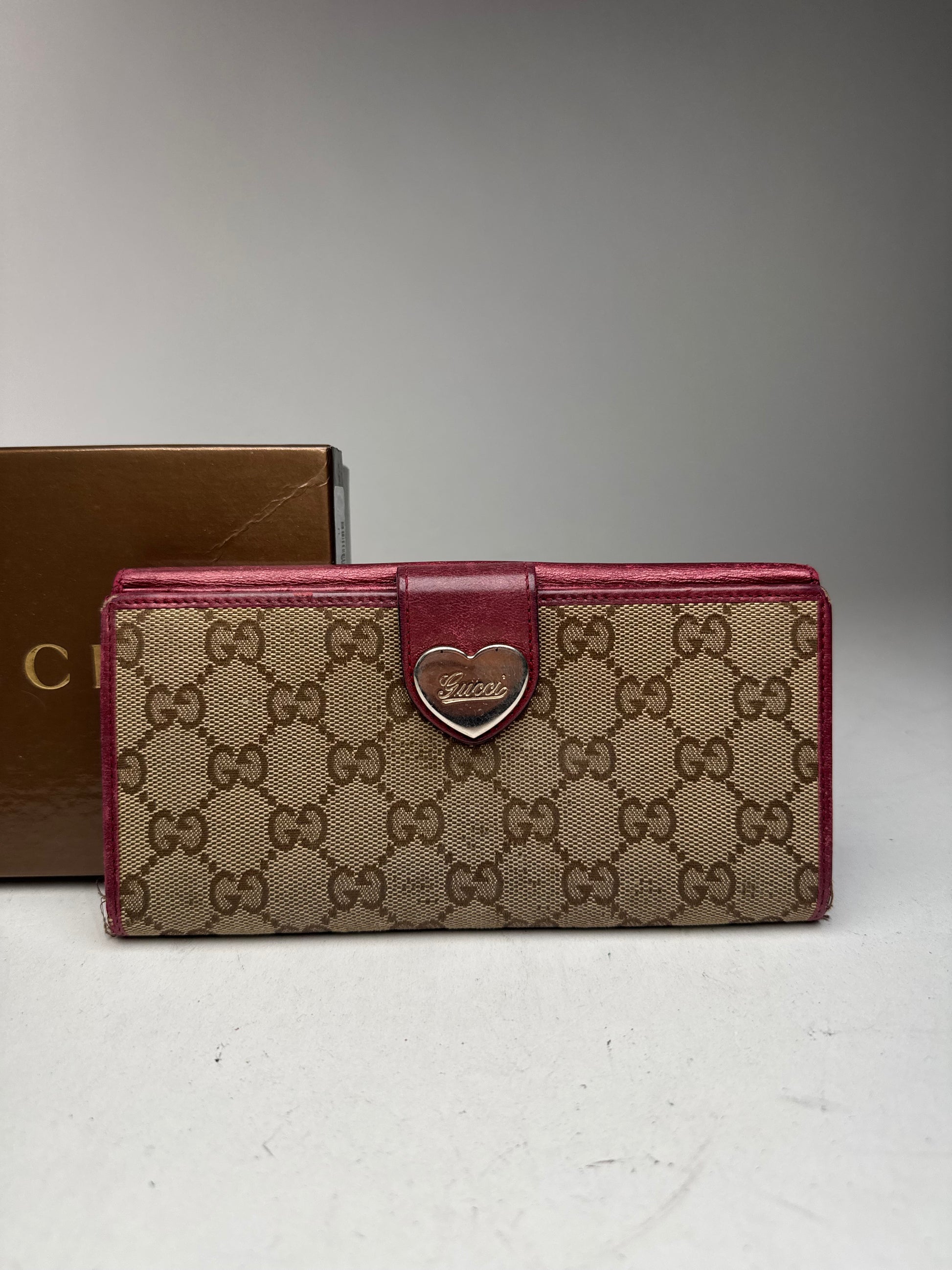 GUCCI Vintage Monogram Wallet. This vintage wallet is finely crafted of beige canvas with the classic brown Gucci monogram. The front is adorned with a gold-toned steel heart logo engraved with the Gucci signature above a snap closure. The interior is finished in a metallic purple leather with compartments for cards and bills.