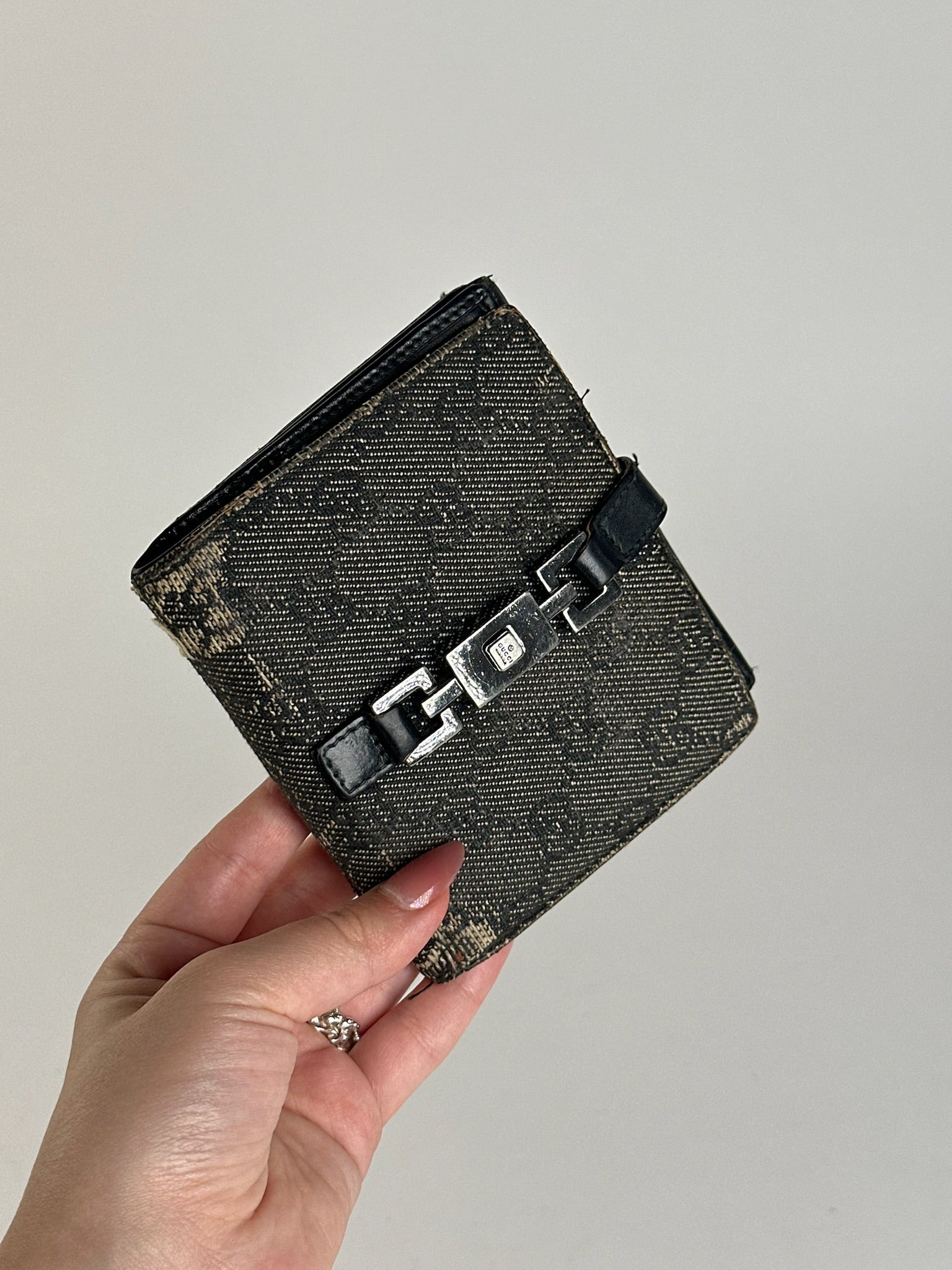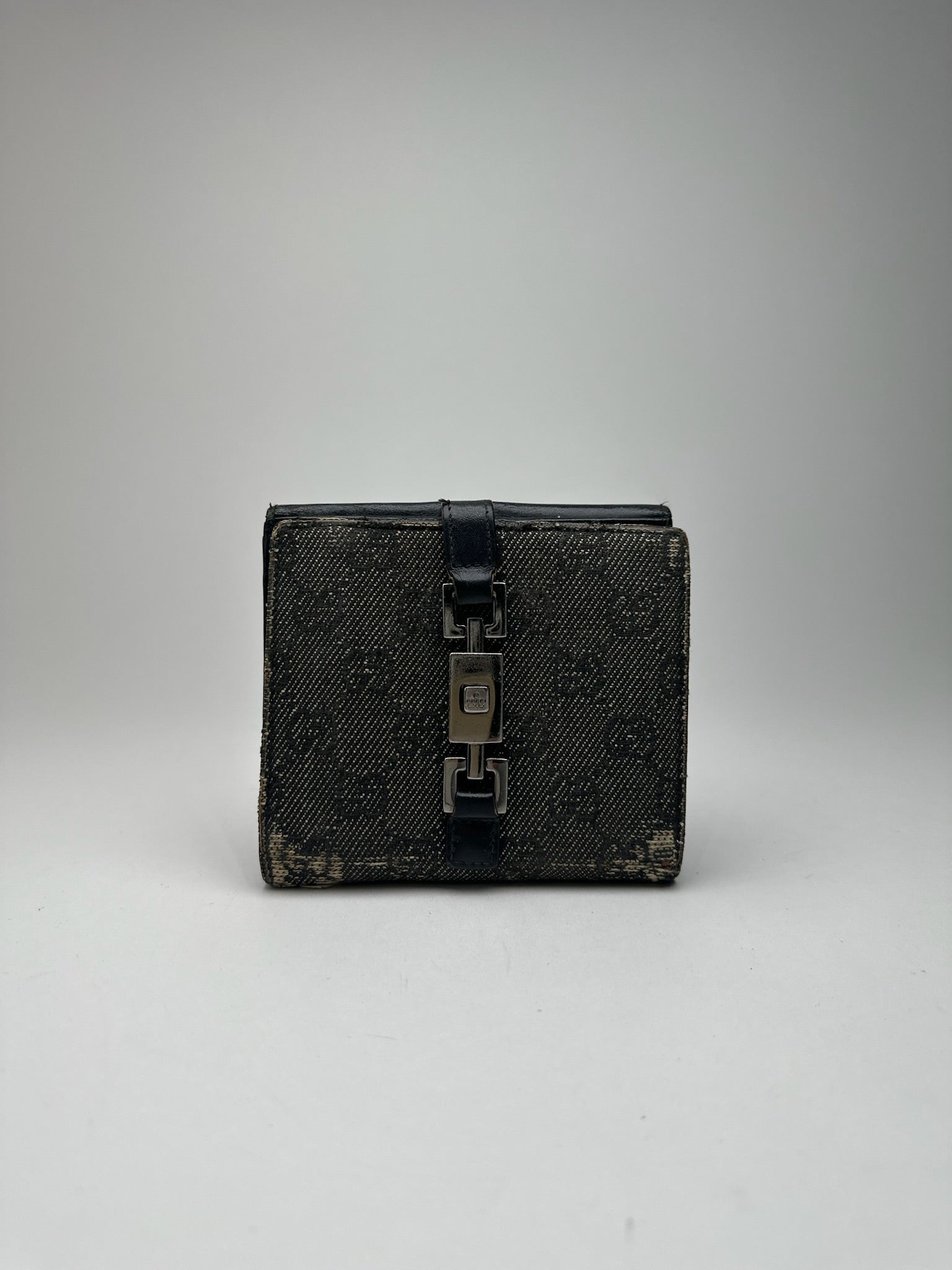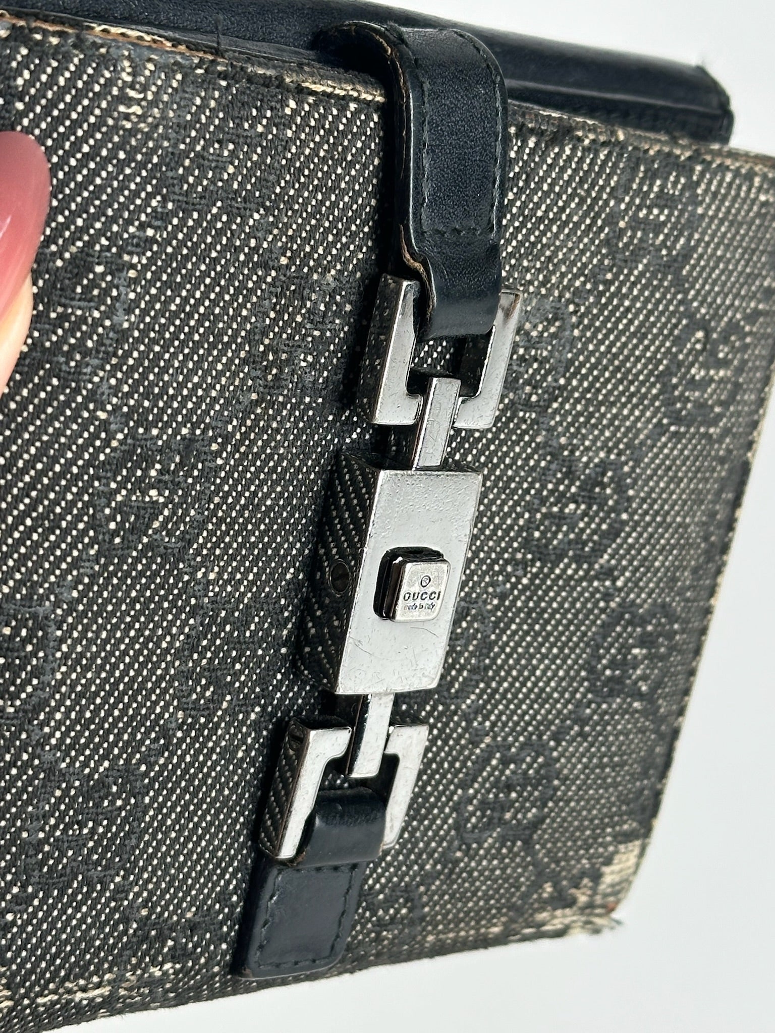 GUCCI Vintage Jackie Monogram Wallet. This chic wallet is finely crafted of black and gray Gucci monogram canvas. The accessory features silver-tone steel hardware and black leather lining and interior.