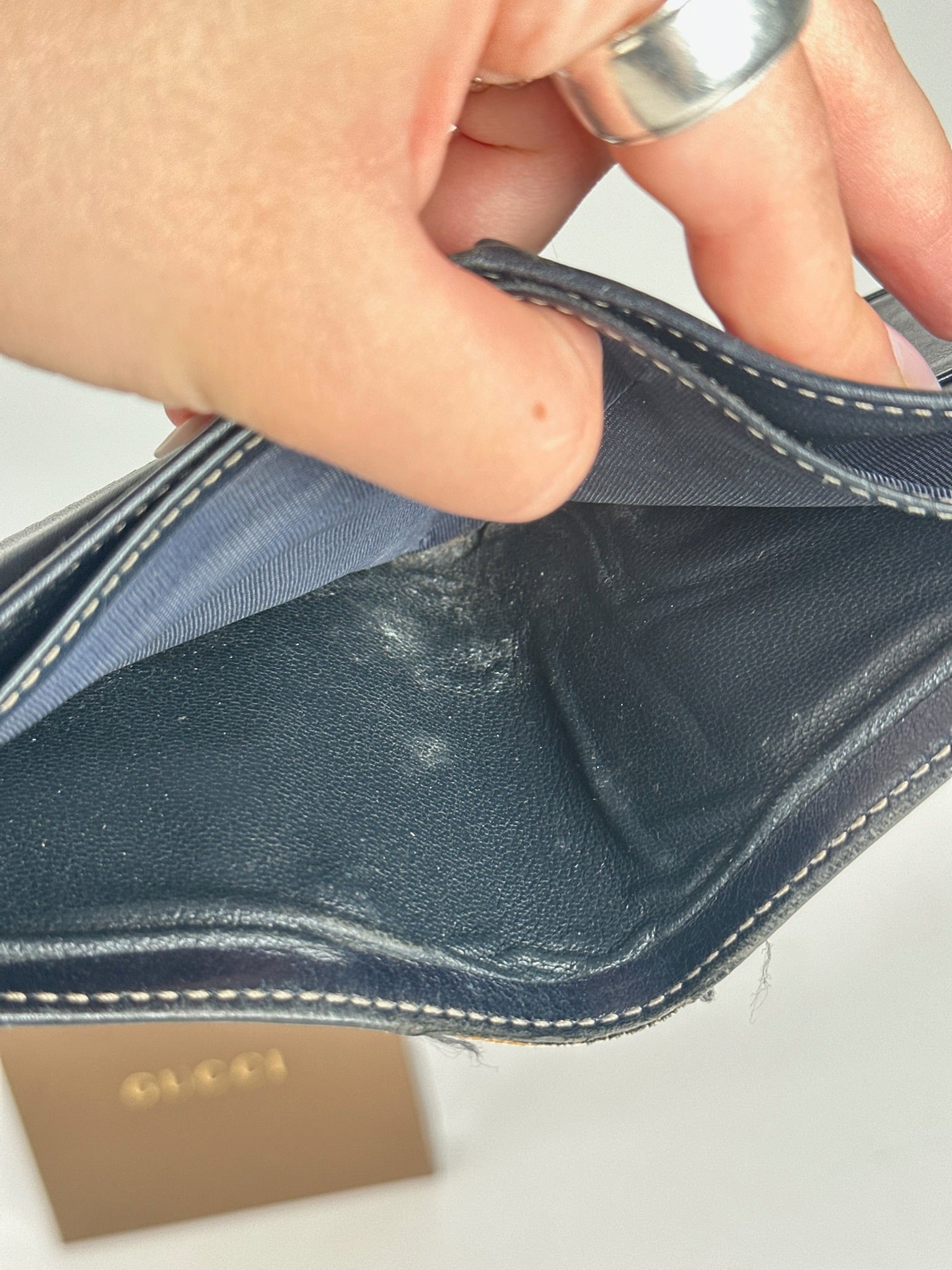GUCCI Vintage Ophidia Wallet. This chic wallet is finely crafted of black leather and grey-black Gucci Ophidia monogram canvas. It features a coin compartment and is finished with navy leather and canvas lining. The interior is lined with black leather.