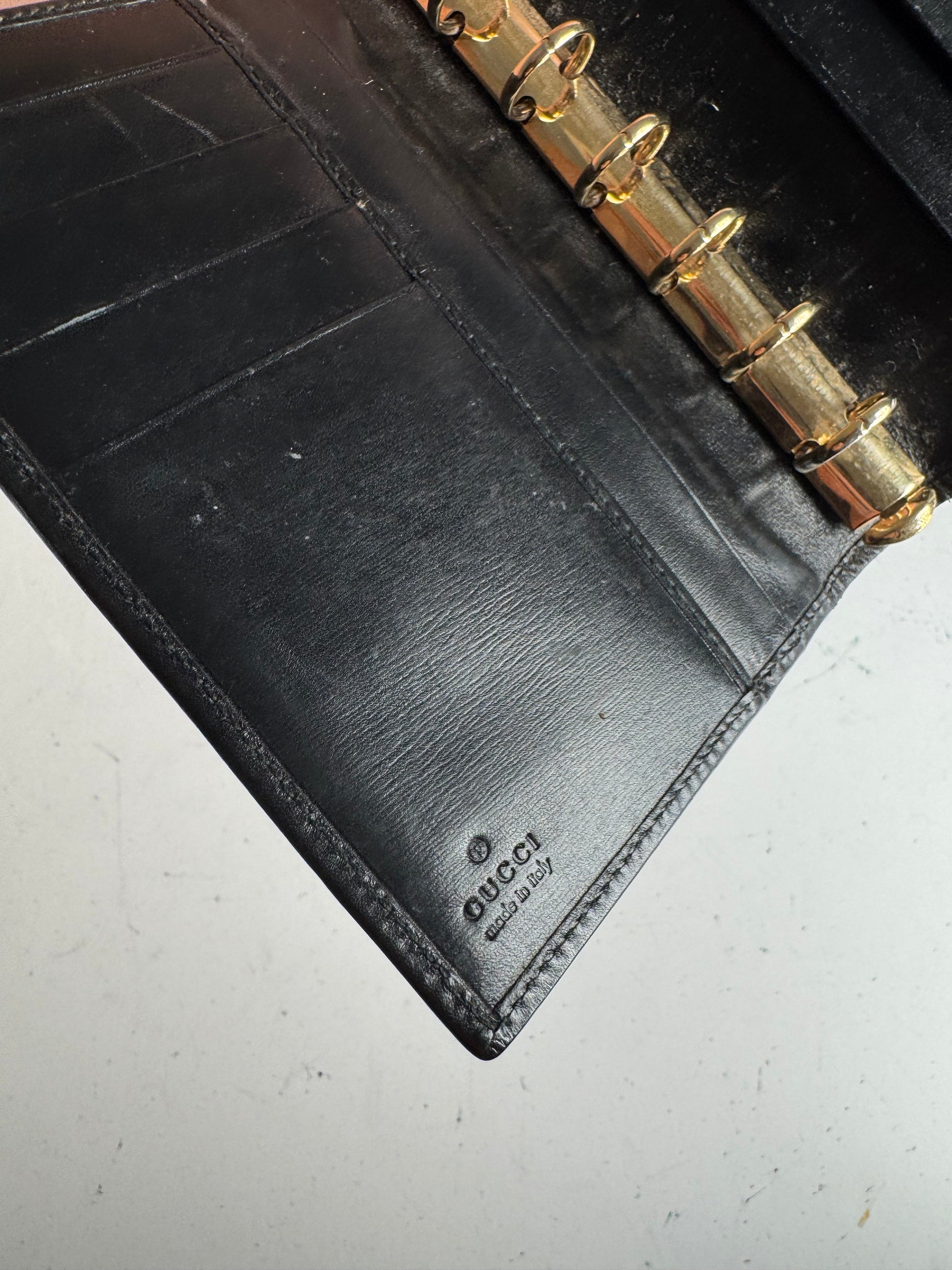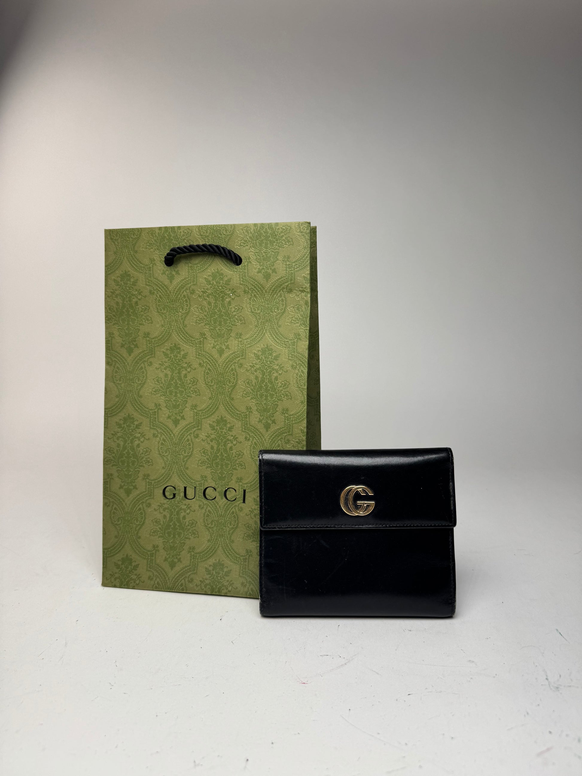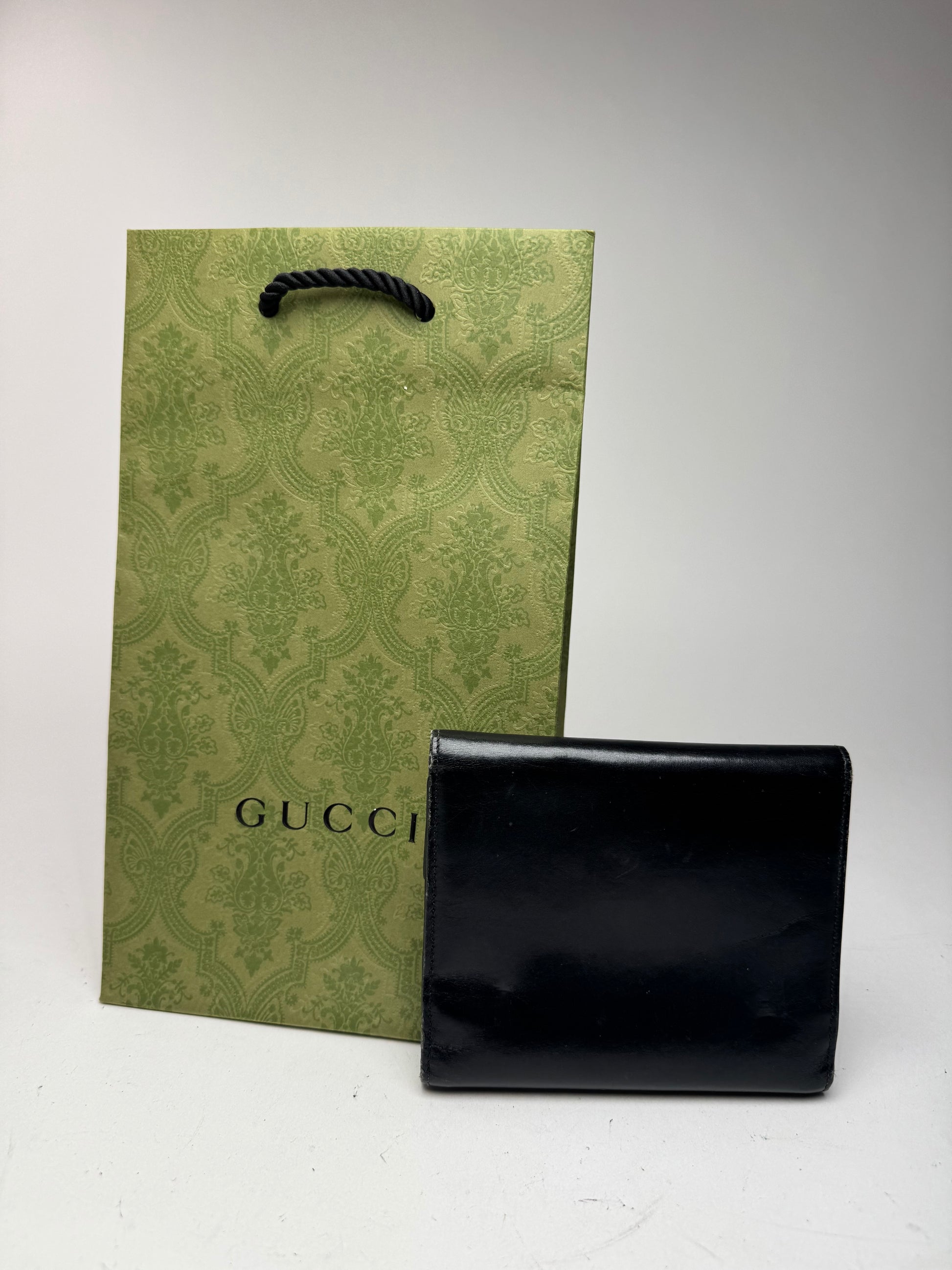 This elegant organizer wallet is finely crafted of black glossy leather and features a polished gold-tone steel GG logo on the front with a snap button closure. The GG emblem, first introduced in the 1960s, has become one of Gucci's most iconic house symbols, representing the initials of founder Guccio Gucci. The interior is fitted with compartments for cards, a bill slot, and a small ring binder.