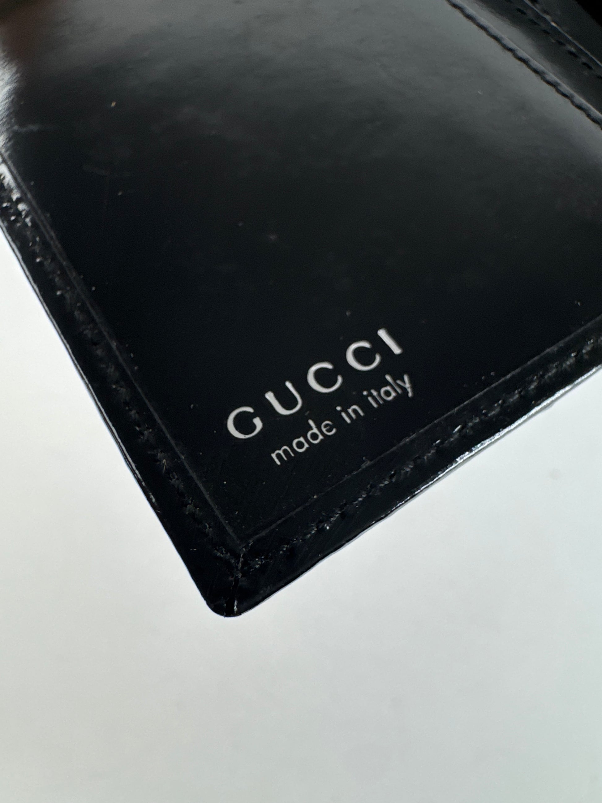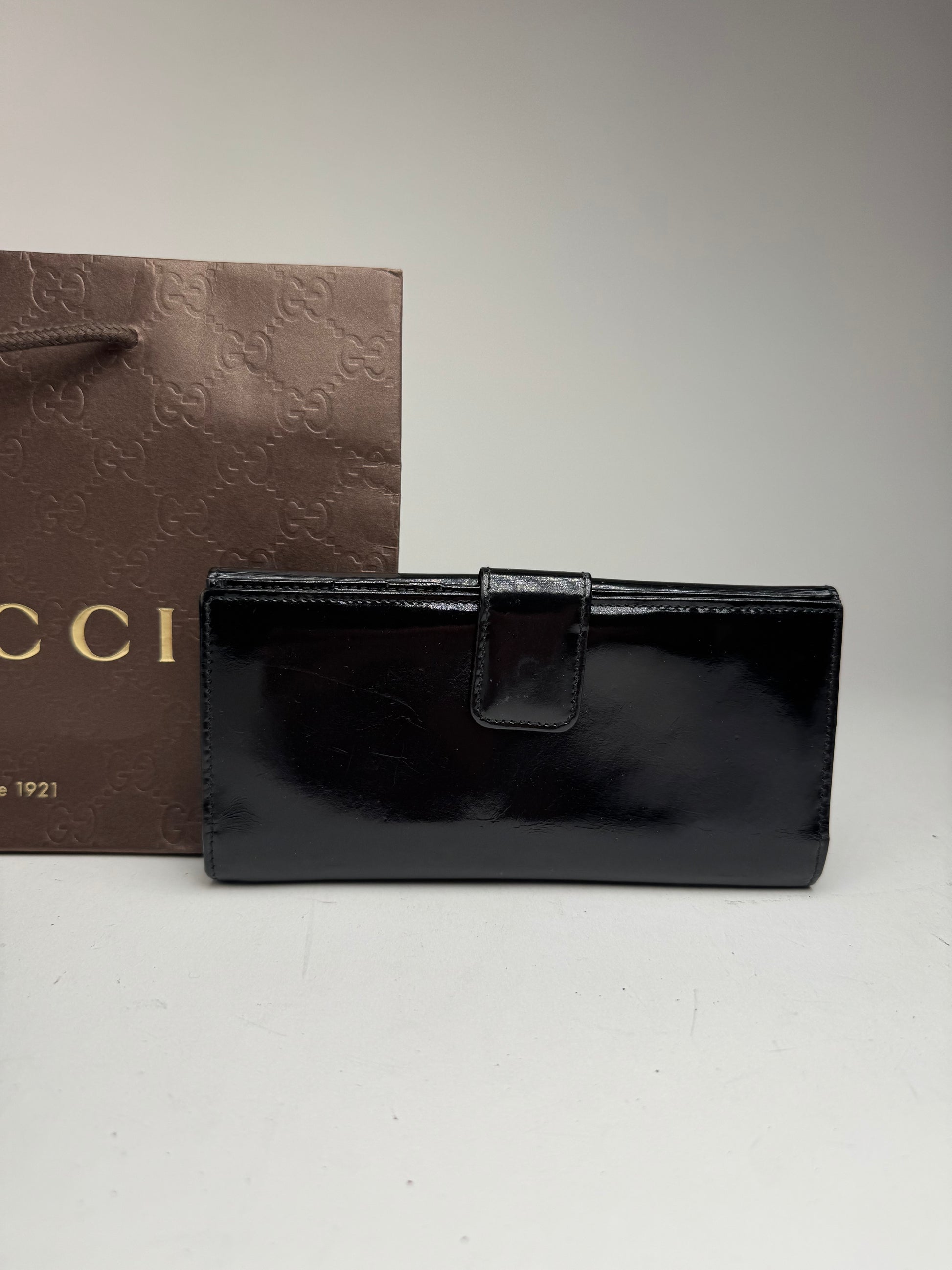 GUCCI Vintage Horsebit Wallet. This sleek wallet is crafted of glossy black patent leather. The front is adorned with two silver-tone steel Horsebit pieces – an iconic Gucci emblem originally inspired by equestrian heritage, first introduced in the 1950s and now a hallmark of the brand. The interior matches the exterior in patent leather. Made in Italy.