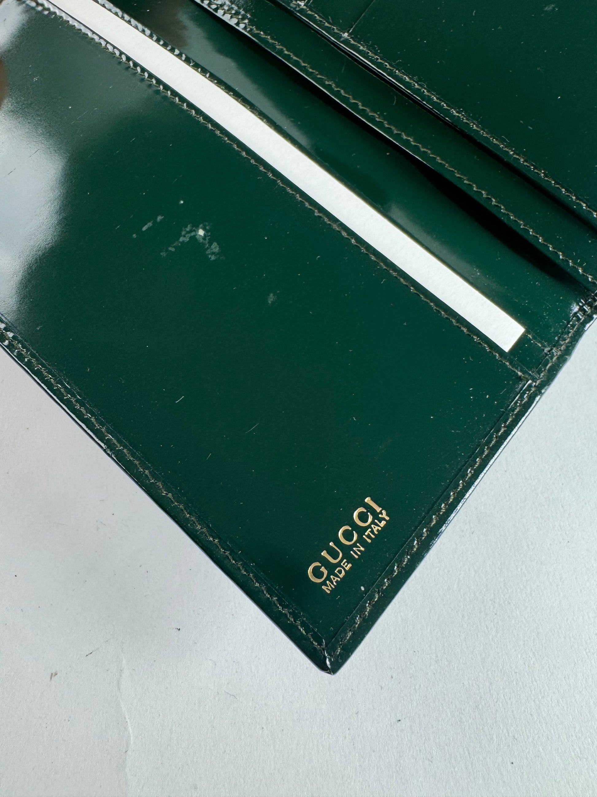This chic vintage wallet is finely crafted of dark green patent leather. The wallet features a polished gold-tone Gucci logo on the front and snap button closures on both the front and back. The interior is lined with leather and includes functional compartments.