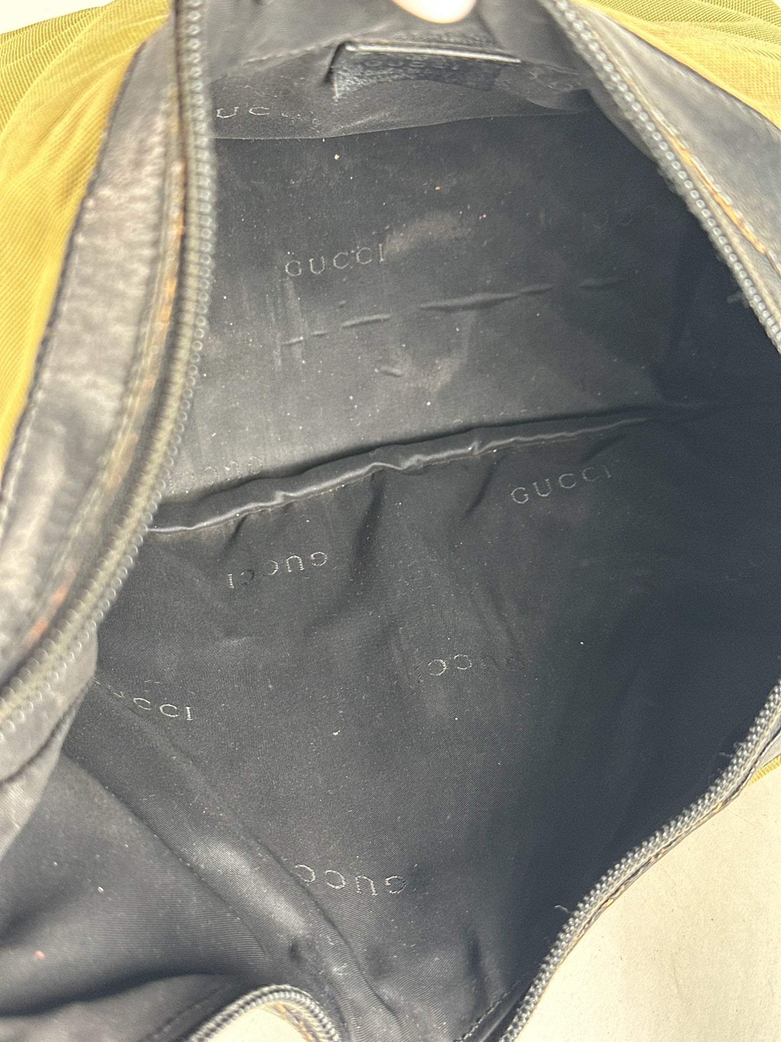 GUCCI Vintage Bamboo Handle Canvas Bag. This chic handbag is finely crafted of khaki-colored canvas with black leather trim. The bag features a black bamboo top handle, steel hardware, and an open top. The interior is lined in black polyester with Gucci lettering.