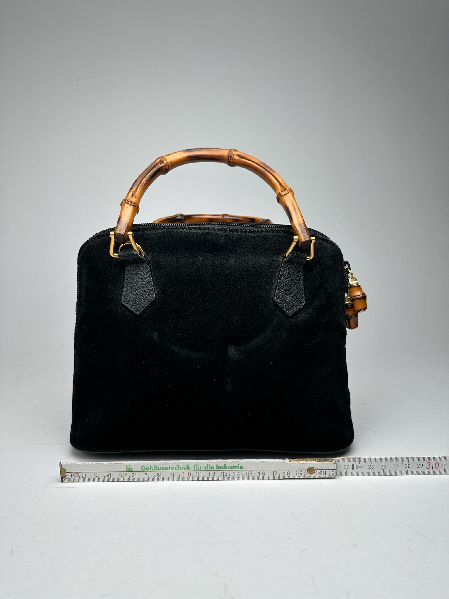 Condition Details: The exterior suede and leather are clean and well-kept with minor scratches. The bamboo handles are in great condition. The hardware is shiny with light signs of wear. The interior lining is in excellent shape.