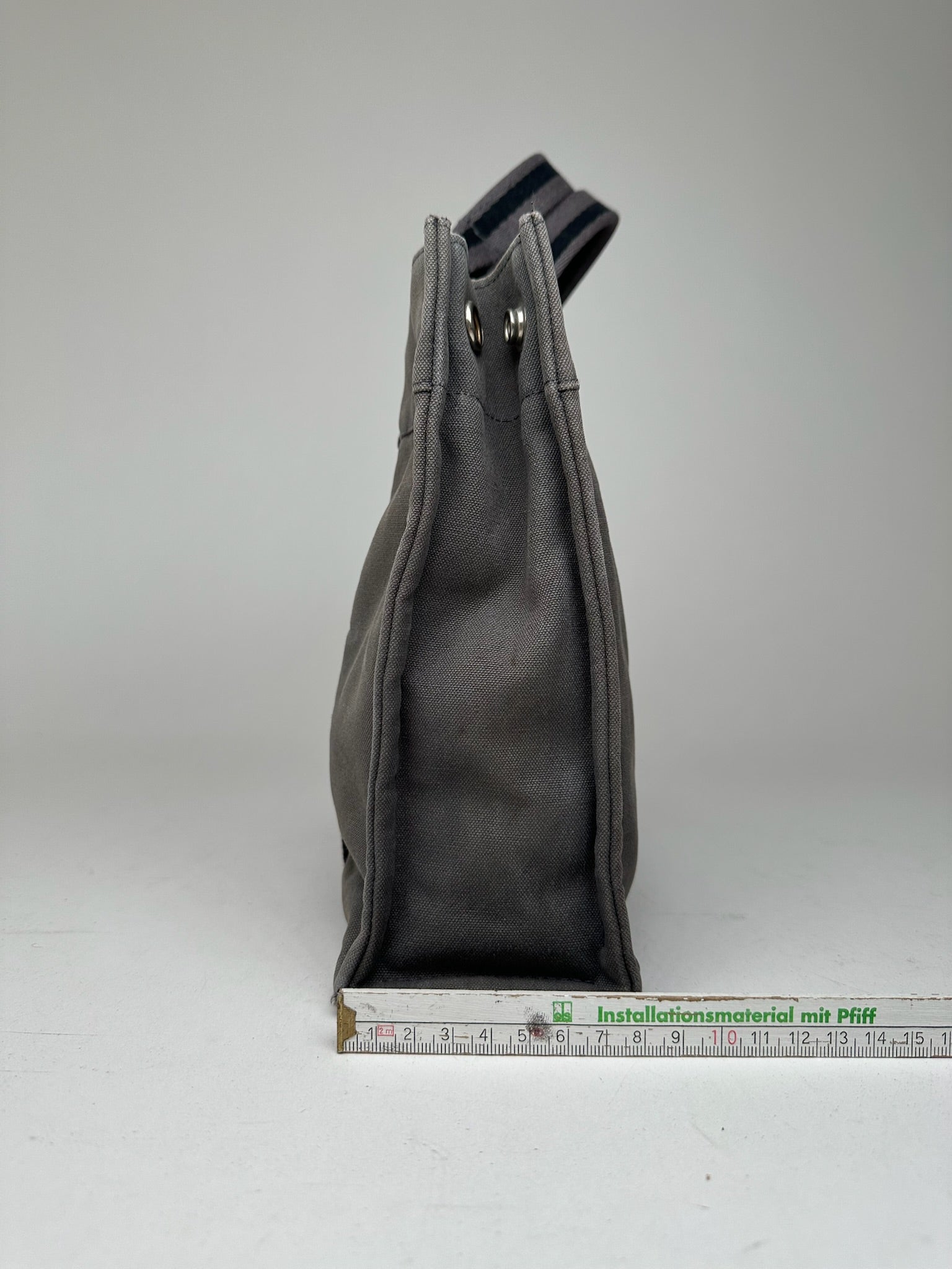 HERMÈS vintage canvas shopper. This chic handbag is finely crafted of gray 100% canvas. The shoulder bag features gray and black striped handles and silver-tone steel hardware.