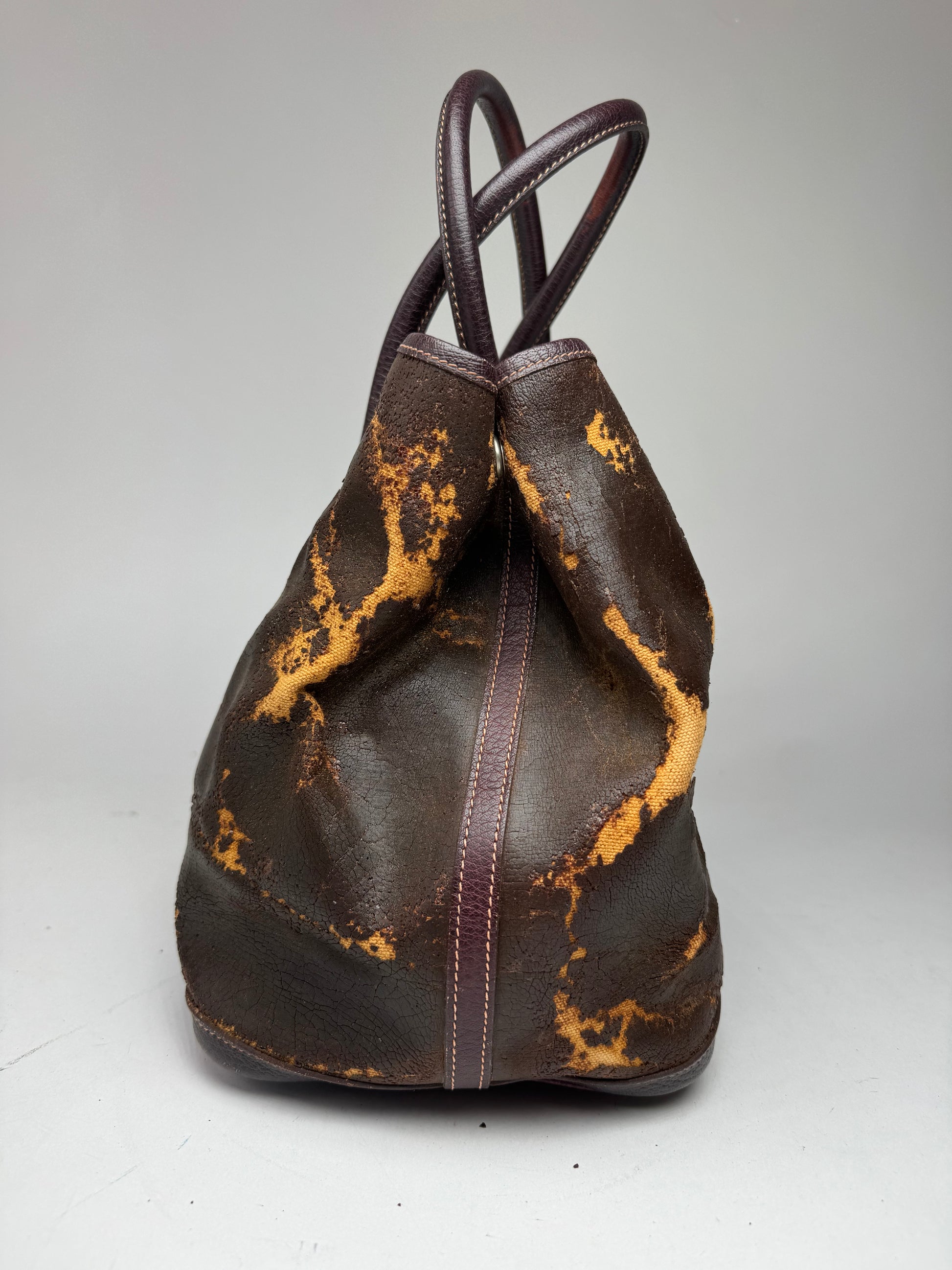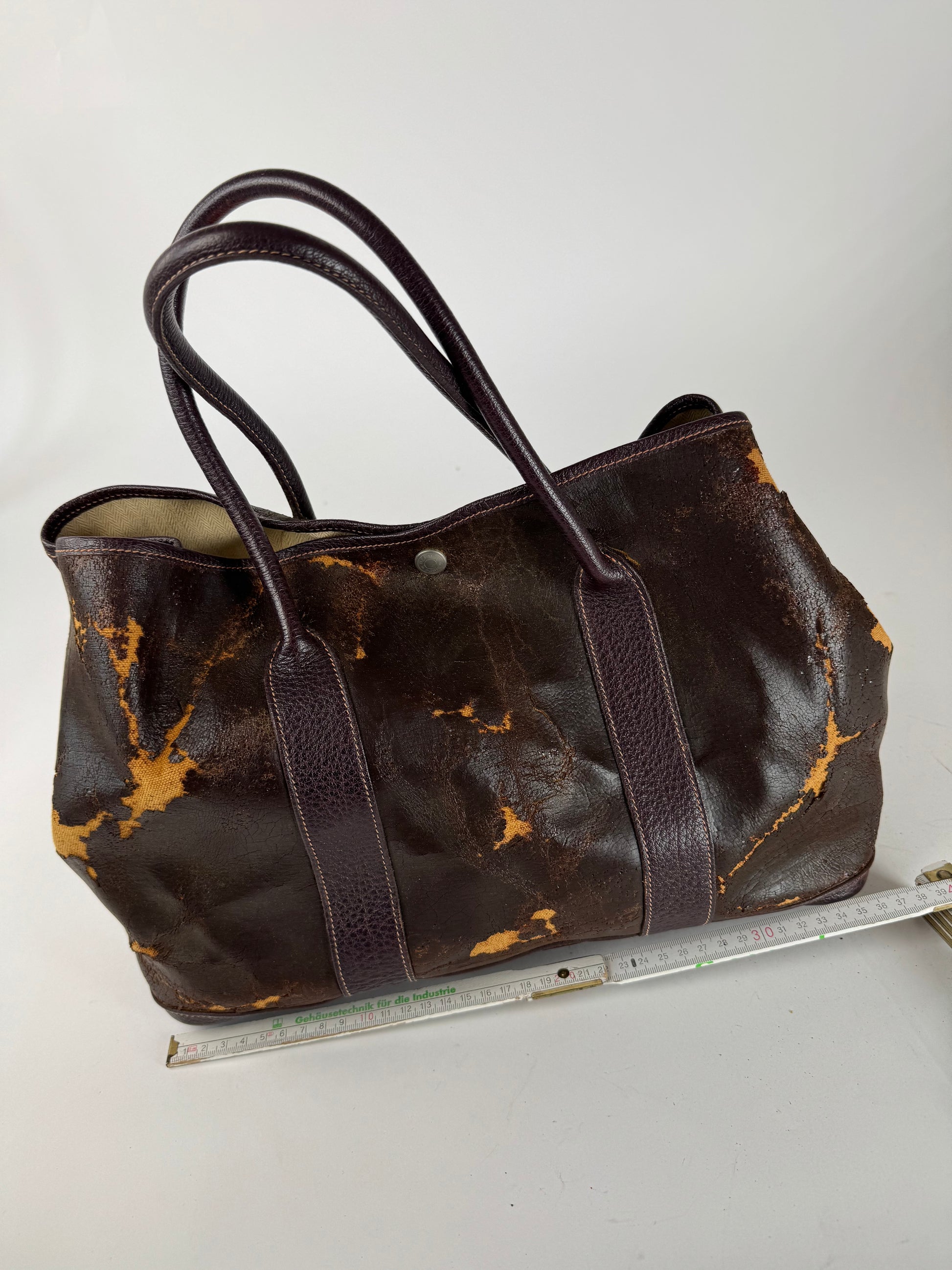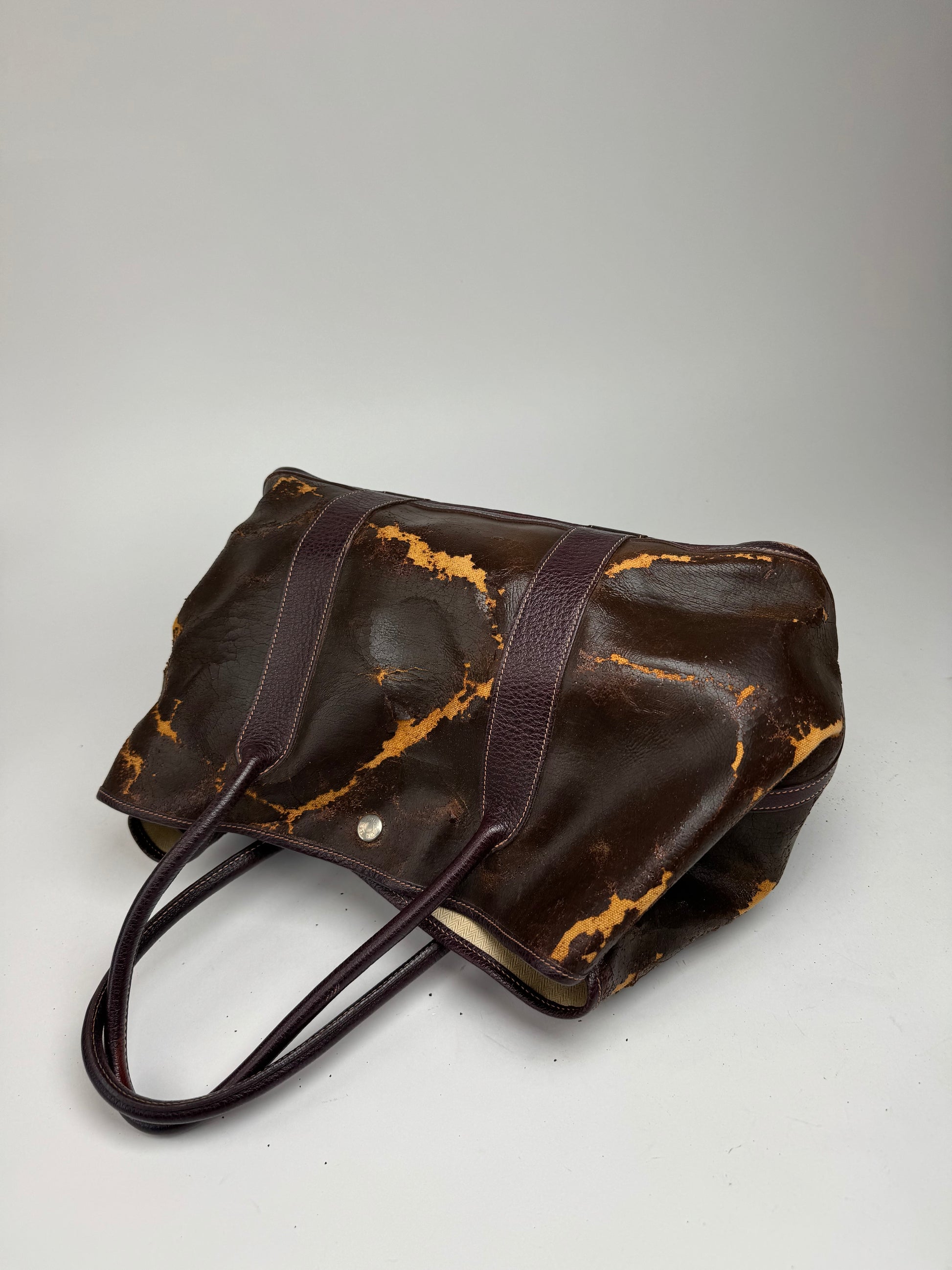 This vintage Hermès Garden Party shopper is crafted from a combination of materials, featuring a unique layered effect. The top brown layer is brittle and peeling, revealing a striking orange canvas underneath. The base is made of purple leather, adding a bold contrast. The bag features brown leather handles, silver-toned hardware, and a beige interior, offering a refined and timeless design.