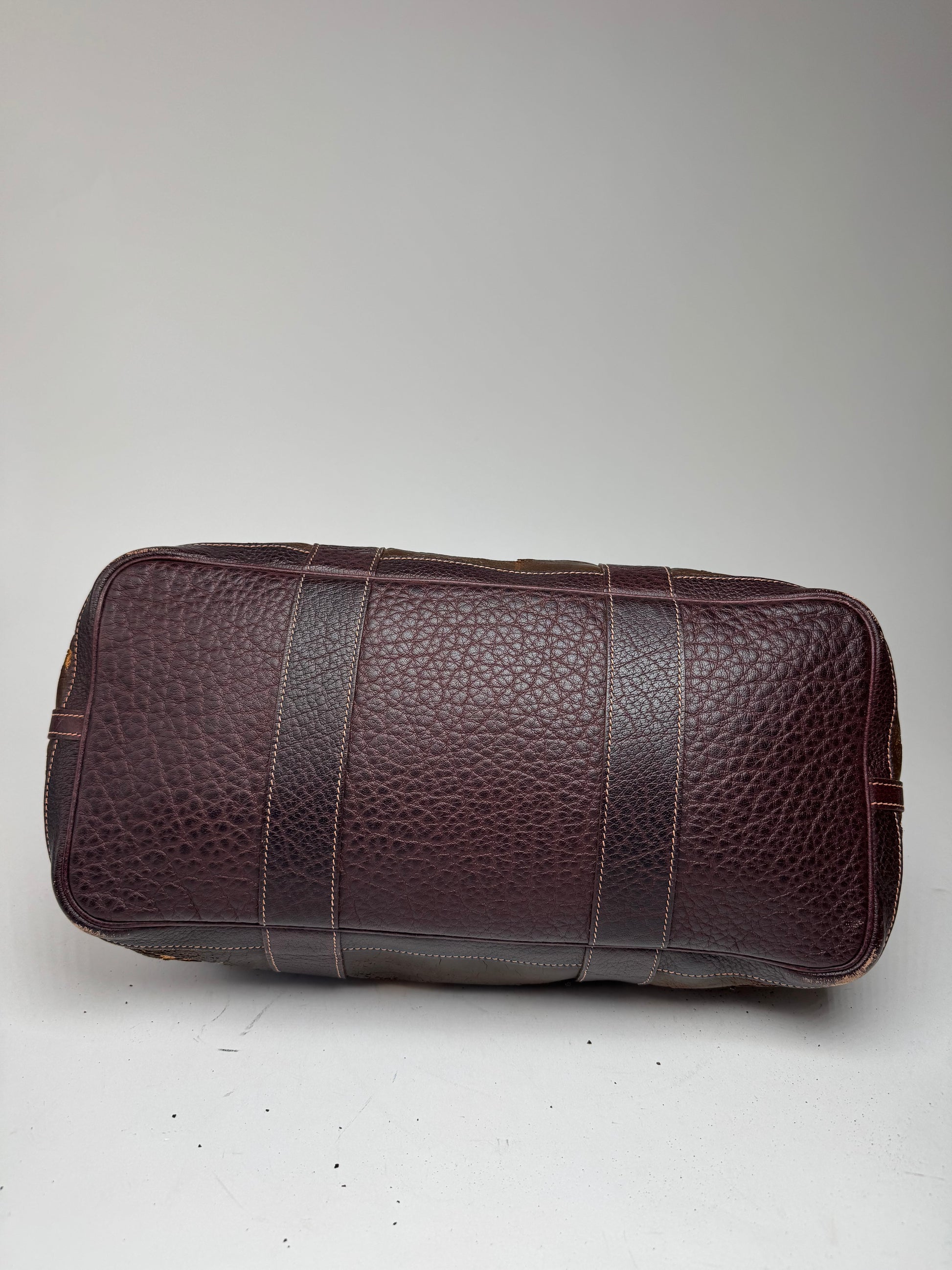 Condition Details: The exterior brown layer is brittle and peeling, but the underlying orange canvas remains intact. The bag could easily be restored by removing the top layer. The interior is in good condition with minor signs of wear. The silver-toned hardware remains bright.