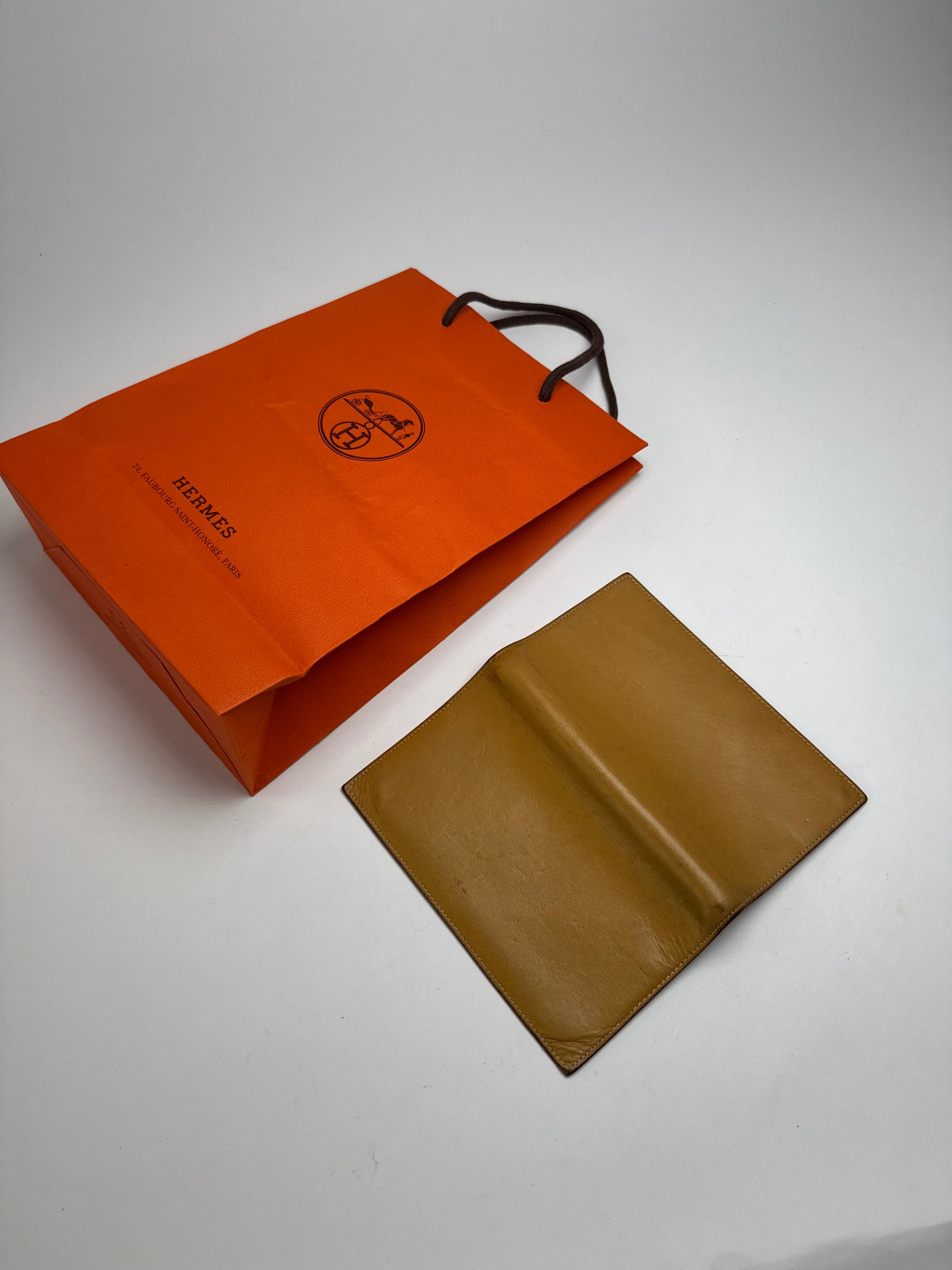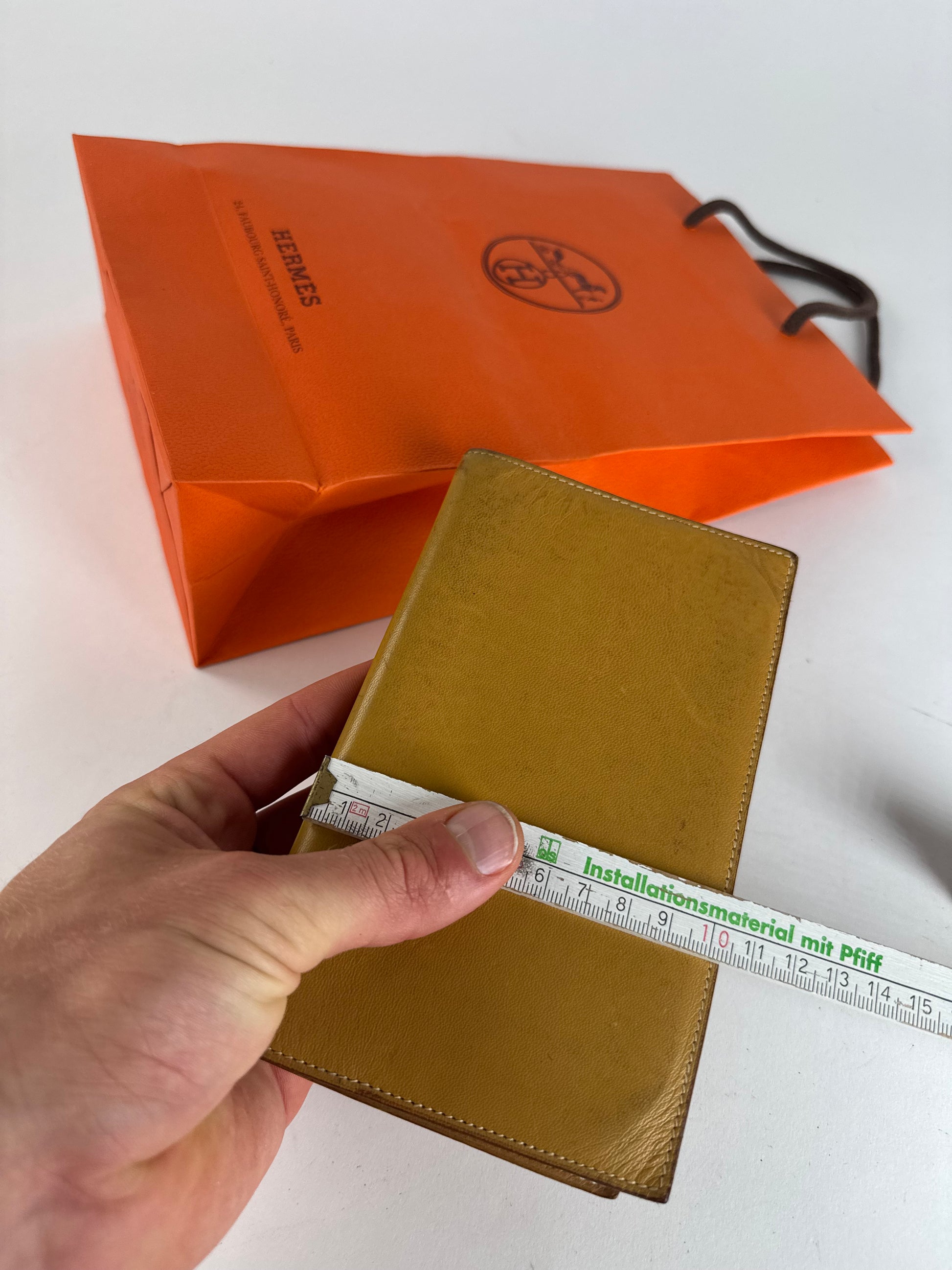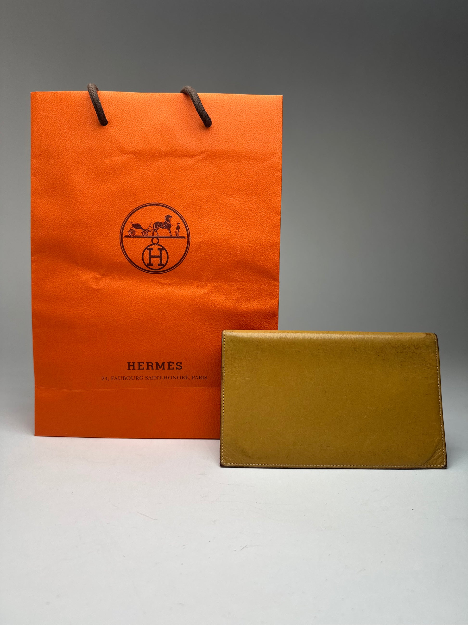 This sophisticated vintage card holder by Hermès is finely crafted from mustard yellow leather with silver-tone steel hardware. A timeless and elegant accessory, perfect for organizing cards and documents.