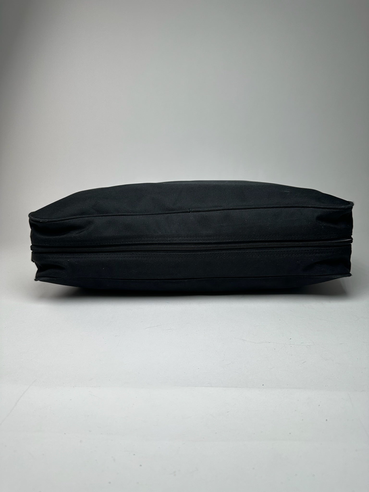 ISSEY MIYAKE Black Canvas and Leather Vintage Bag. This chic handbag is finely crafted of black canvas with black leather trim. The shoulder bag features dual black leather handles, an optional adjustable and removable shoulder strap, and black steel hardware. The top opens with a zipper to a spacious interior with multiple compartments lined in gray polyester.