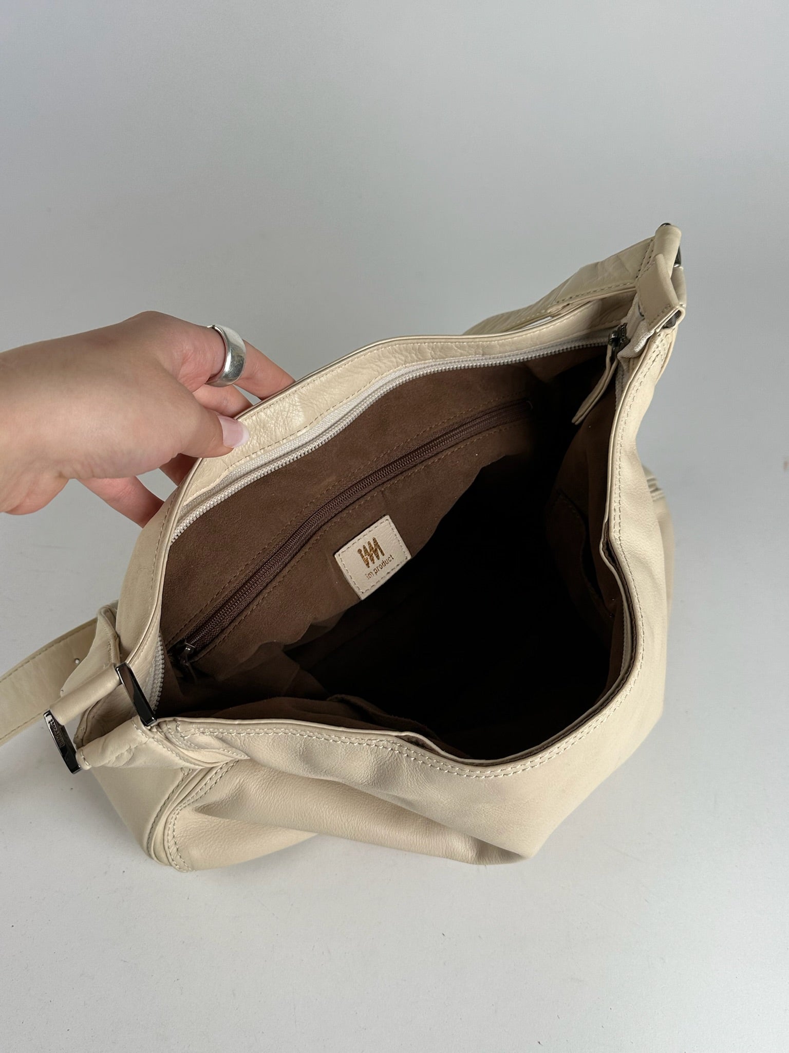 ISSEY MIYAKE Vintage Leather Handbag. This chic handbag is finely crafted of cream-colored leather. The shoulder bag features a single handle that can be adjusted into a shoulder strap, anthracite-tone steel hardware, and a top zipper. The interior is lined with brown canvas.