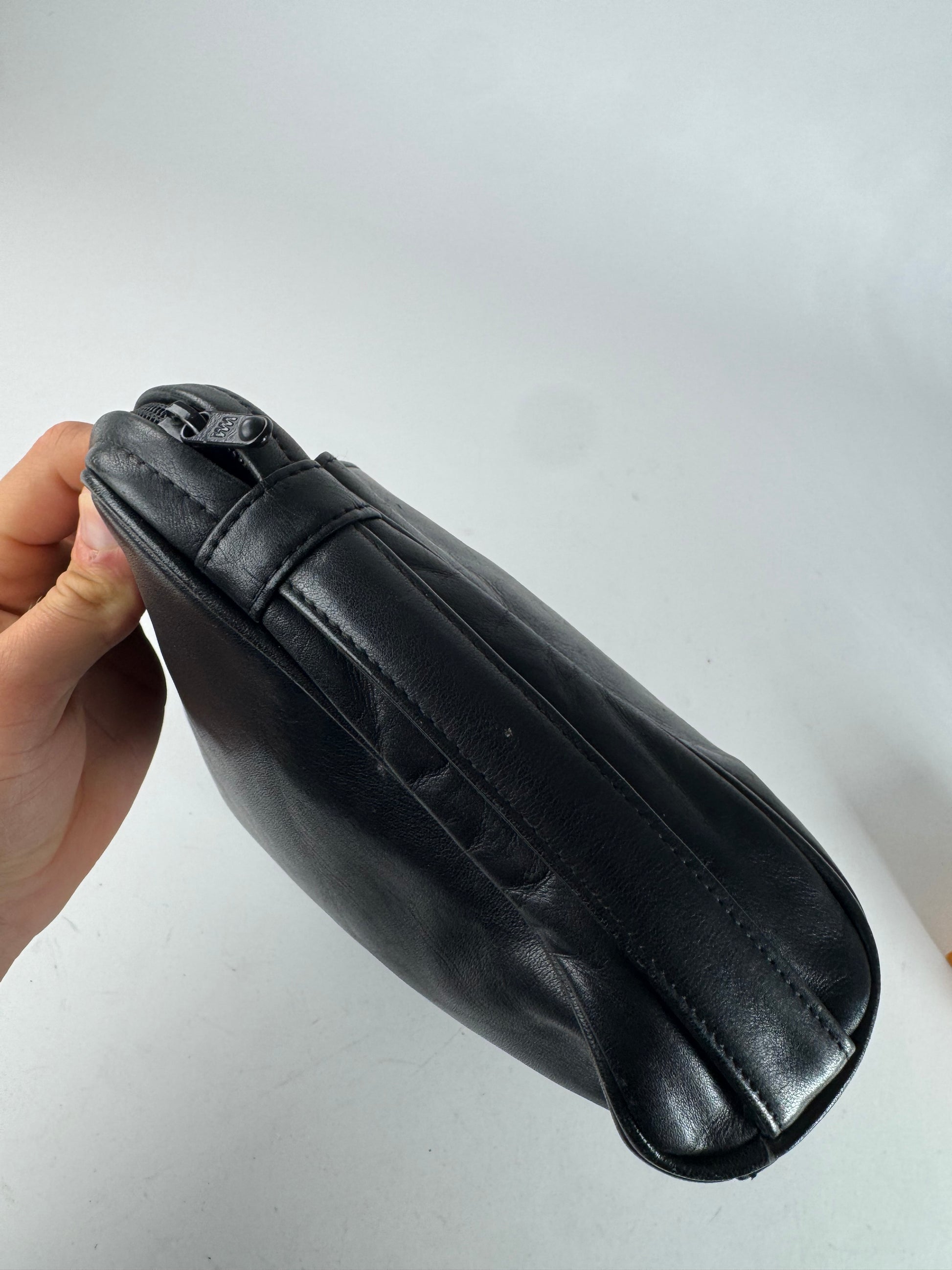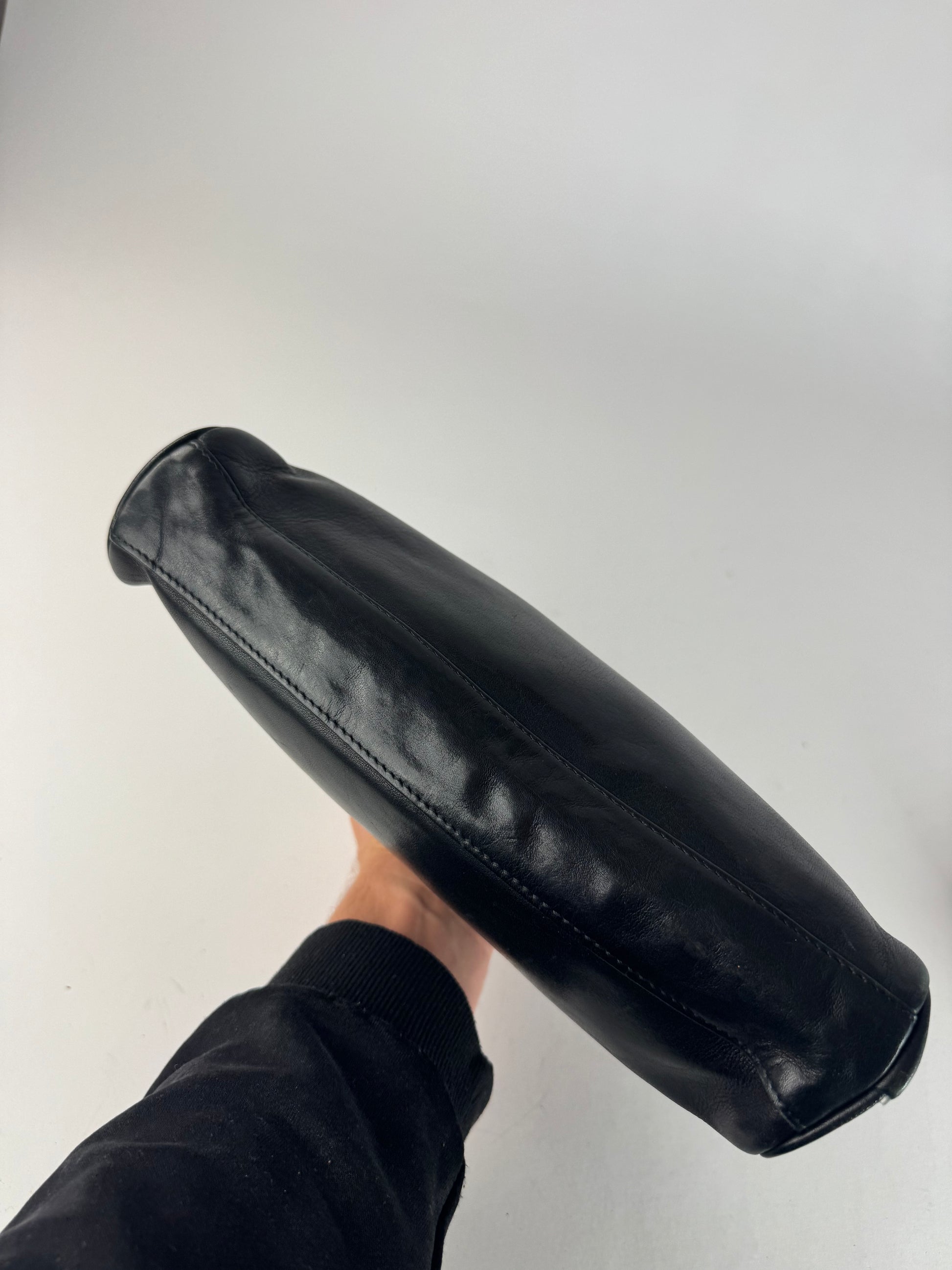 ISSEY MIYAKE Vintage Leather Clutch. This minimalist vintage clutch is crafted from black leather and features a clean, functional silhouette characteristic of Issey Miyake’s innovative design approach. Likely dating back to the 1980s, the piece reflects the brand’s early experimentation with form, utility, and understated avant-garde aesthetics.