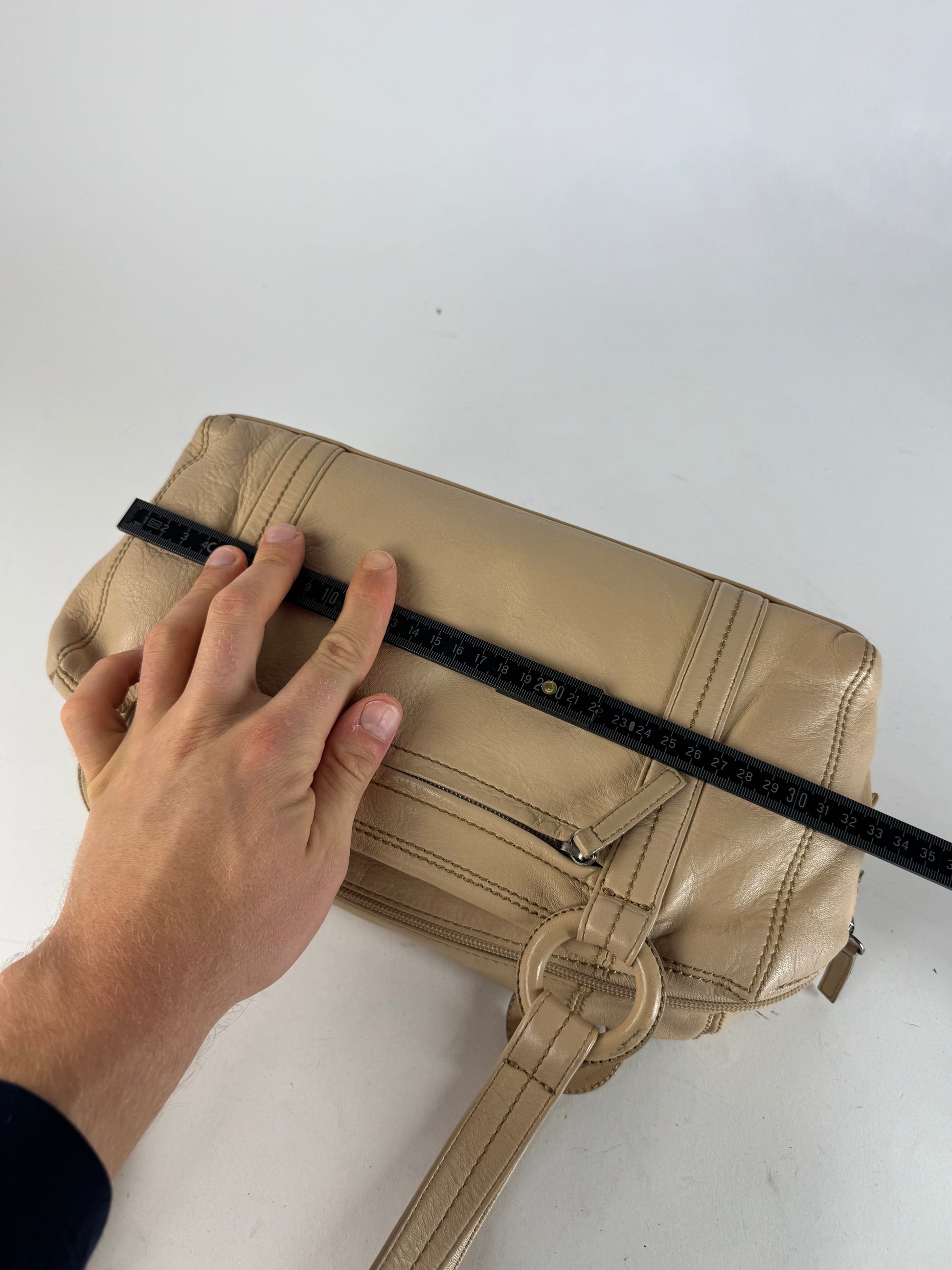 This elegant vintage bowling bag is crafted from smooth cream-coloured leather and features a clean, architectural silhouette characteristic of Issey Miyake’s design language. The bag includes a practical front zipper pocket and opens to a brown polyester interior with three compartments, offering both structure and functionality. Likely made in Japan, this piece reflects the brand’s refined approach to form and utility.
