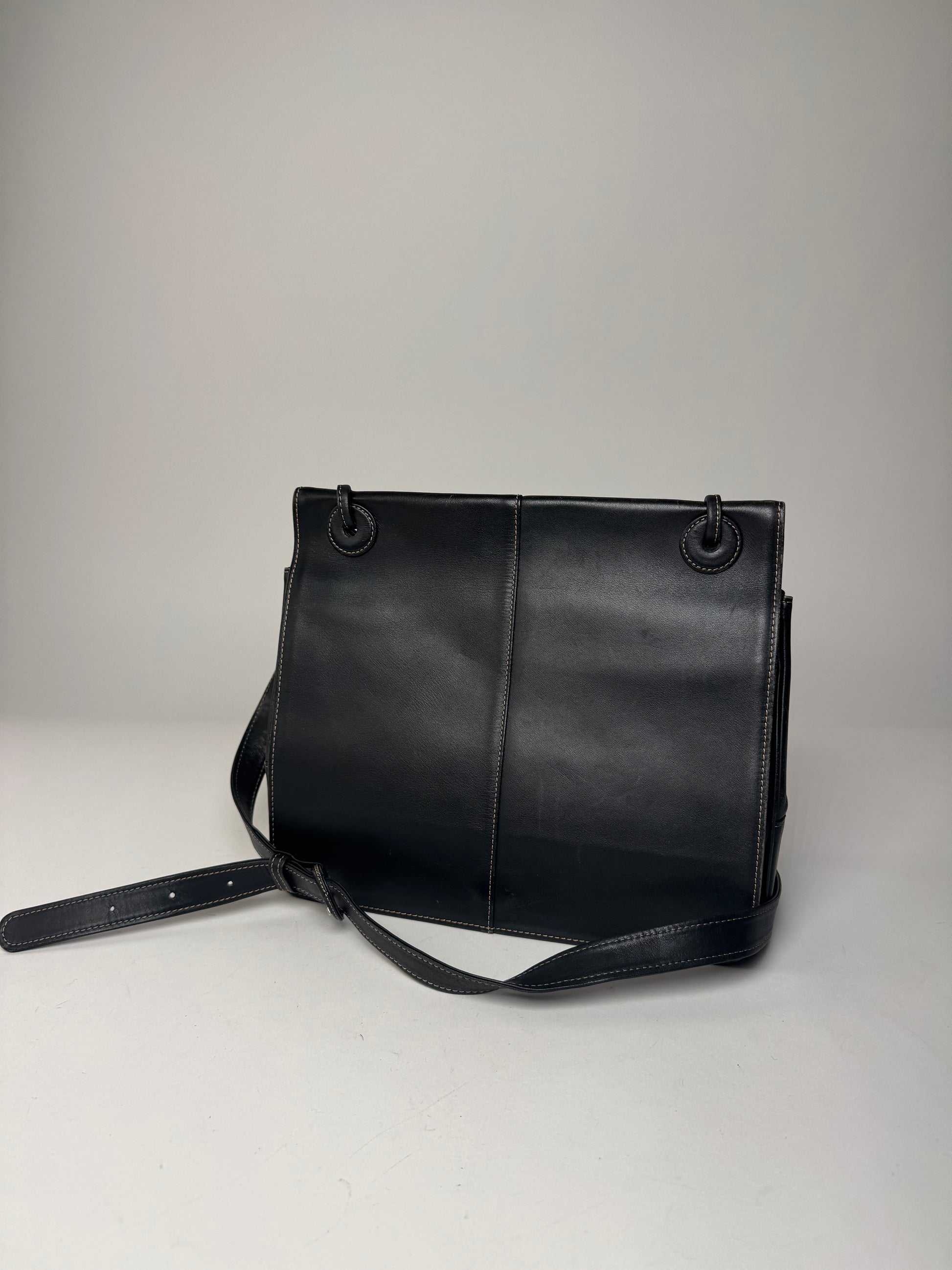 ISSEY MIYAKE Vintage Multi-Wear Bag. This versatile vintage bag is finely crafted of black and navy leather. The design features an adjustable shoulder strap allowing multiple wearing options. The bag is finished with anthracite-tone steel hardware and a practical magnetic closure. The interior opens to a navy canvas lining.