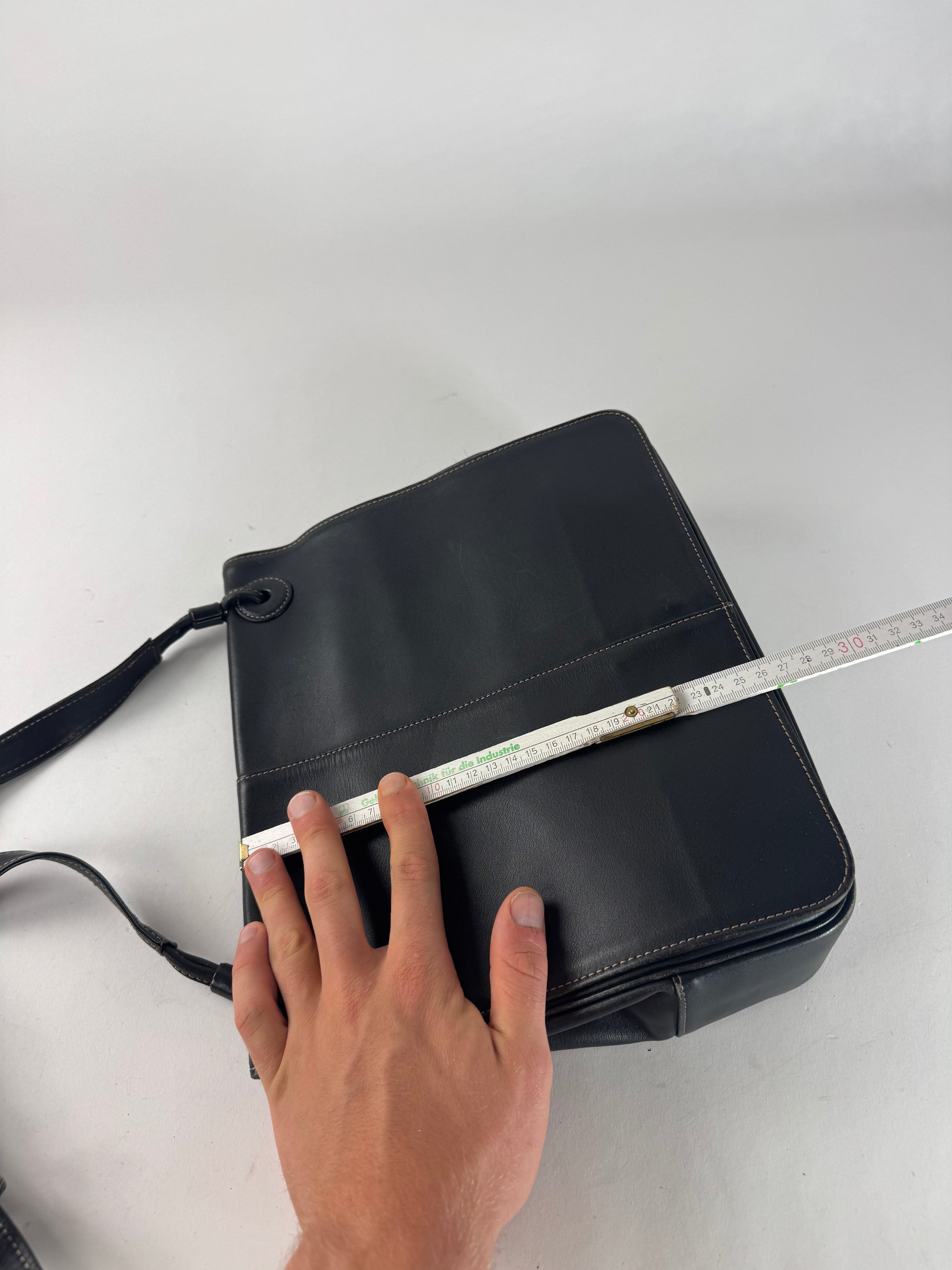 Condition Details: The exterior leather is generally well preserved with a visible stain on the bottom. The adjustable shoulder strap is intact and functional. The anthracite-tone steel hardware is clean with light signs of use. The navy canvas interior is in good condition.