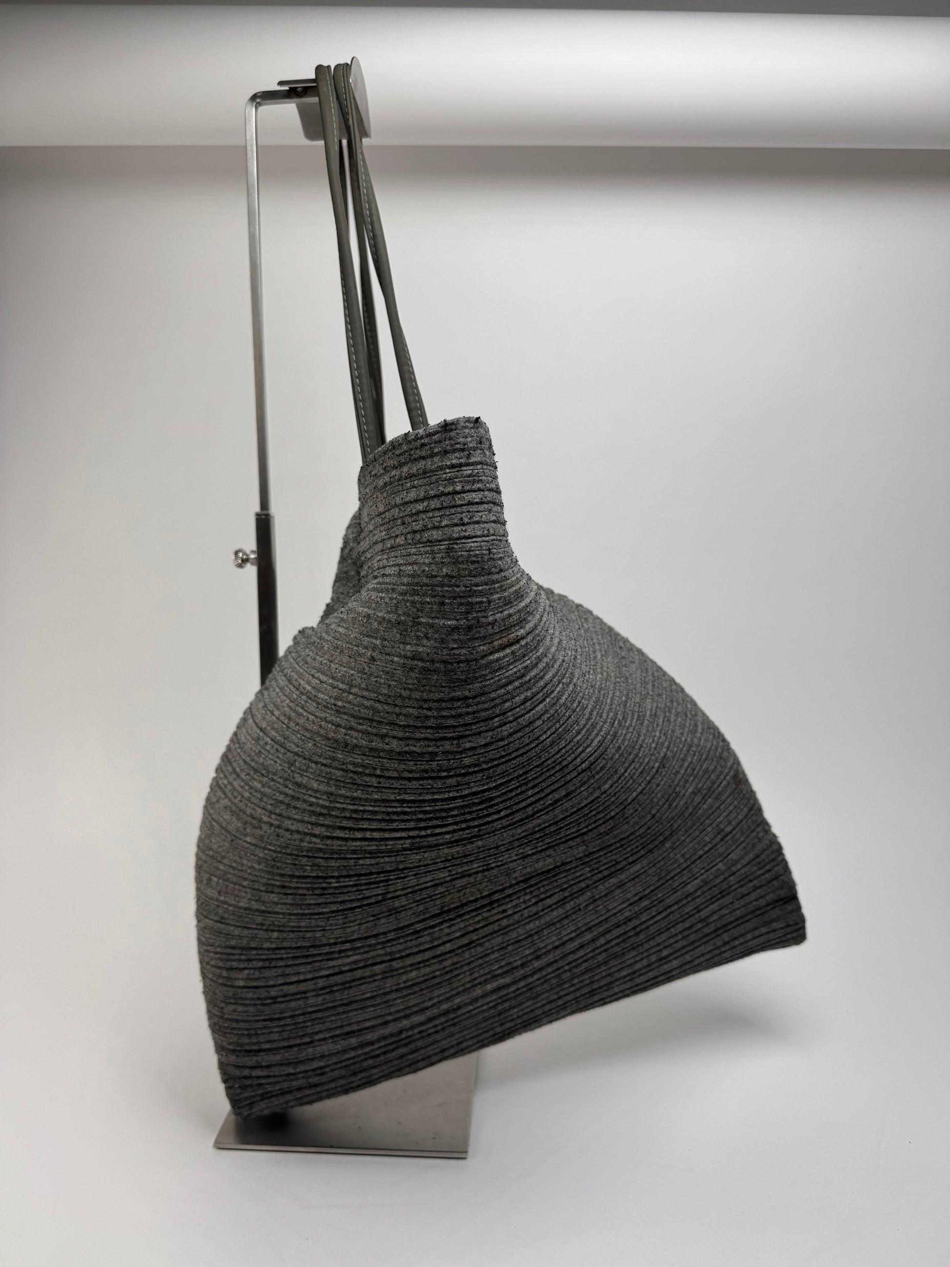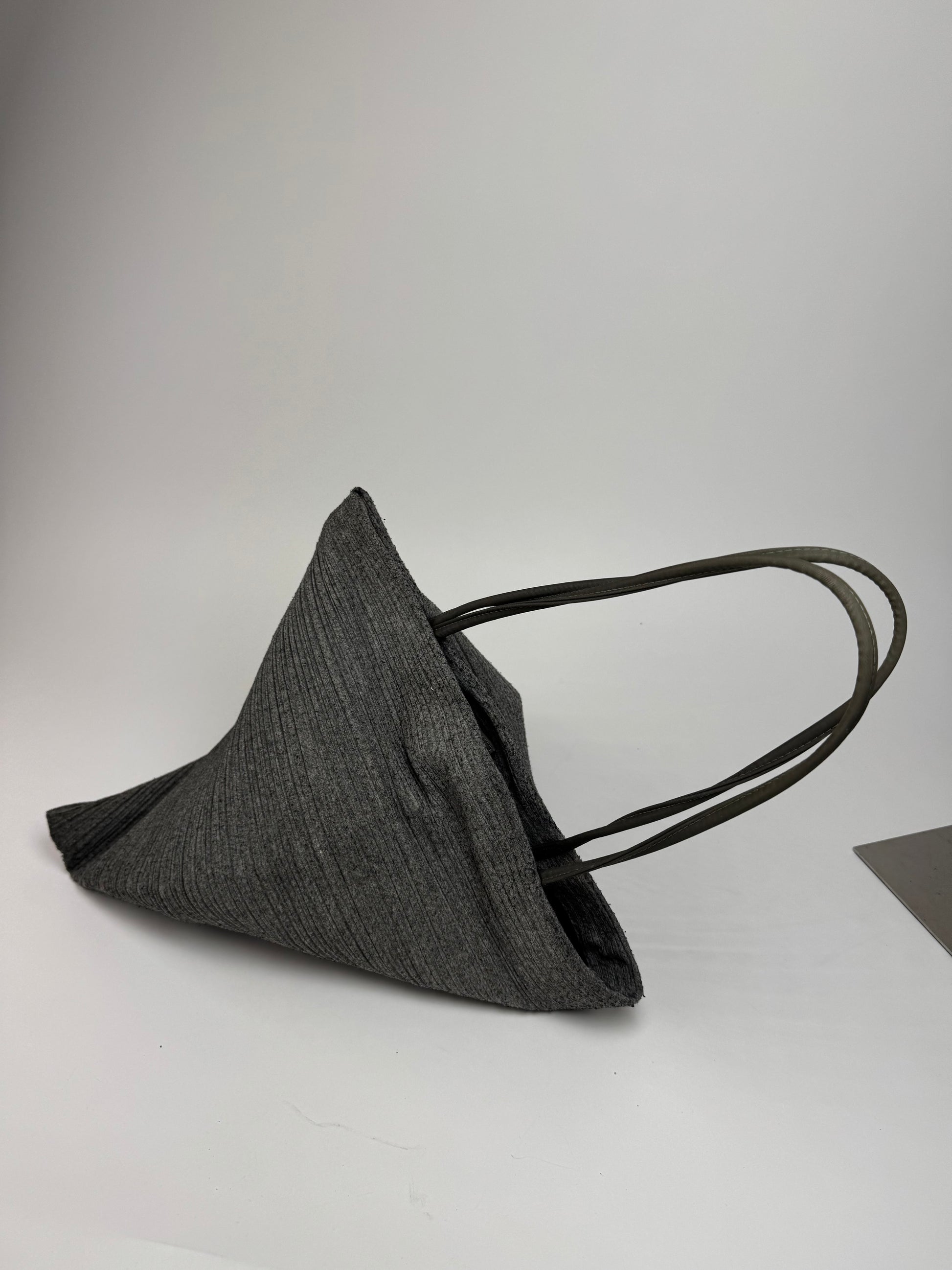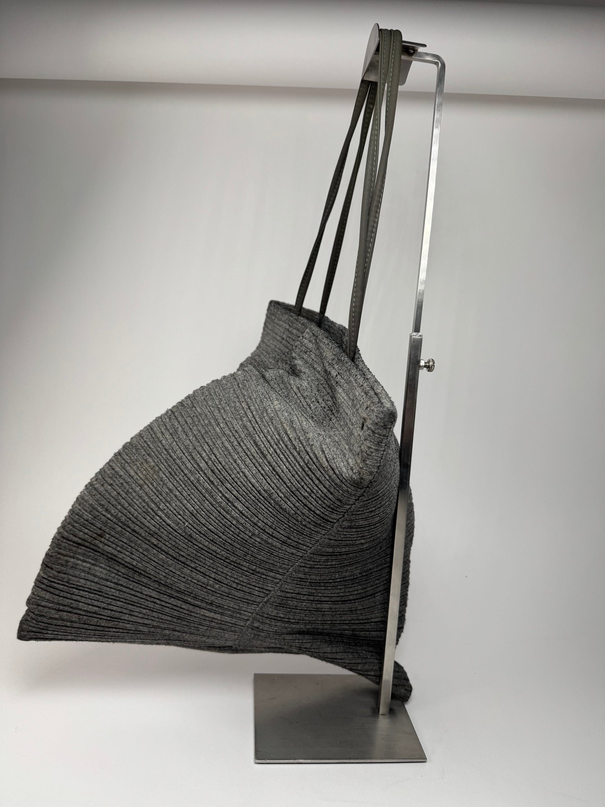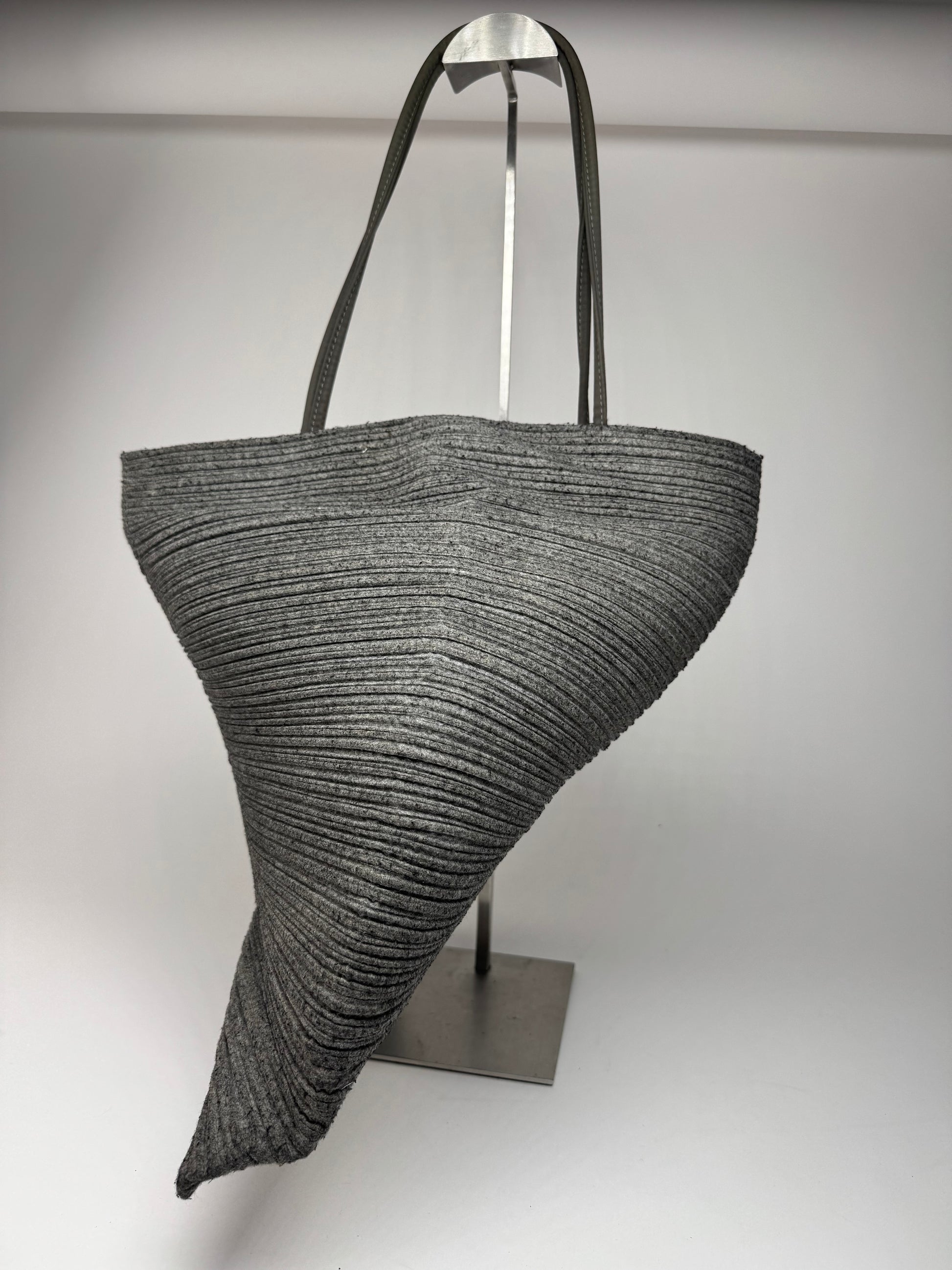PLEATS PLEASE ISSEY MIYAKE Wool Pleated Shopper Bag. This chic handbag is finely crafted of signature pleated wool fabric. The bag features asymmetrical shaping, rubberized leather handles, and a magnetic snap closure. The interior is lined with black polyester fabric.