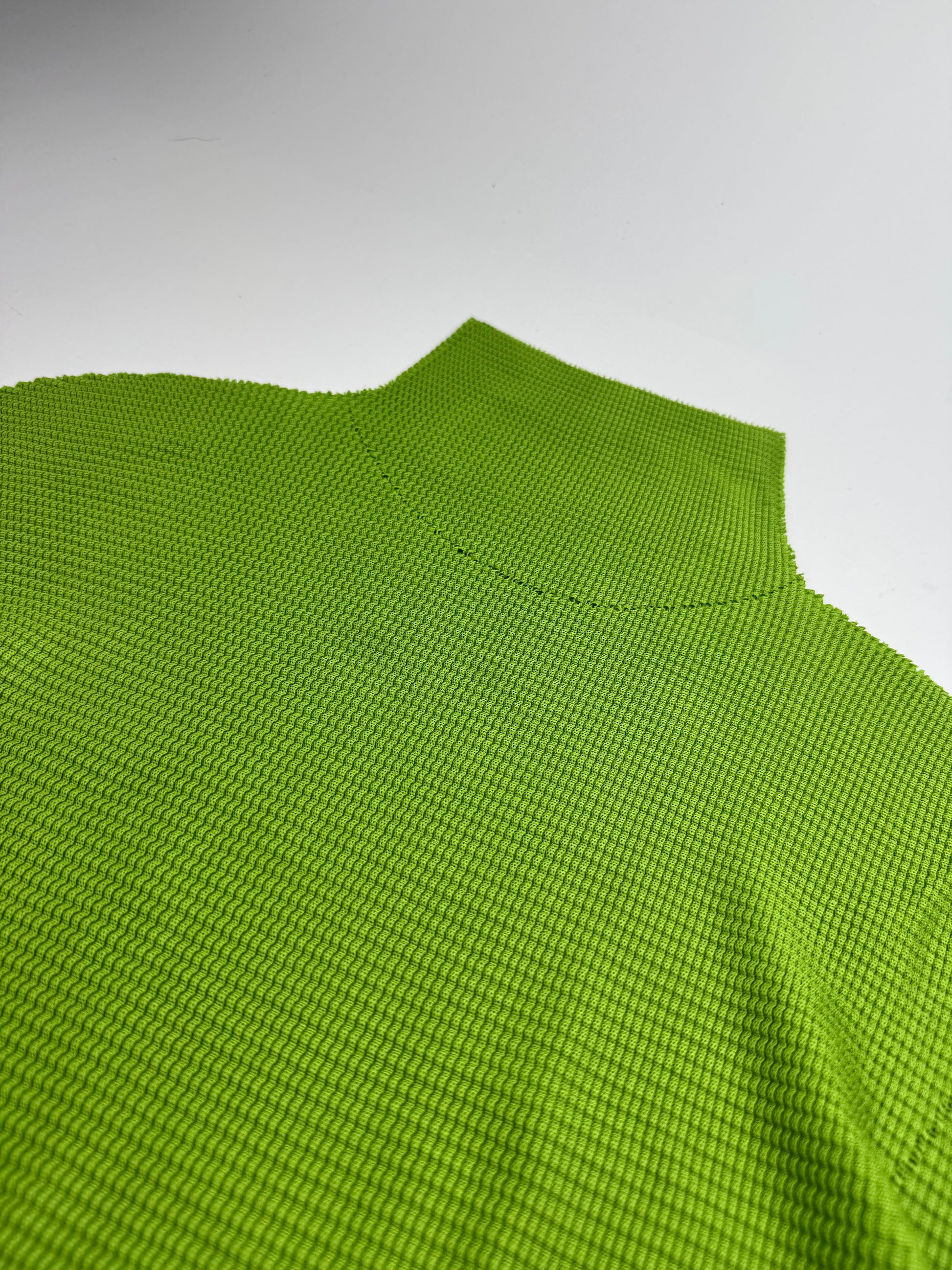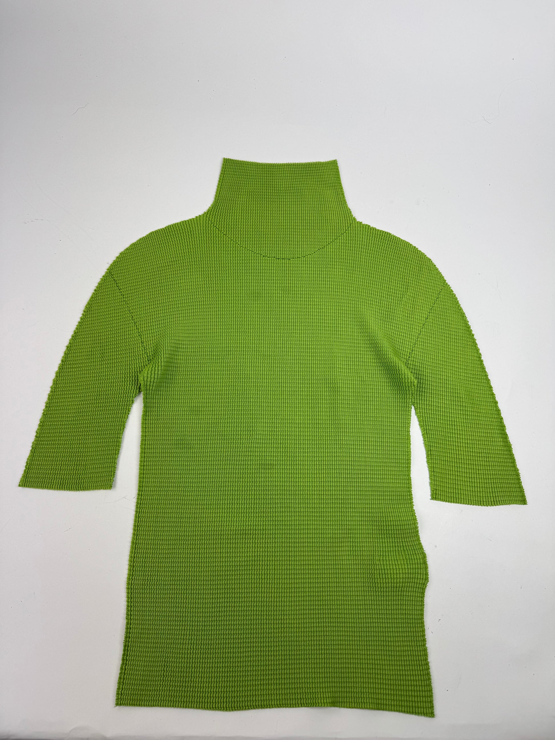This vintage Issey Miyake turtleneck top is a striking piece, crafted in vibrant neon green pleated fabric. Issey Miyake's signature pleats are made from a high-quality polyester blend, designed for flexibility, breathability, and durability. The structured yet lightweight material ensures a comfortable fit while maintaining its unique shape.