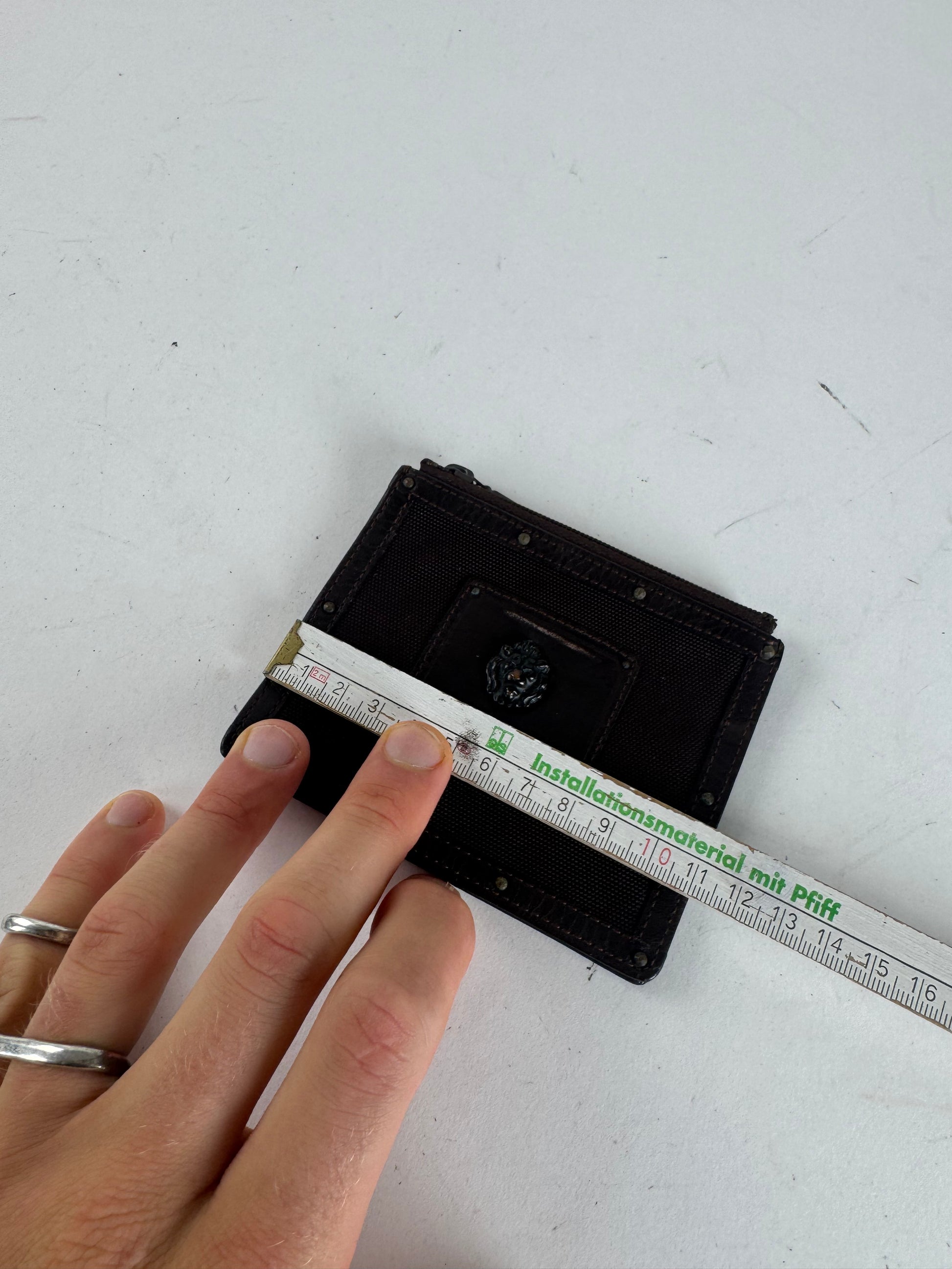 JEAN PAUL GAULTIER Vintage Card Holder. This striking card holder is finely crafted of purple canvas with matching purple leather trim. The front is decorated with an anthracite steel lion appliqué and multiple bronze-tone stud details, adding a bold signature look.