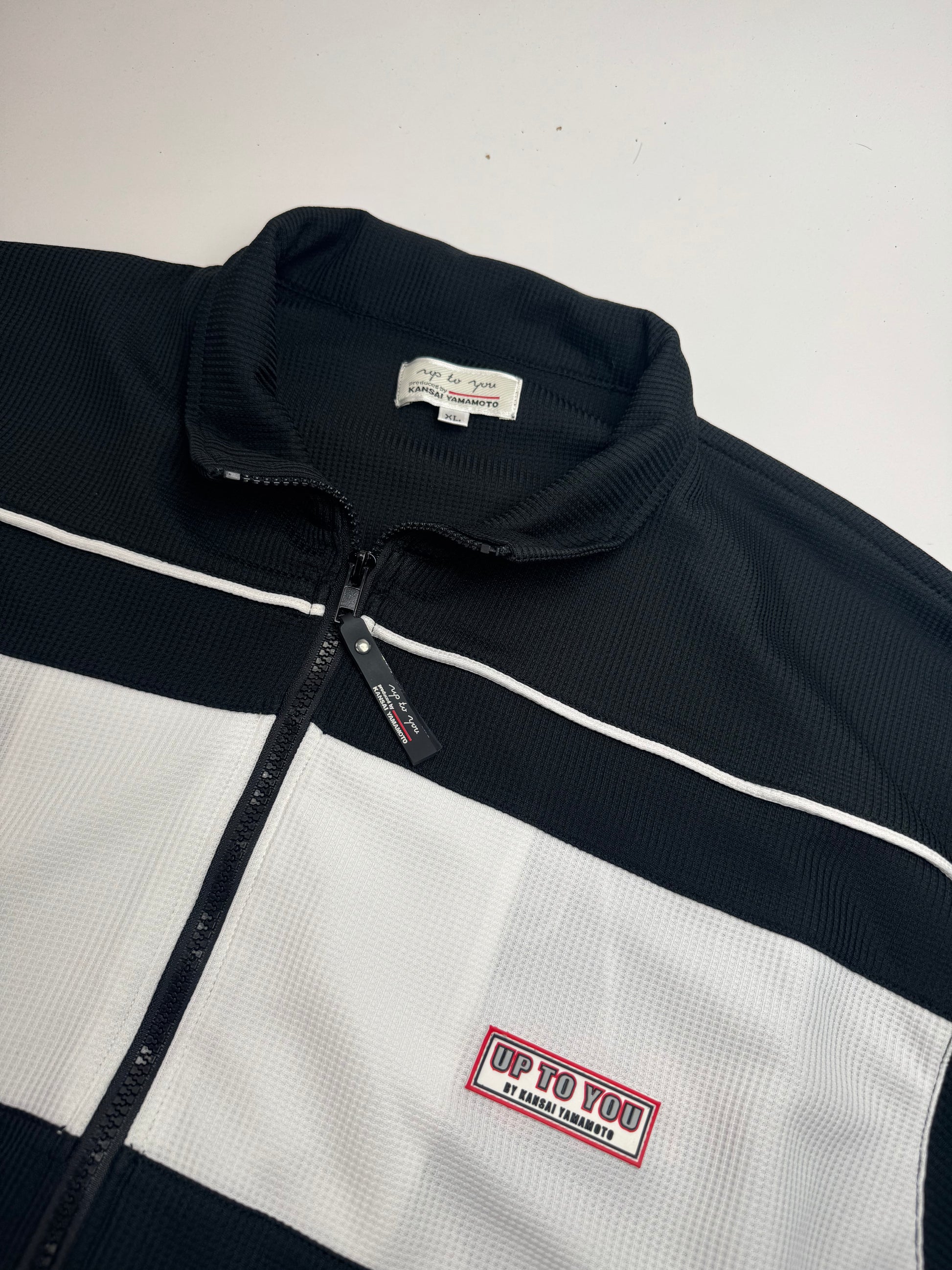 This striking vintage men's short-sleeve jacket by Kansai Yamamoto is crafted from black and white polyester. It features a front zipper embossed with “Up to You” and a matching “Up to You by Kansai Yamamoto” patch on the front. The back showcases a bold PVC print, reflecting the designer's signature avant-garde style.