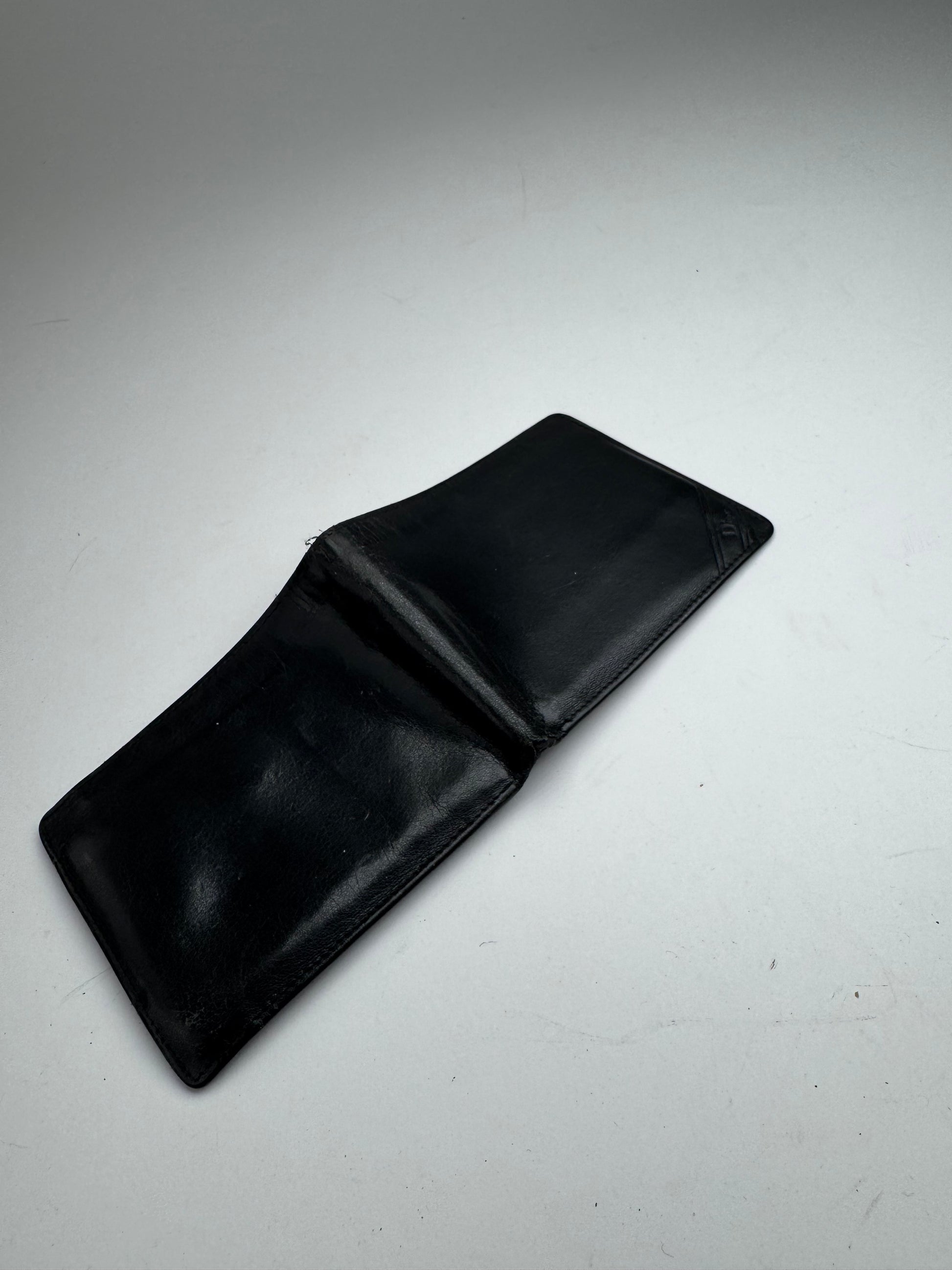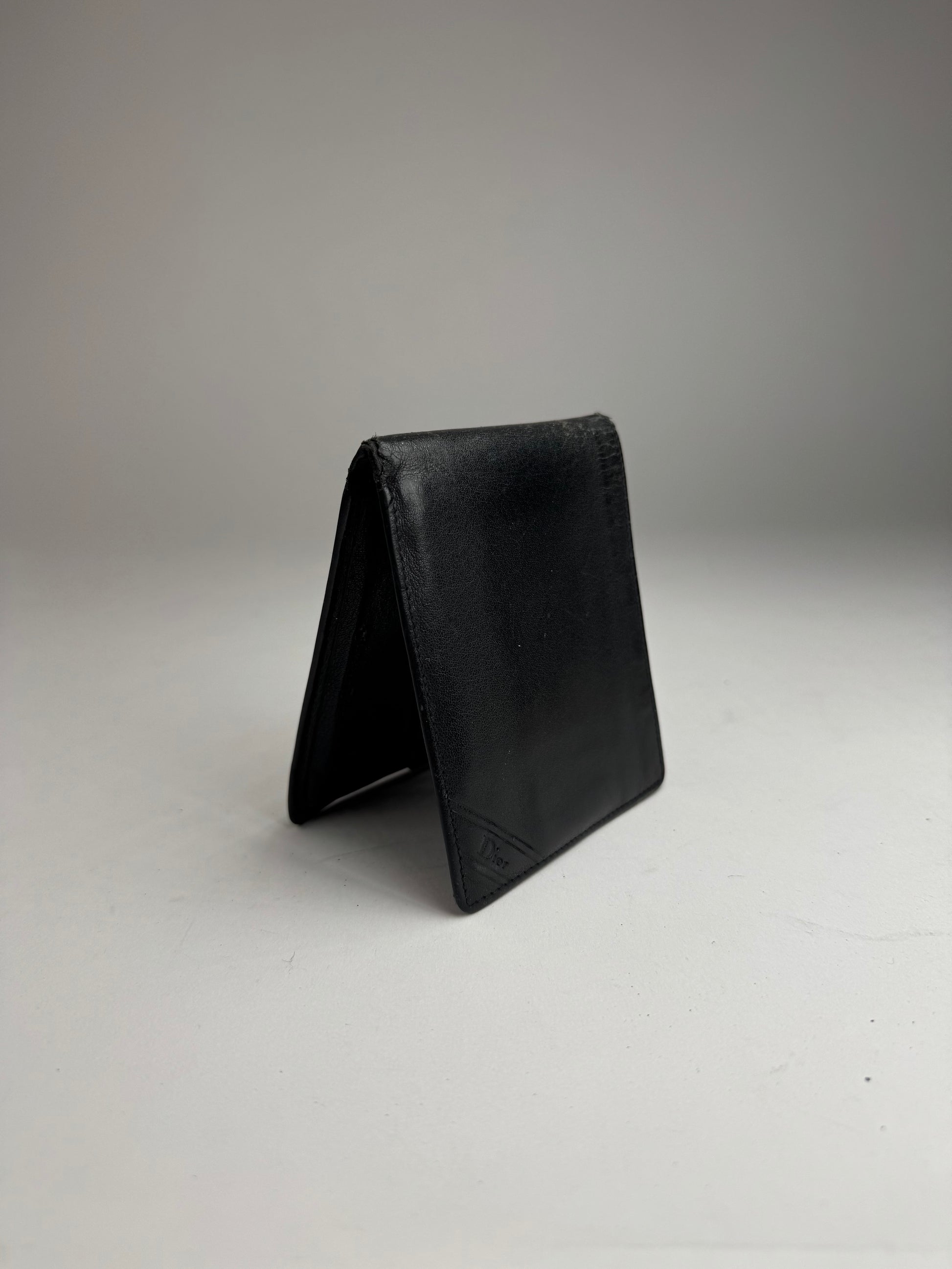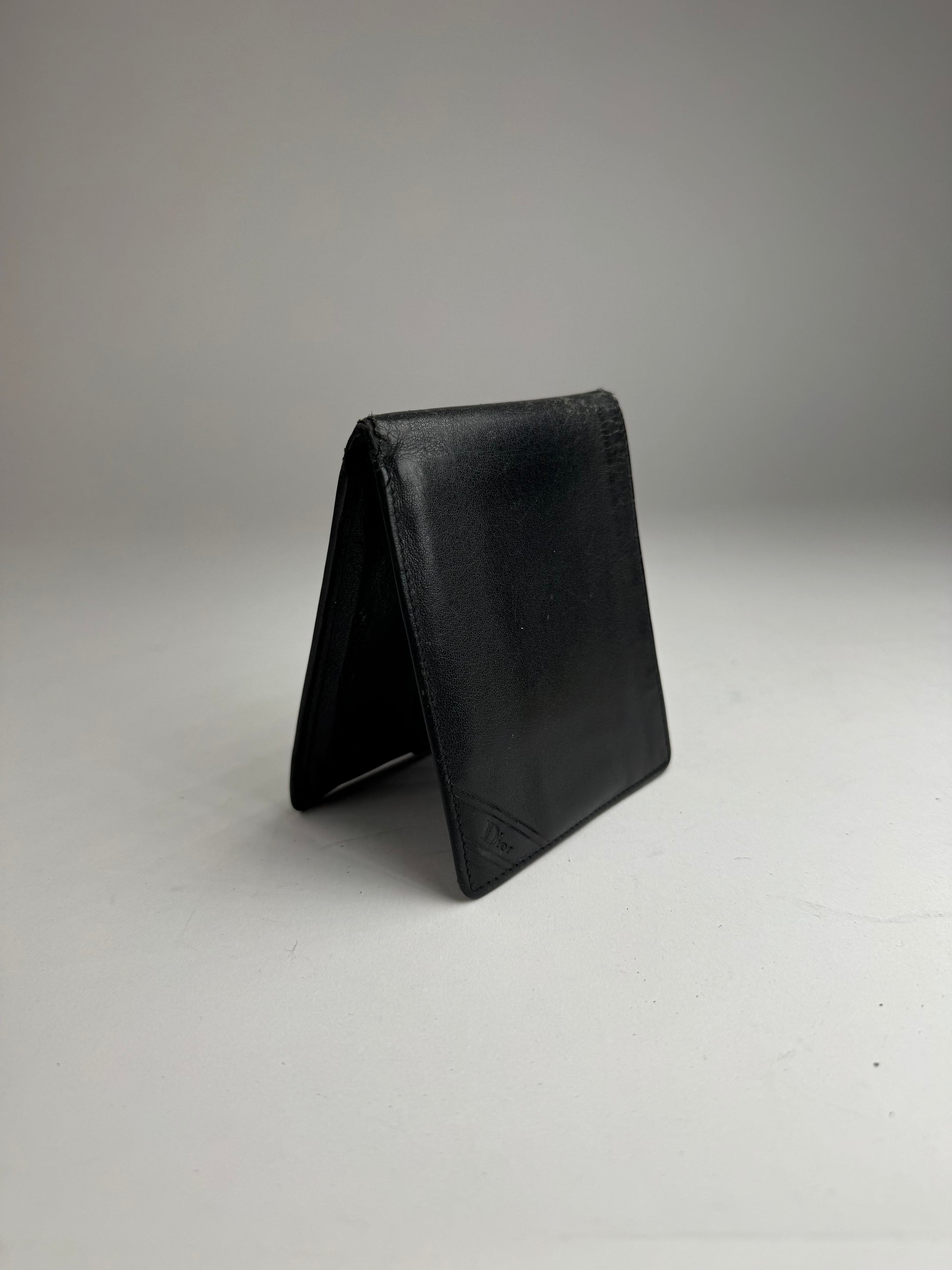 DIOR Black Leather Foldable Wallet. This sophisticated wallet is crafted from smooth black leather with a foldable design. The front features an engraved Dior logo, and the interior is finished in matching black leather. Inside, it offers compartments for coins, bills, and cards.