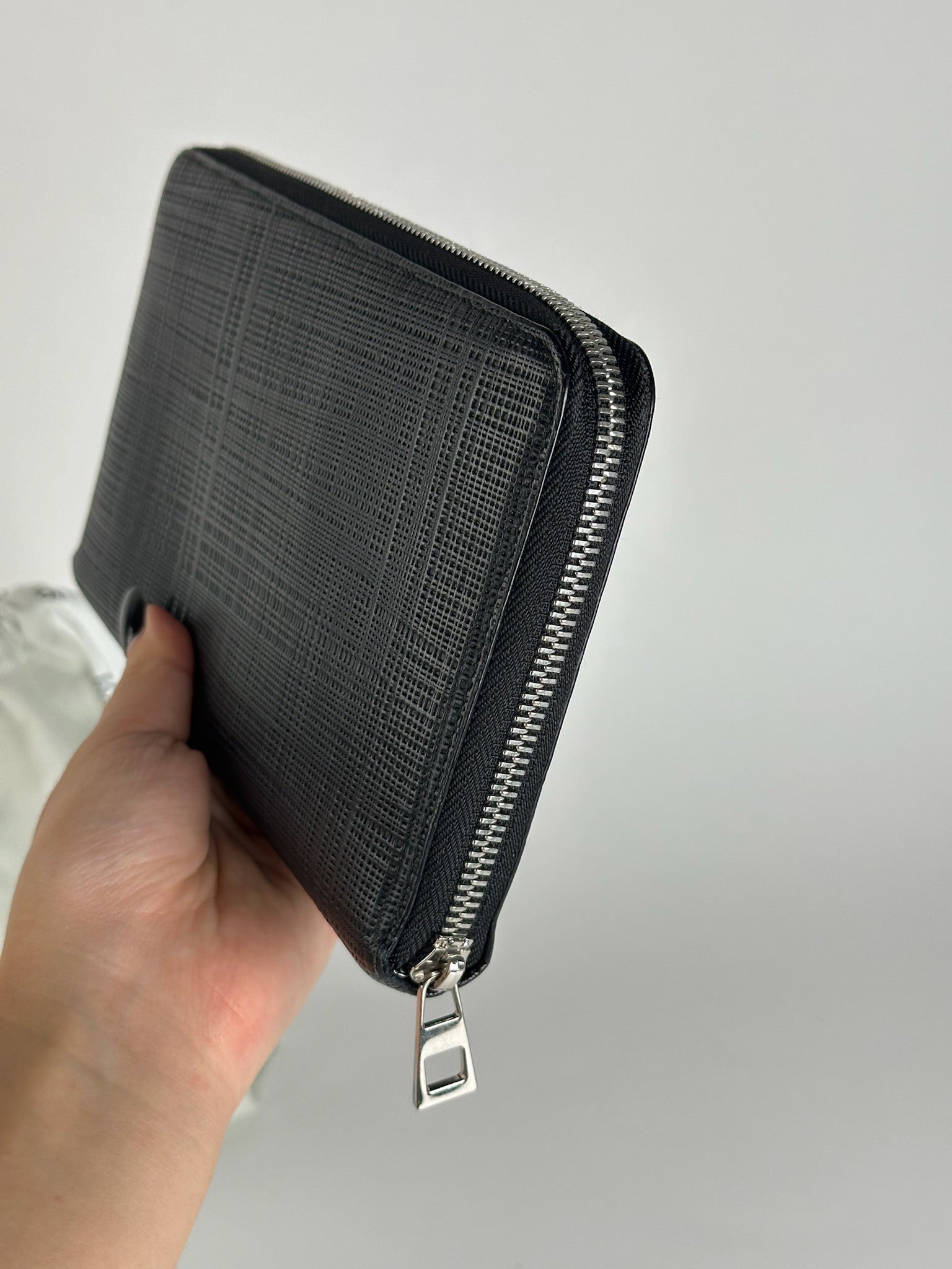 This refined wallet is crafted in black leather with an asymmetric checkered pattern and features the Loewe Anagram logo embossed on the upper right corner. The Anagram, designed in 1970 by Spanish artist Vicente Vela, symbolizes Loewe's legacy of craftsmanship, elegance, and modernity. The wallet features a top zipper with silver-tone steel hardware and opens to a black leather interior.