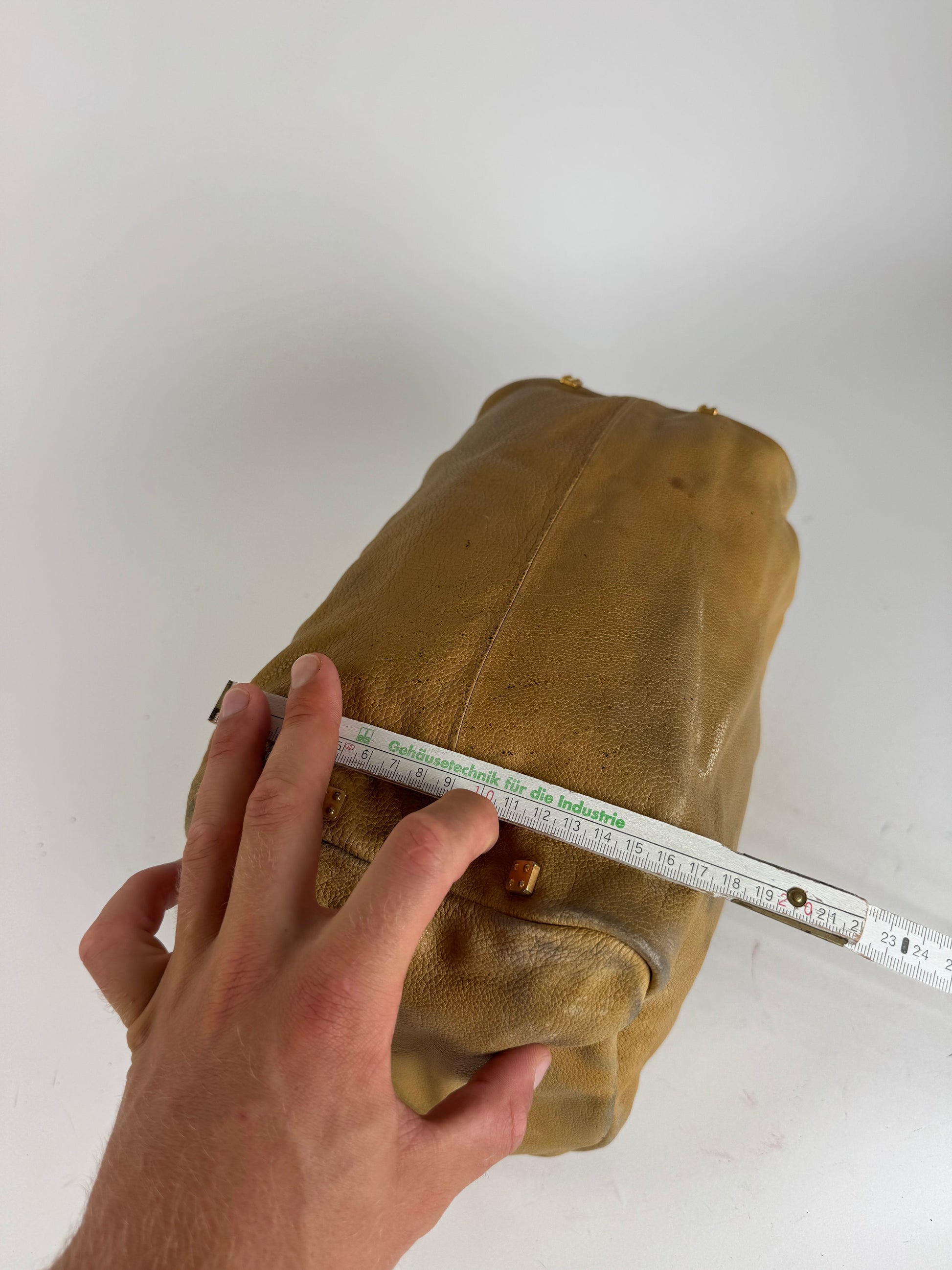 LOEWE MADRID Vintage Leather Handbag. This refined handbag is finely crafted of camel-colored leather with the Loewe anagram logo embossed on the front. It features brown leather handles, a top zipper closure, and gold-tone steel hardware.