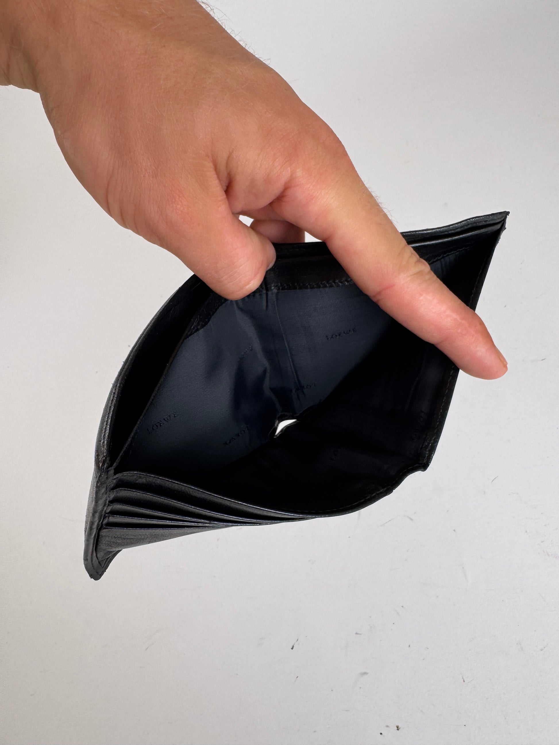 LOEWE MADRID Vintage Foldable Wallet. This classic foldable wallet is finely crafted of exceptionally soft black leather and features the embossed Loewe anagram logo on the front. The iconic logo, designed in 1970 by Spanish artist Vicente Vela, symbolizes the brand's heritage of craftsmanship and timeless elegance.